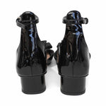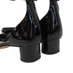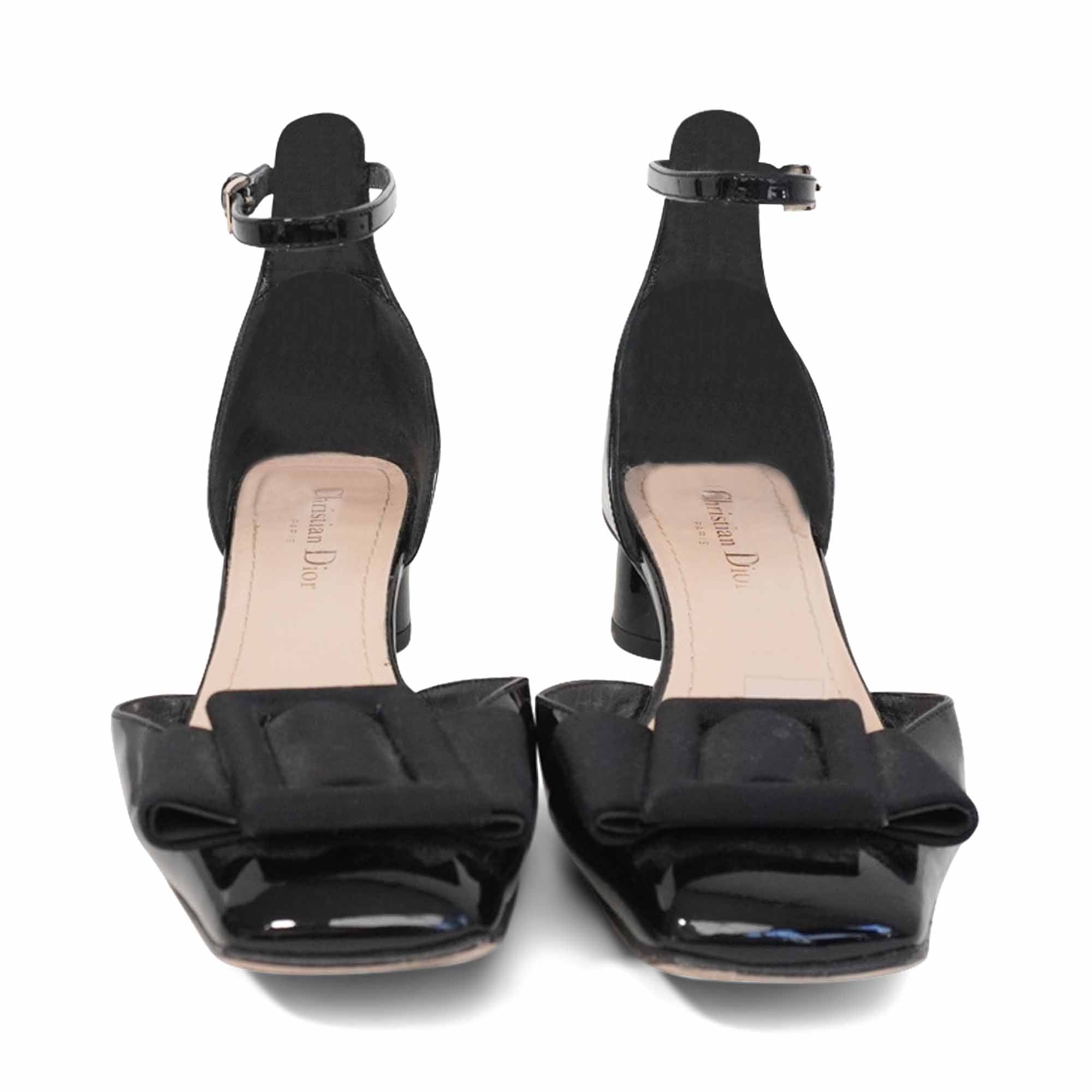 Christian Dior 'Idylle' square toe pumps in black patent leather with ankle strap, large ribbon bow on the upper and block heel.