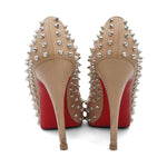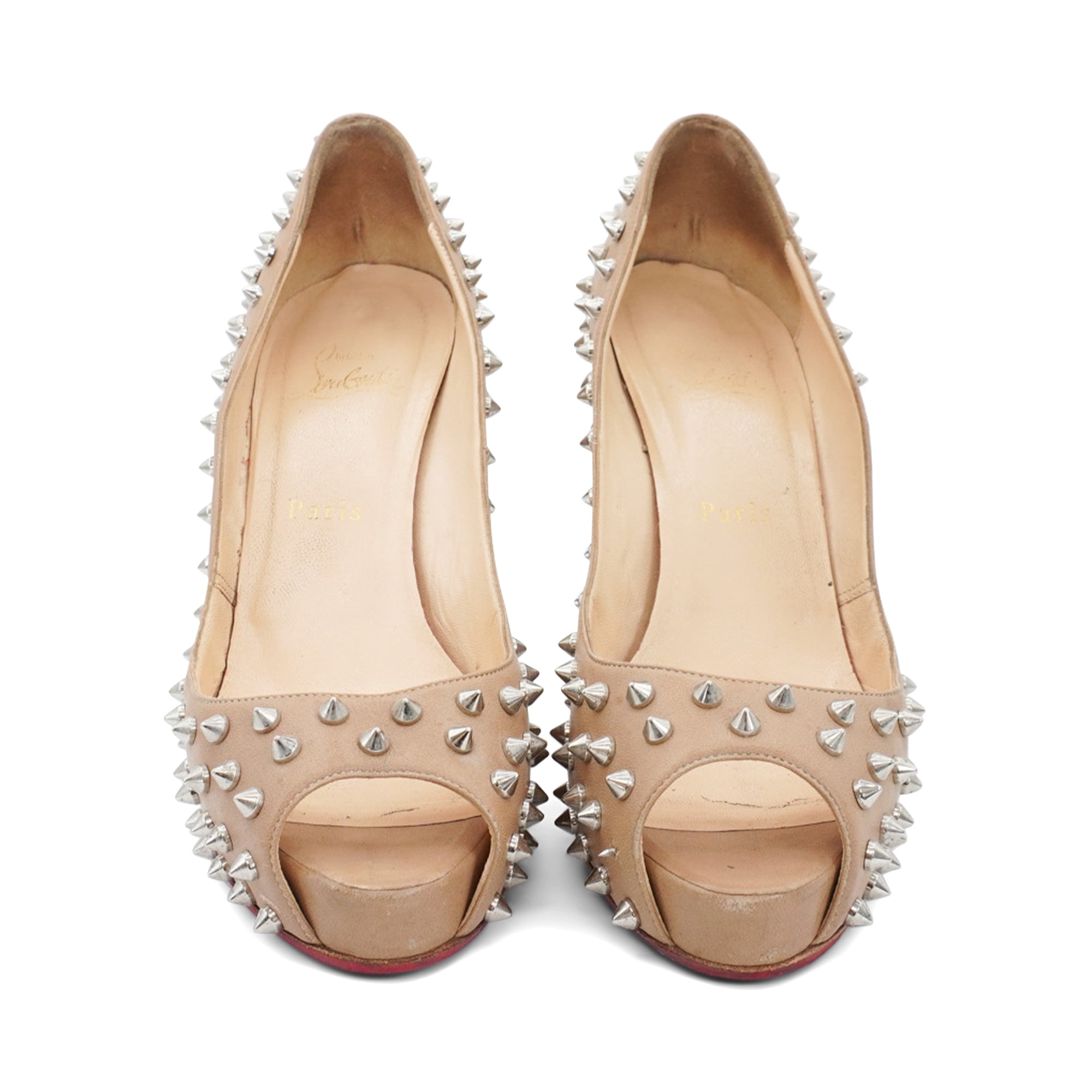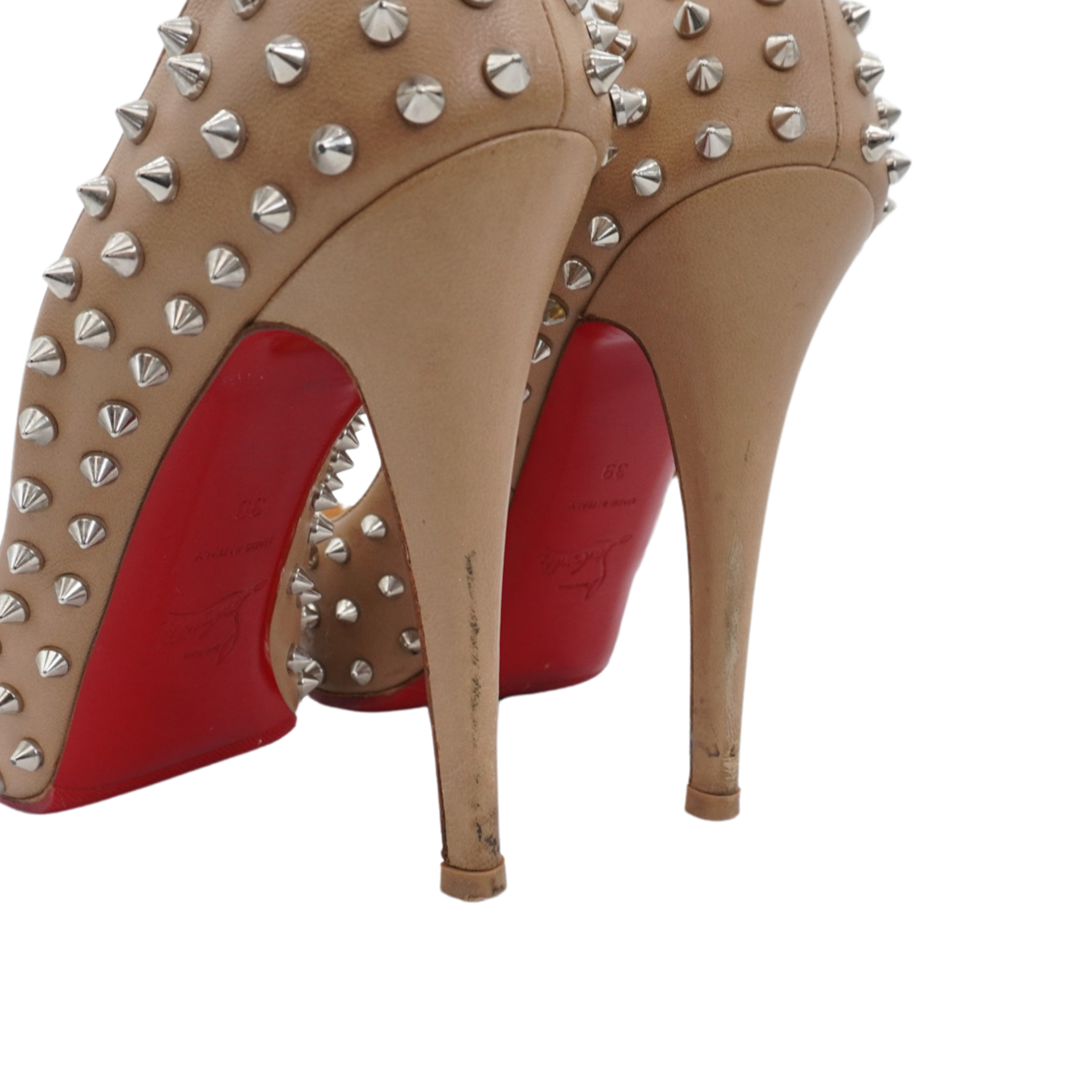 Christian Louboutin 'Ariella' peep toe heels in nude leather with all-over silver spikes and a small platform.