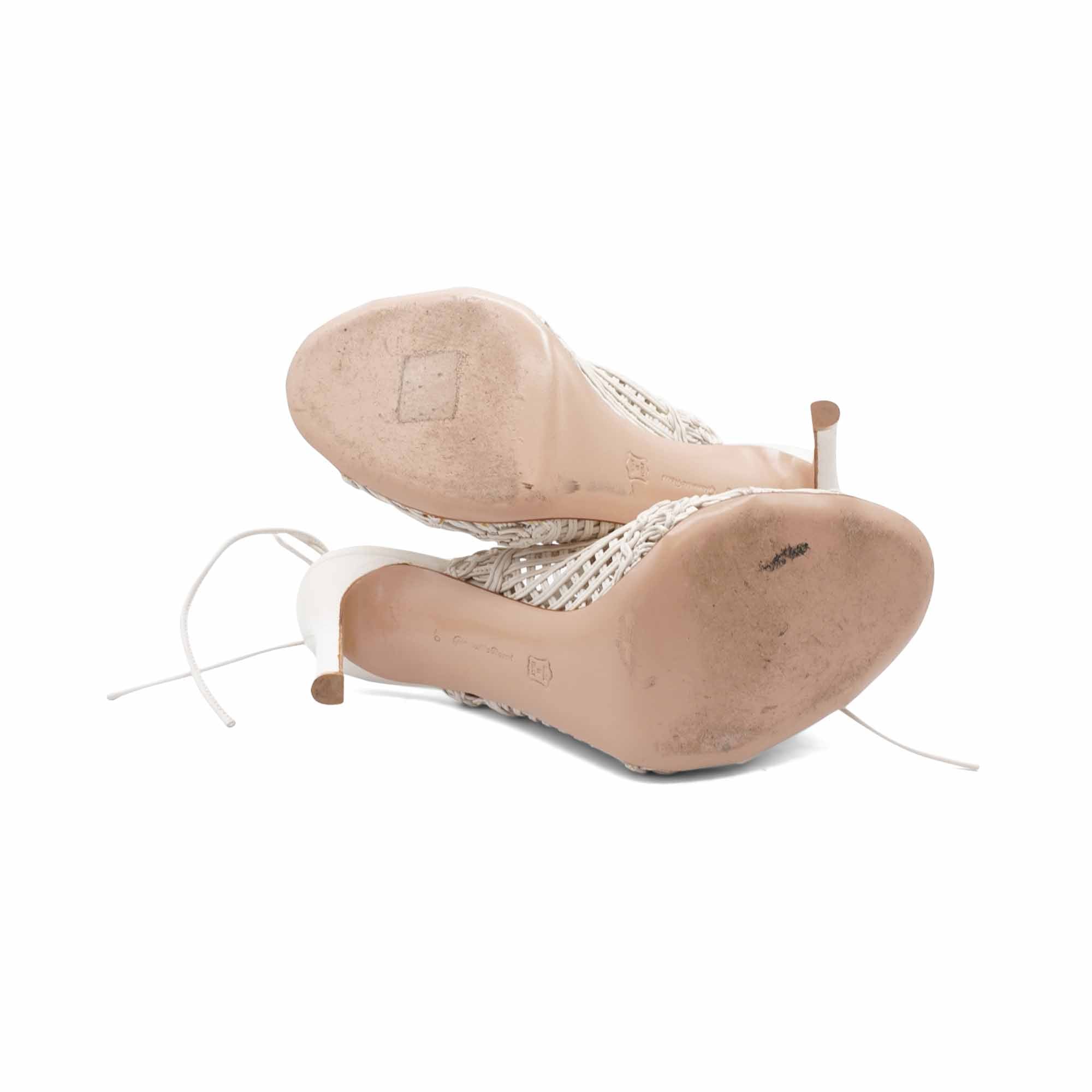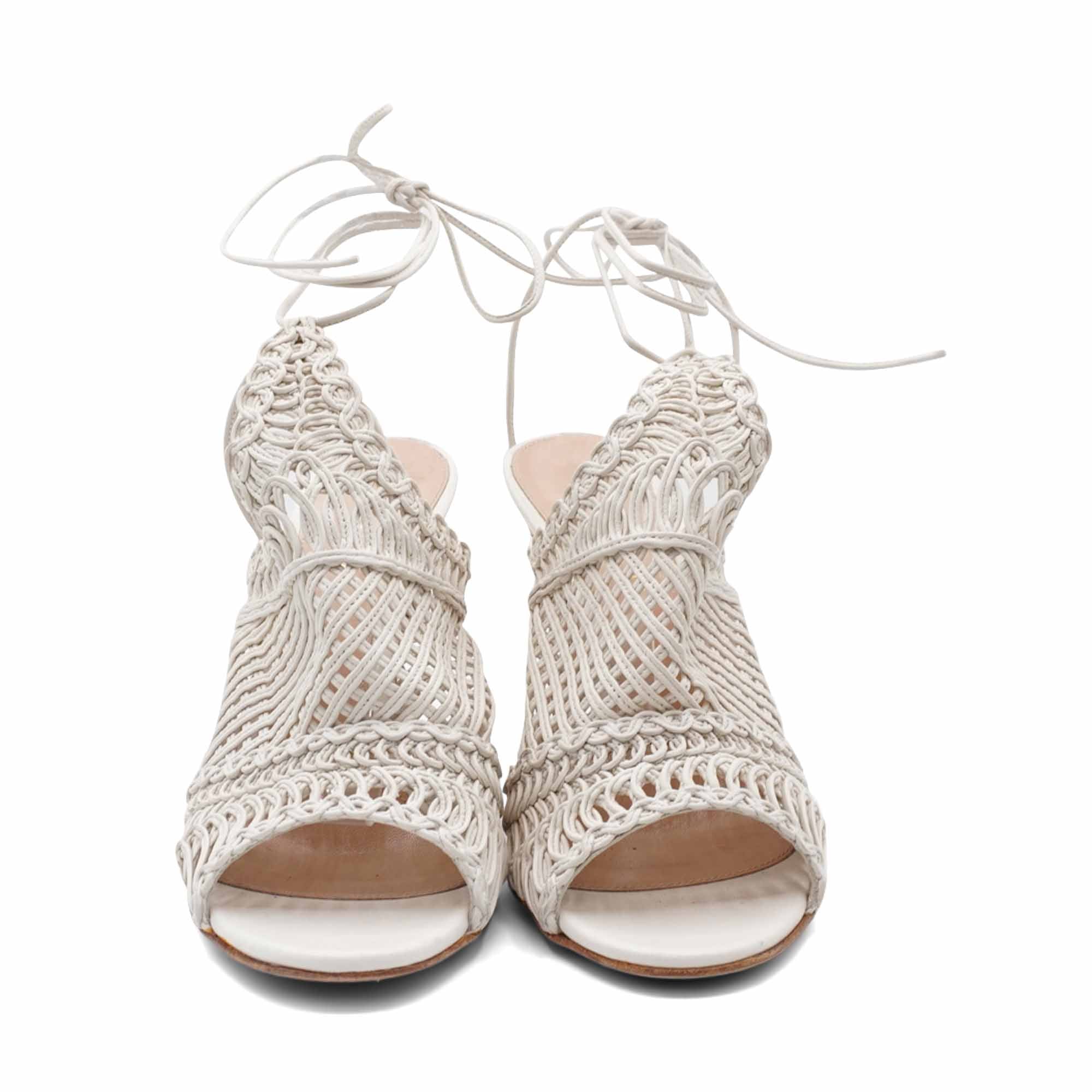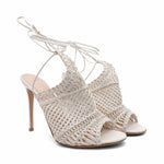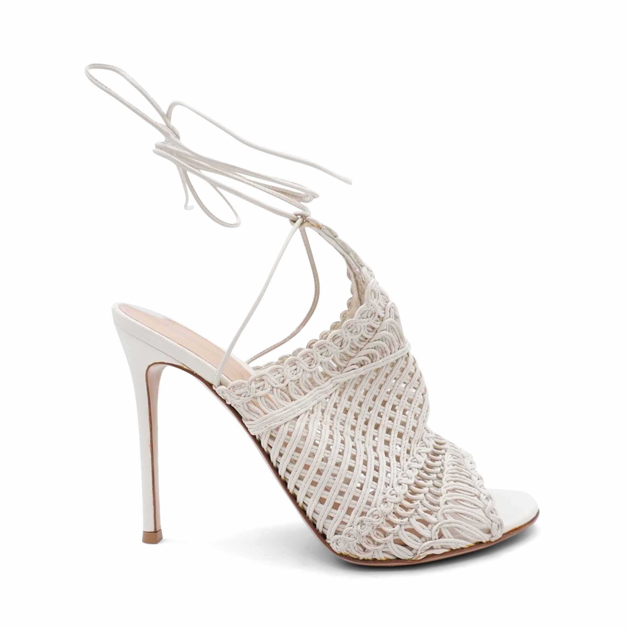 Gianvito Rossi 'Allyson' sandals in white leather with a woven net design, ankle ties, and an open toe.
