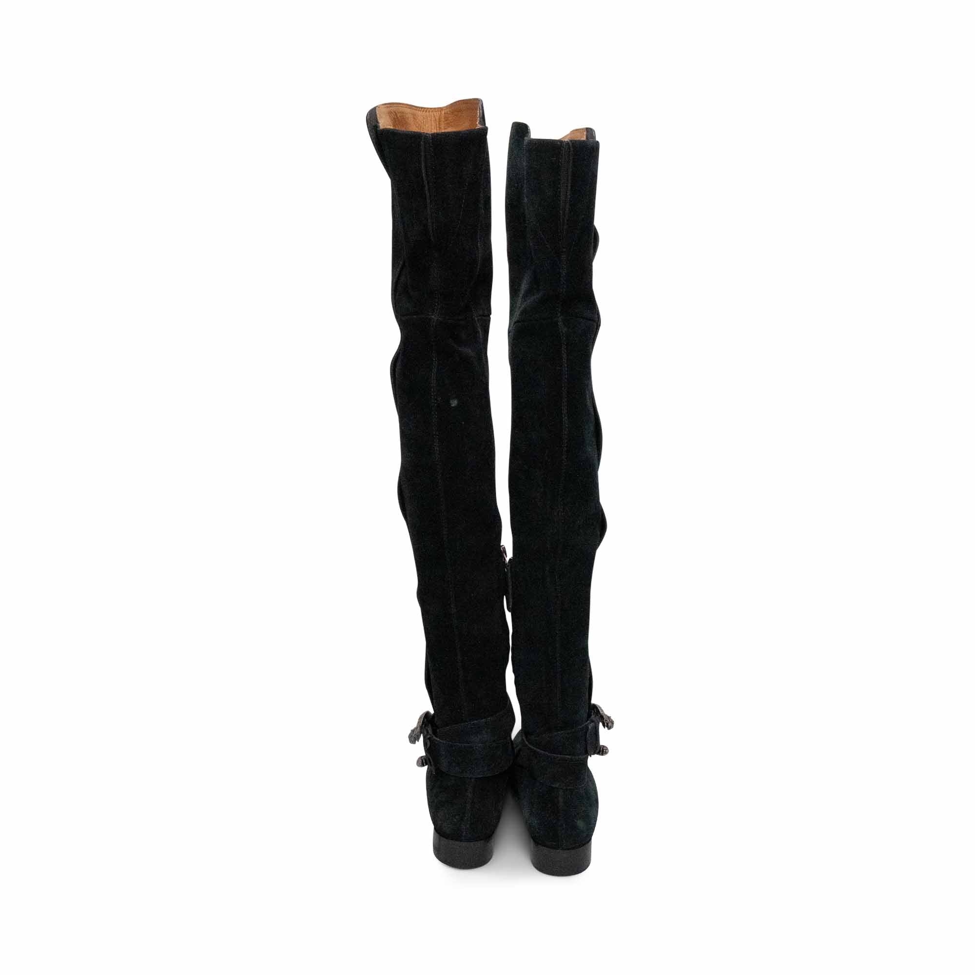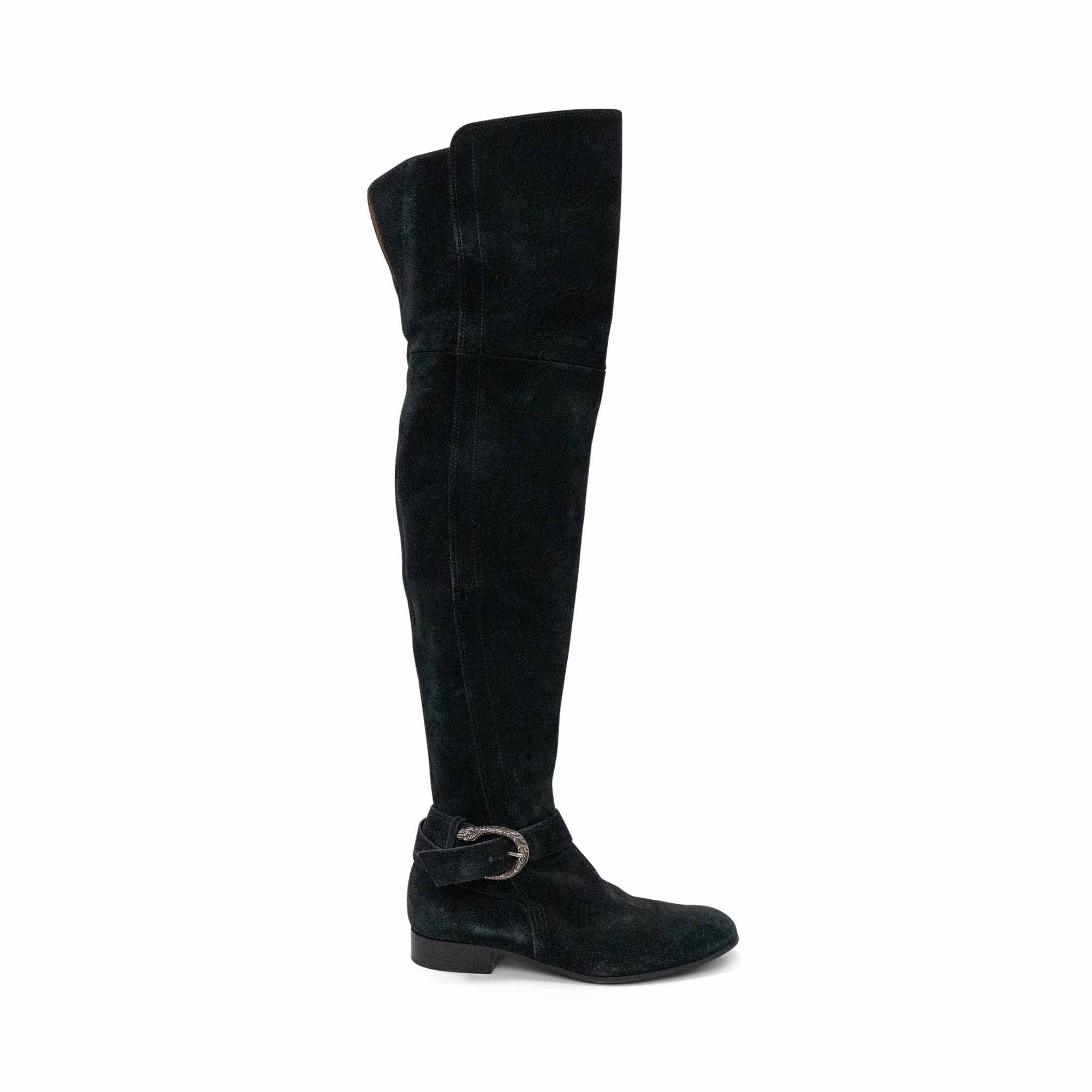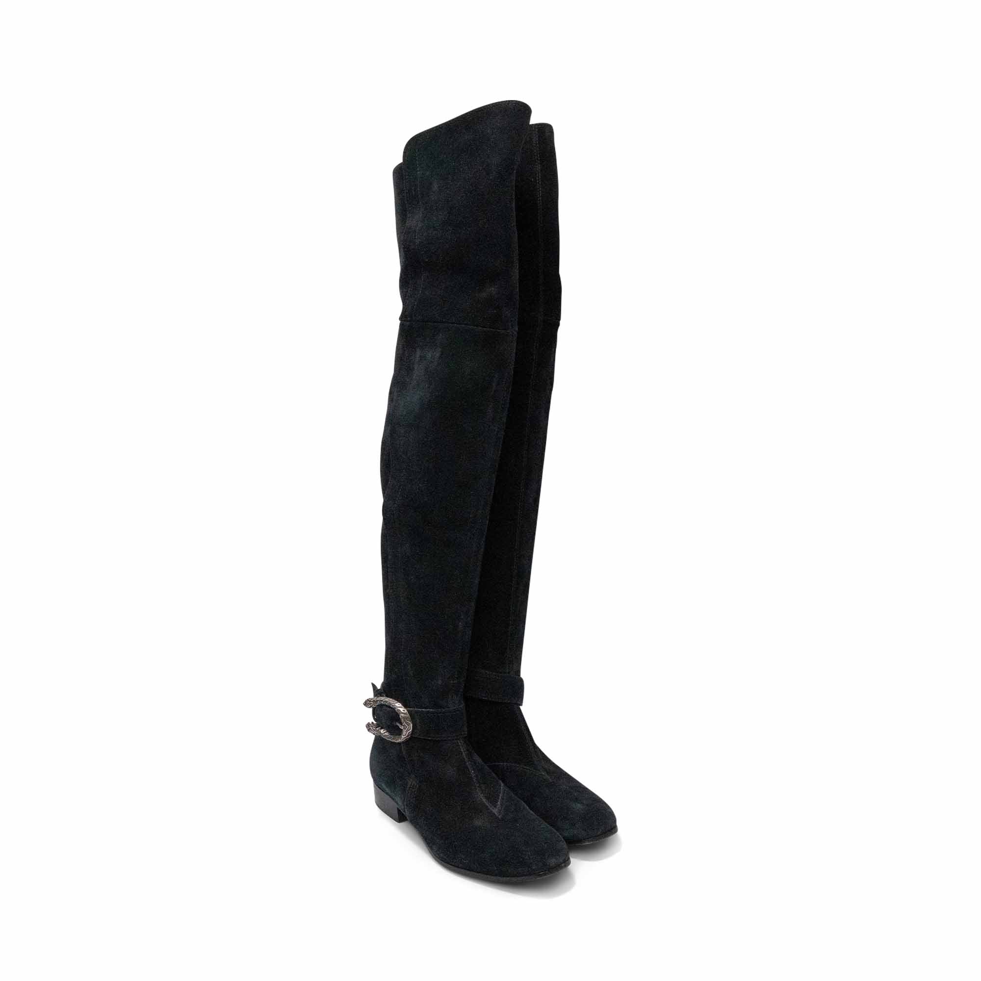 Gucci 'Dionysus' over-the-knee boots in black suede. Features an almond toe, a strap around the ankle with silver 'dionysus' tiger buckle, a half zip on inner side, and an elasticized panel in the back.