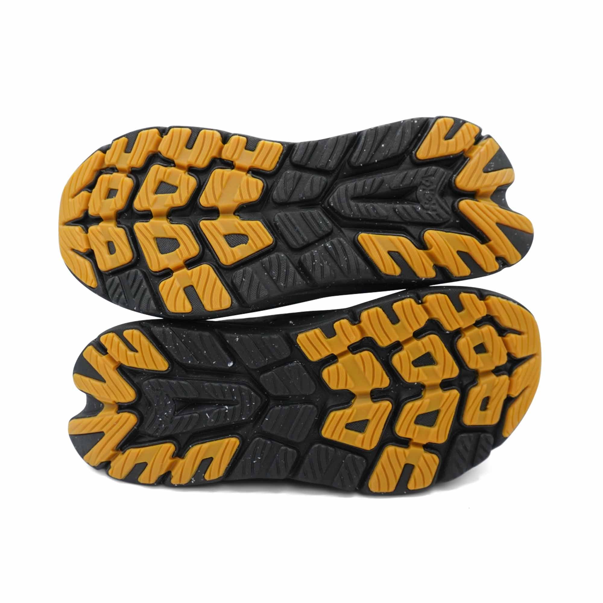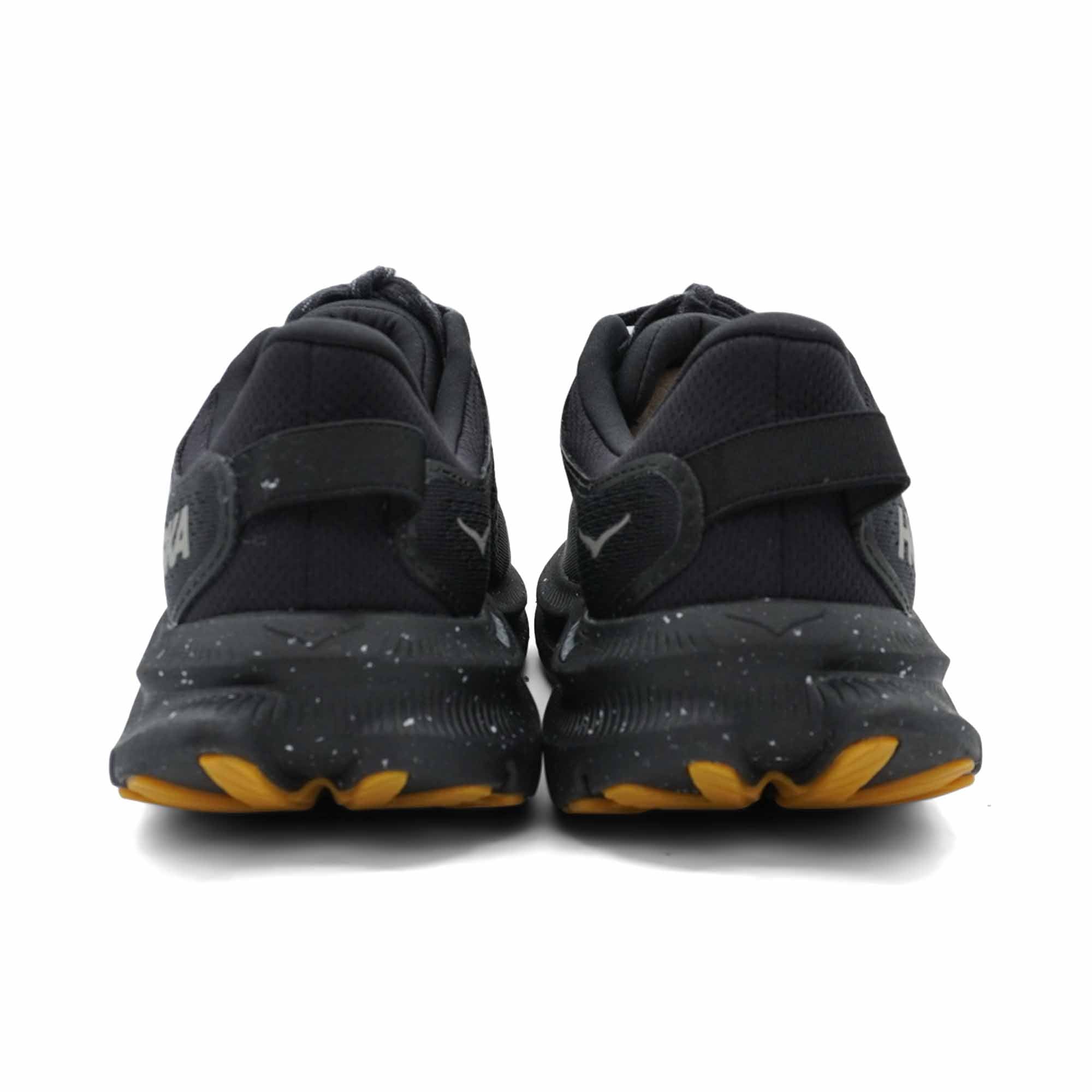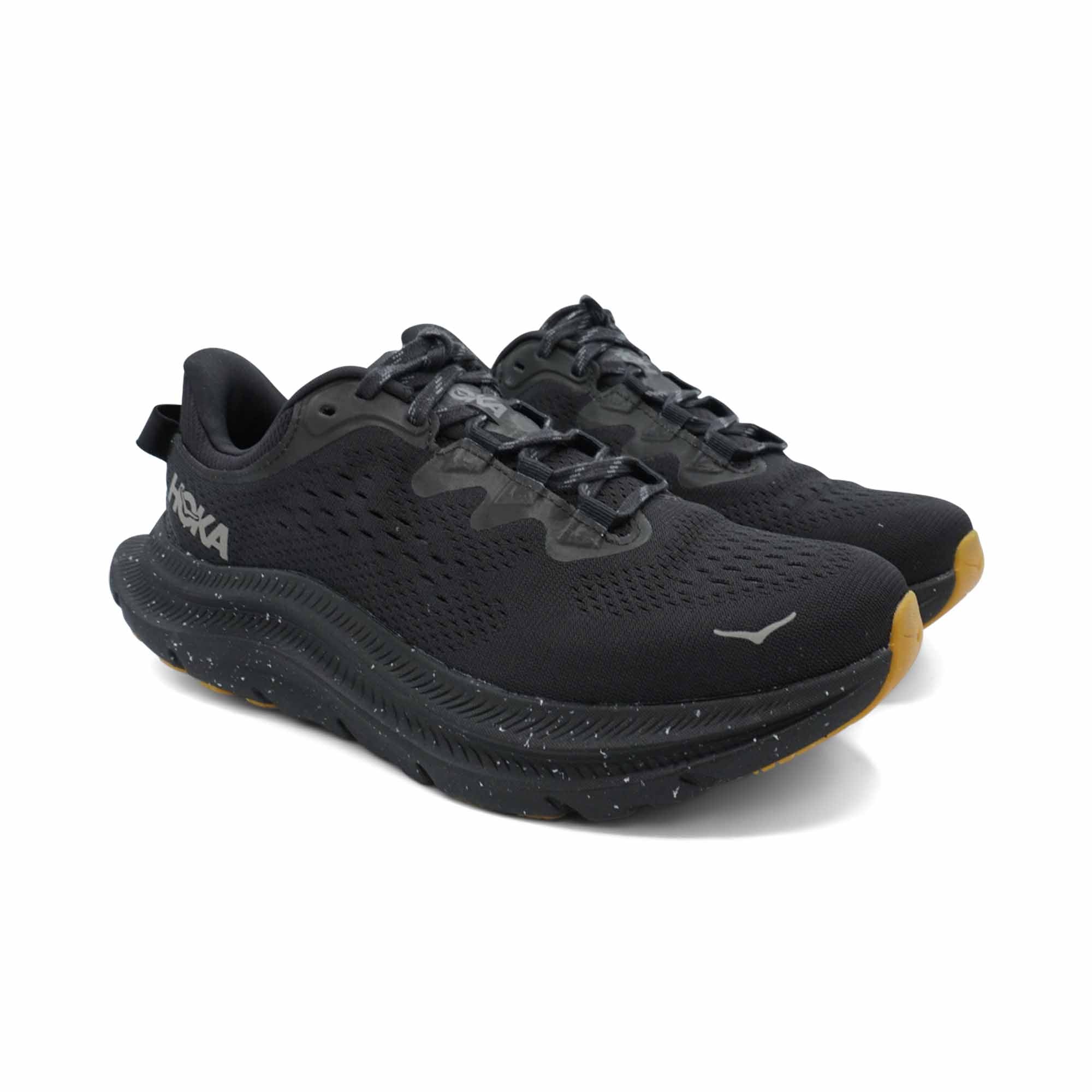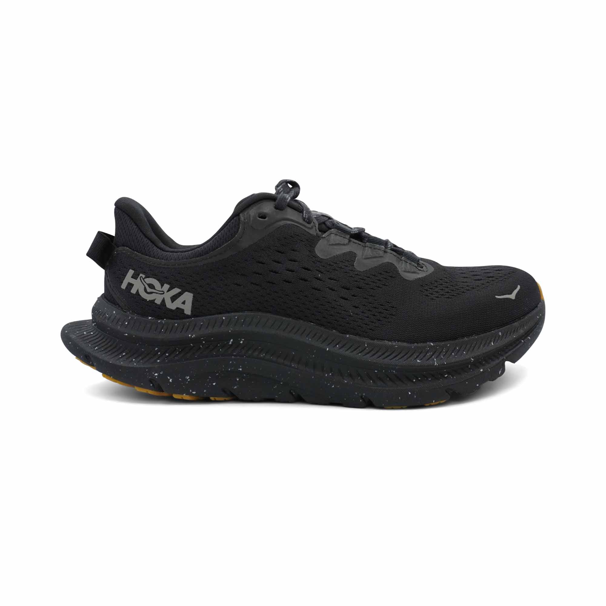 Hoka 'Kawana 2' training sneakers in black mesh knit with reflective logo detailing, speckled foam midsoles, and gum rubber soles.