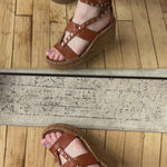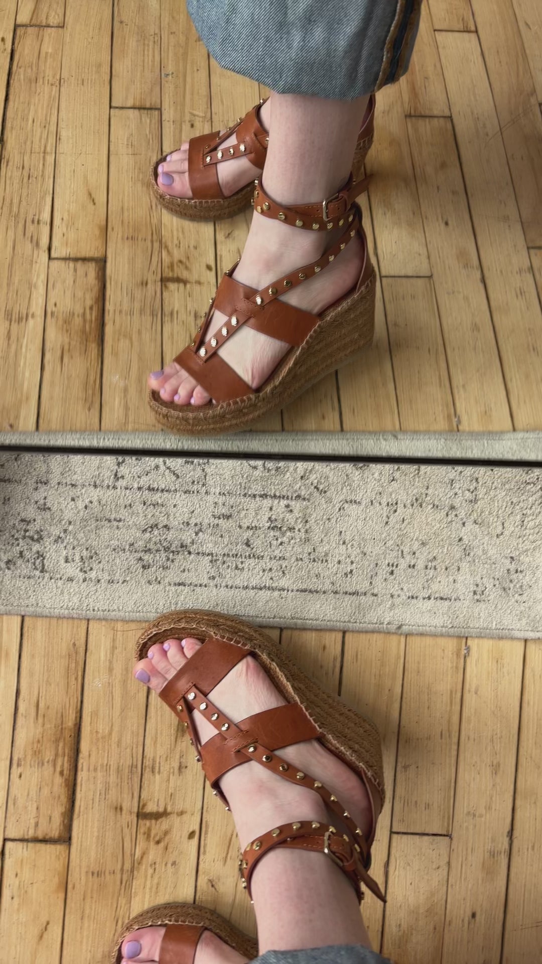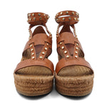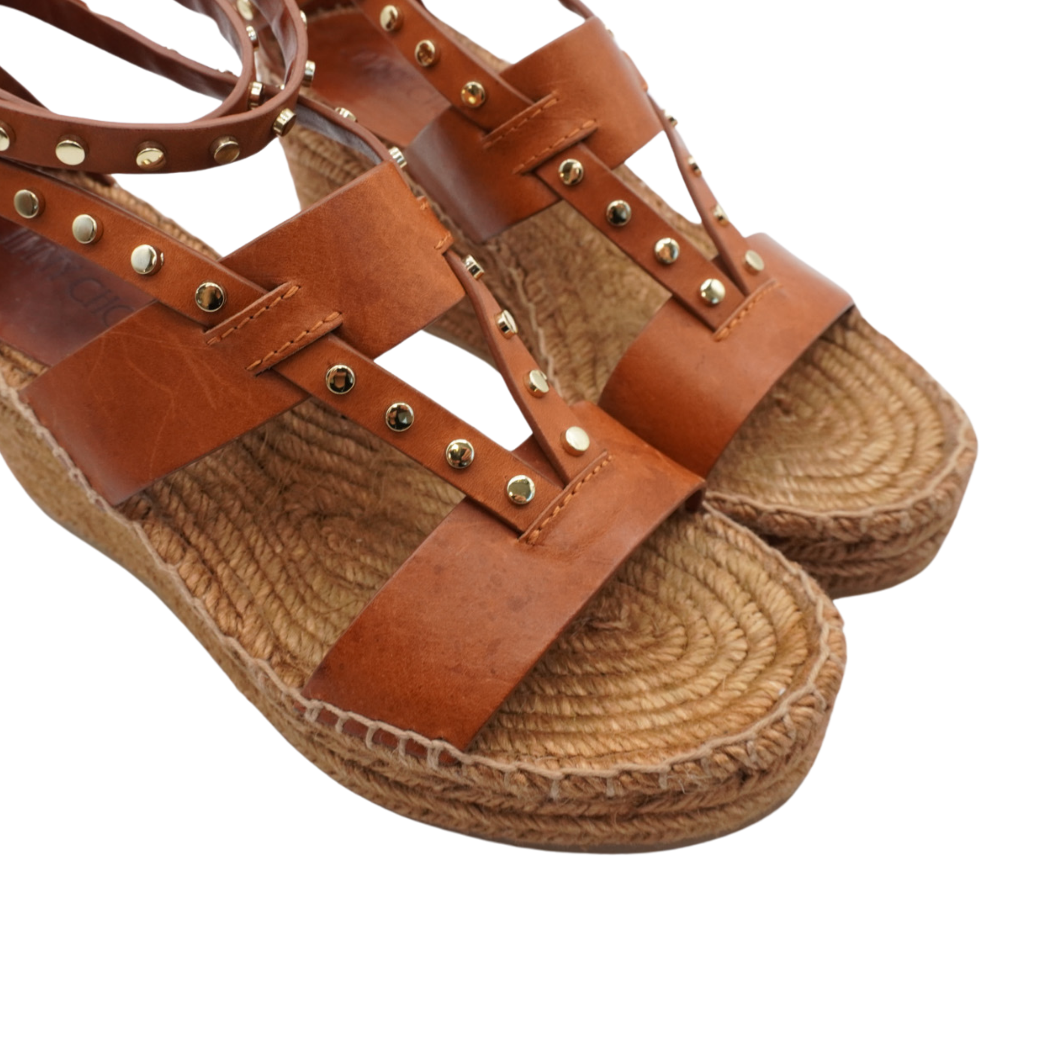 Jimmy Choo 'Danica' sandals in brown leather with gold studs and espadrille wedge heels.