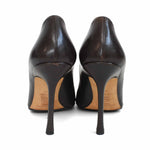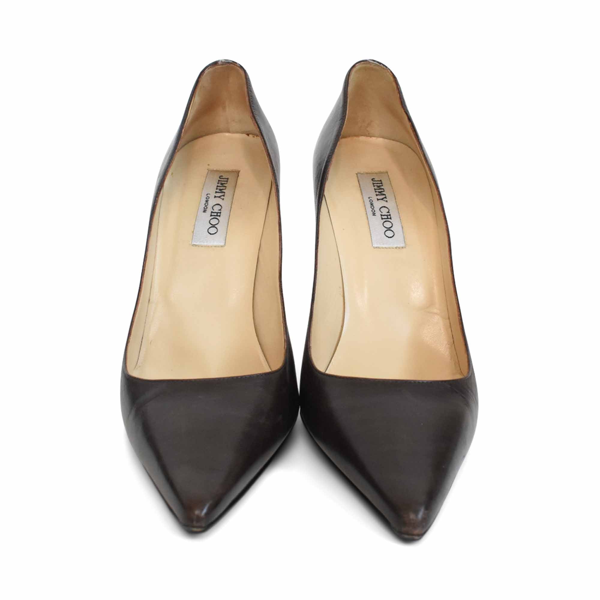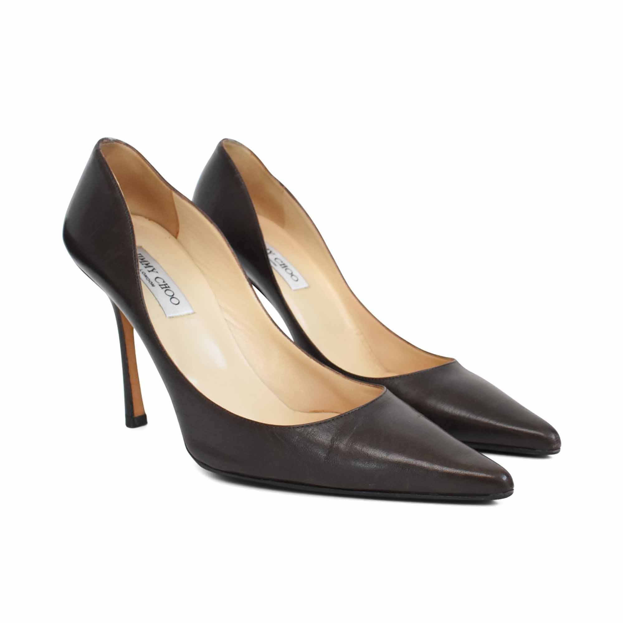 Jimmy Choo pointed-toe stiletto heels in chocolate brown leather.