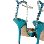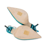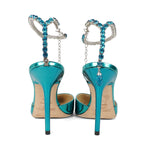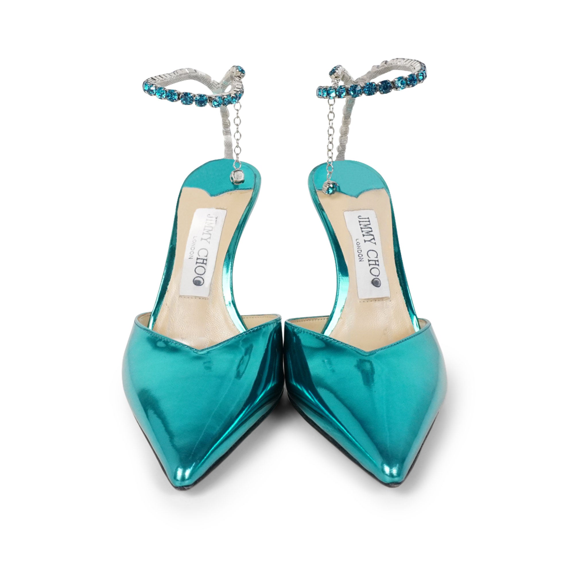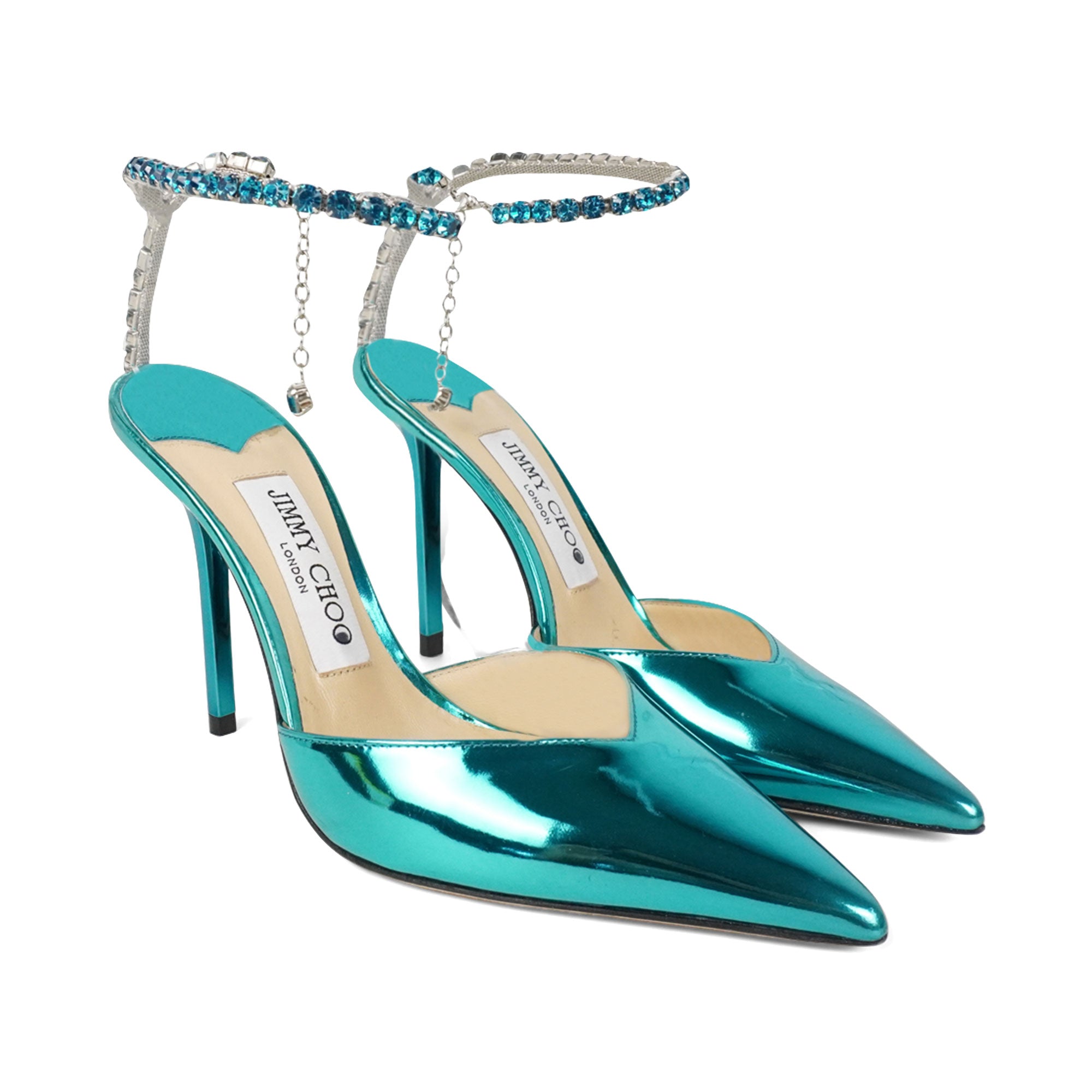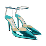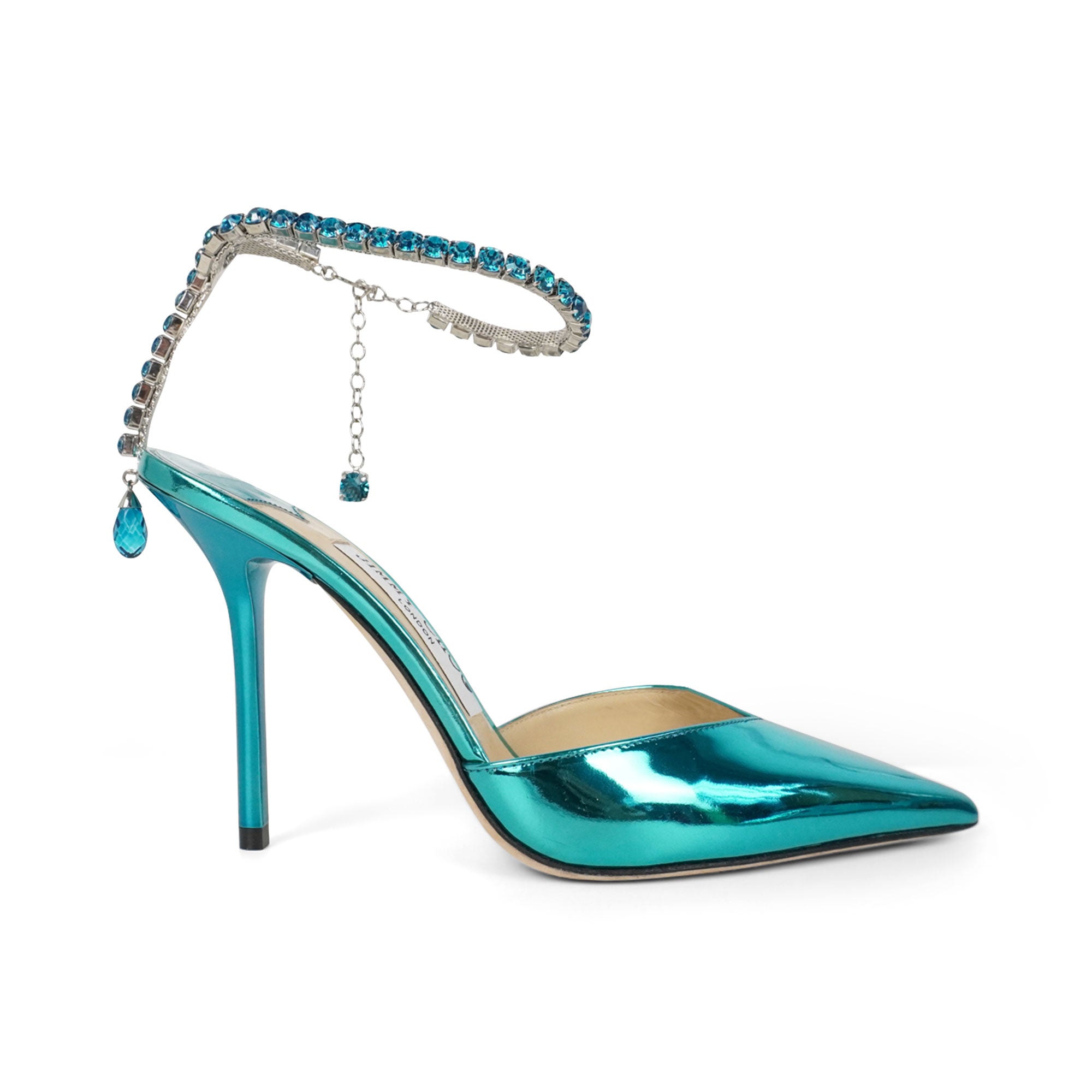 Jimmy Choo 'Saeda' pumps in metallic aqua blue with a crystal ankle strap, a stiletto heel, and a pointed toe.