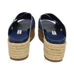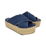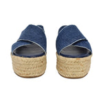 Miu Miu platform espadrilles with blue denim criss cross straps and braided twine midsoles.