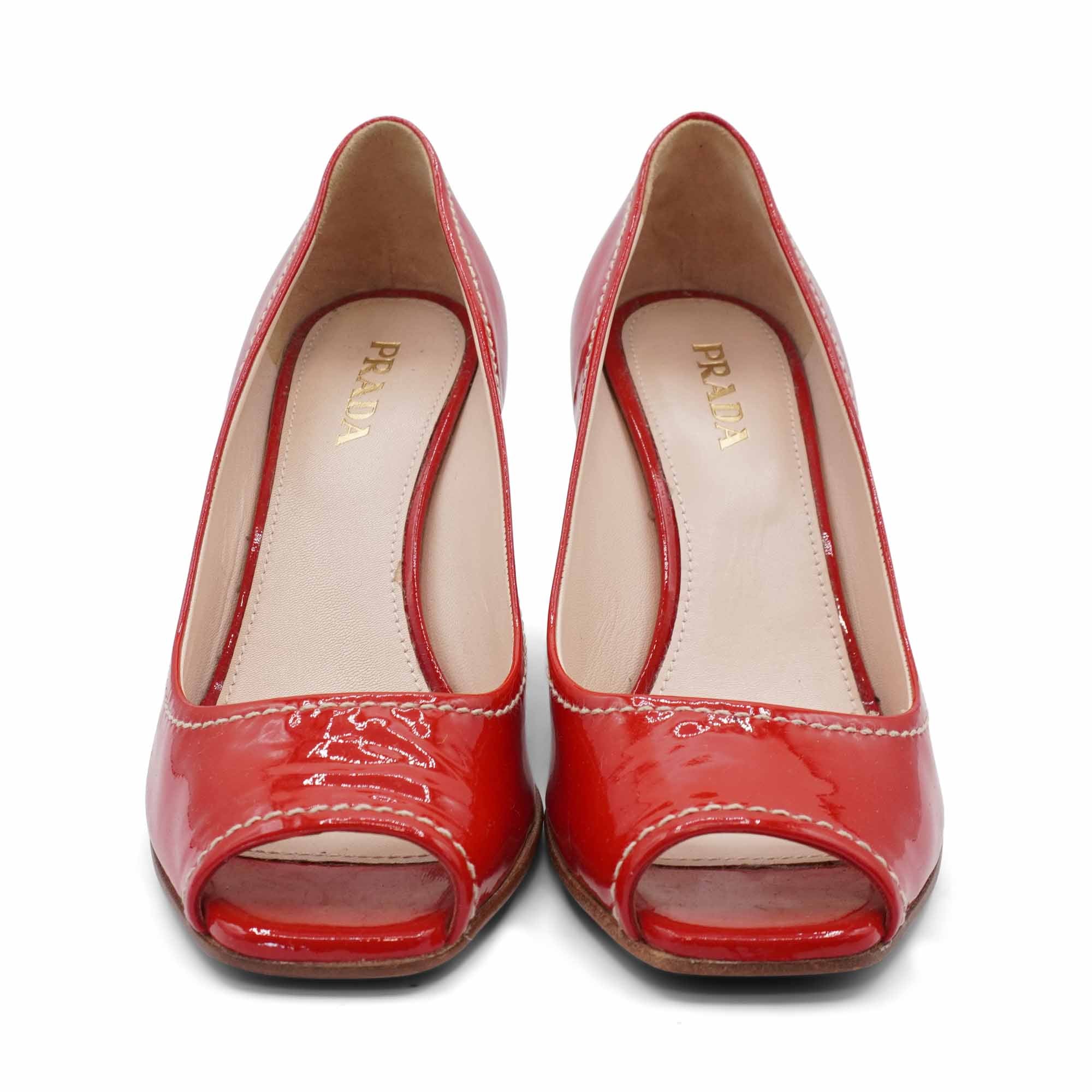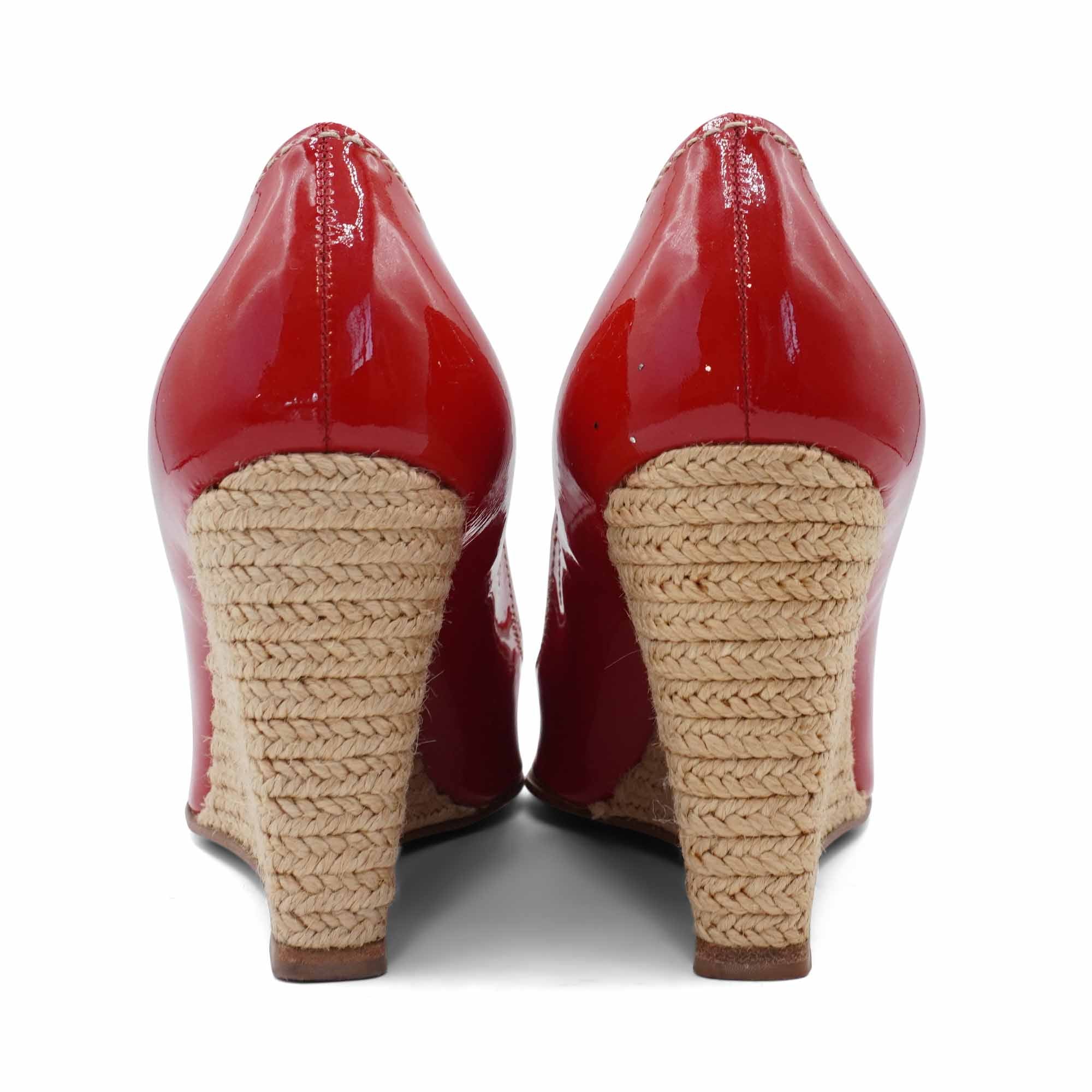Prada peep-toe wedges in red patent leather with beige top stitching and raffia wedged heel.