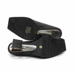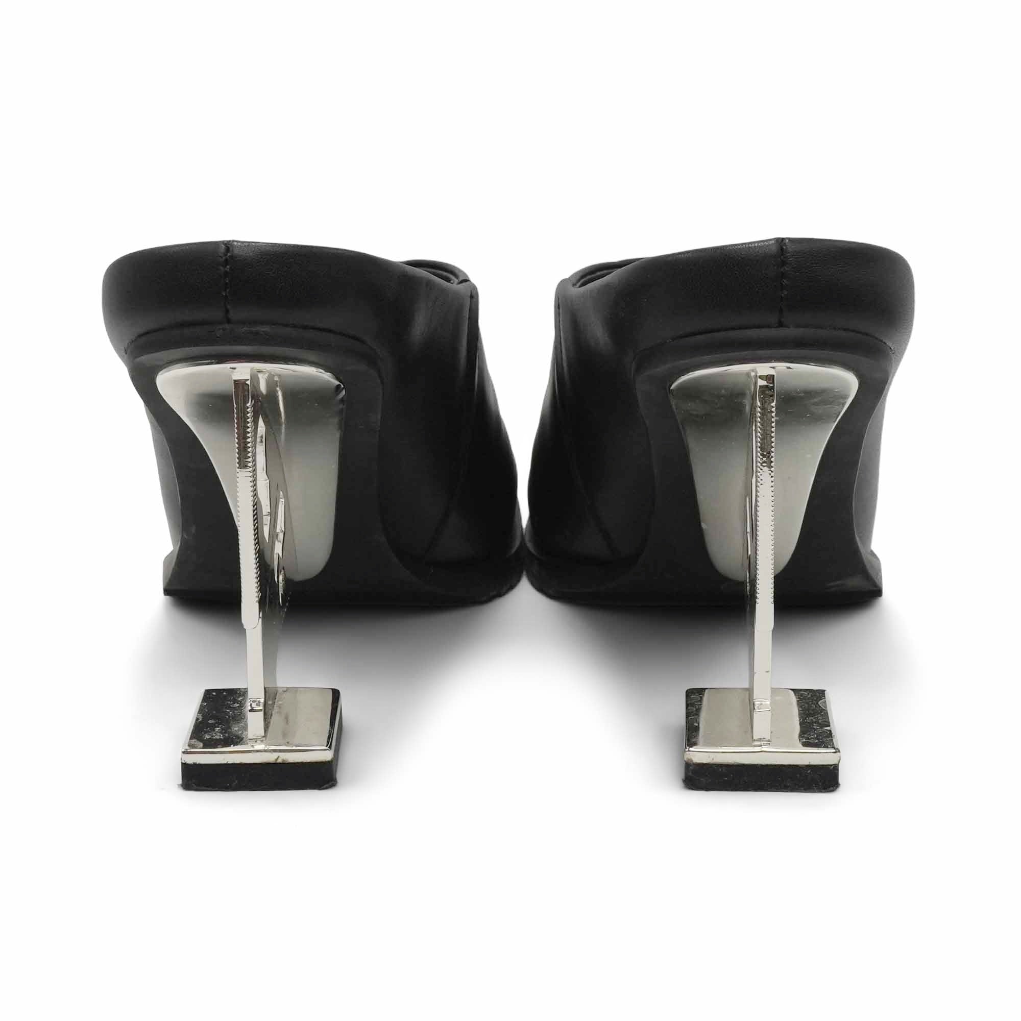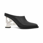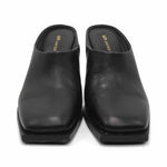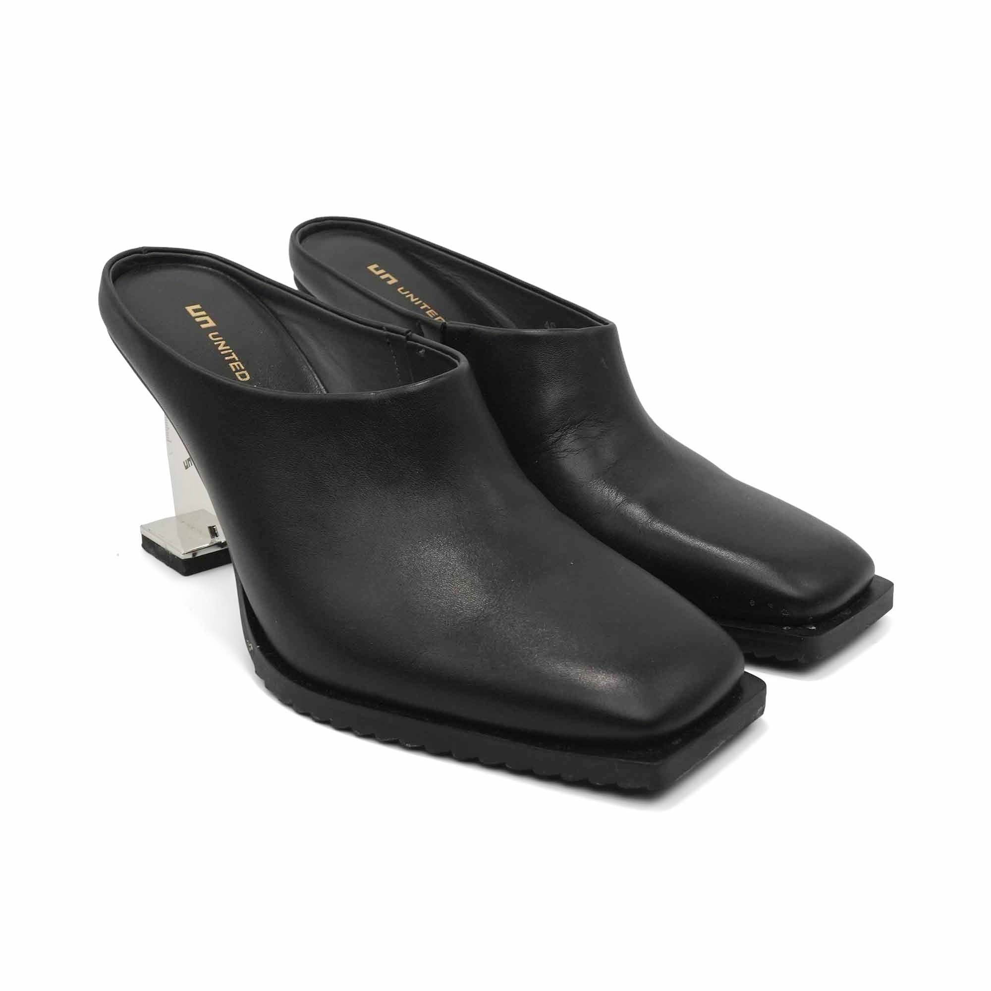 United Nude 'Tool' square toe mules in black leather with silver cutout ruler heel.