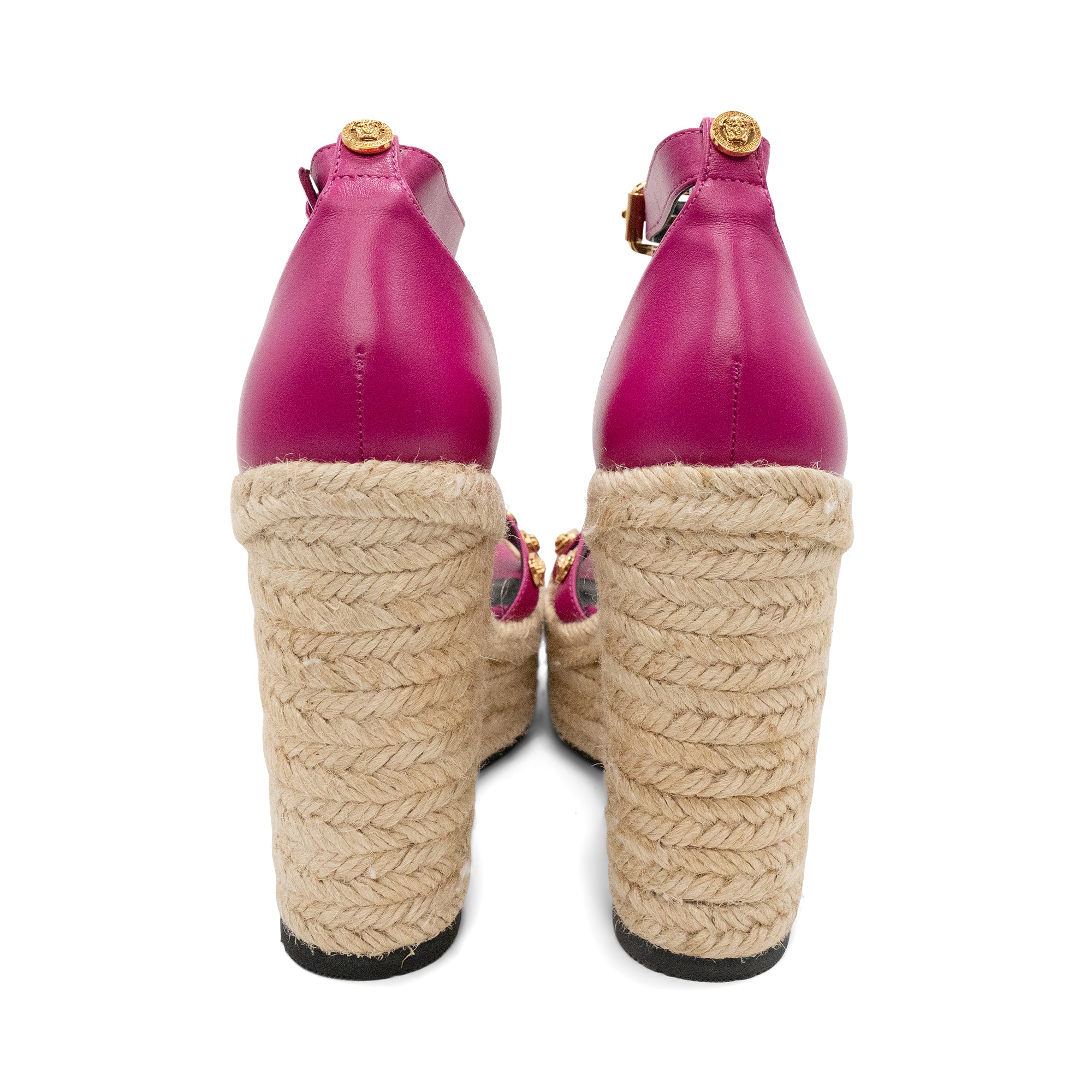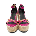 Versace espadrilles wedges in fuschia leather with criss cross toe strap and gold medusa head studs, ankle strap and large wedge raffia heel.