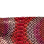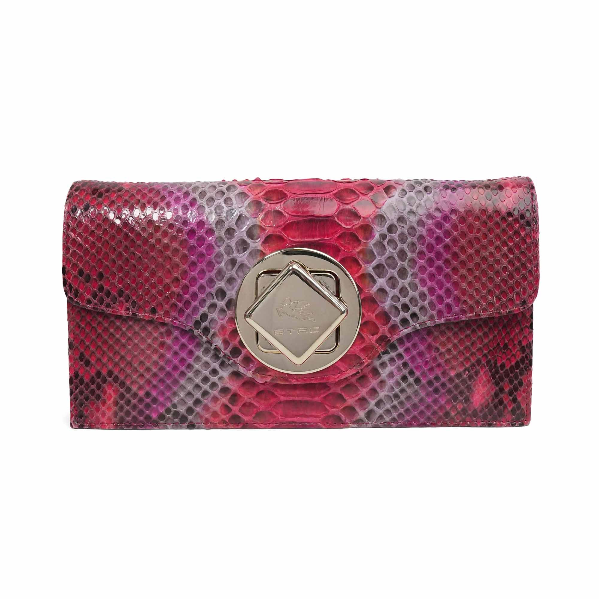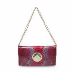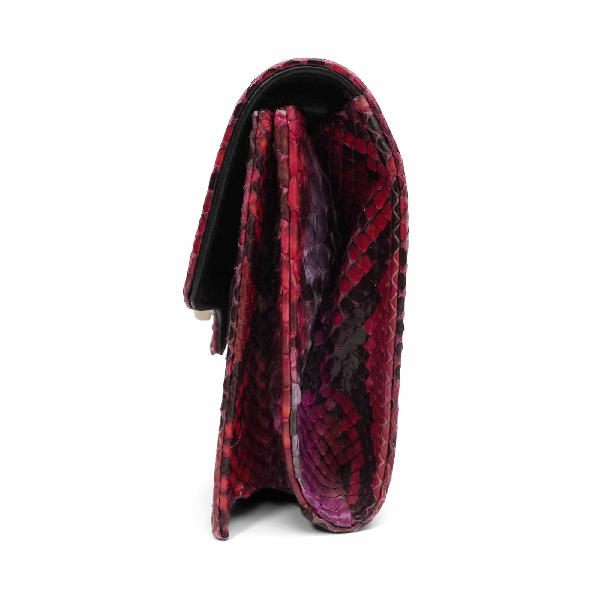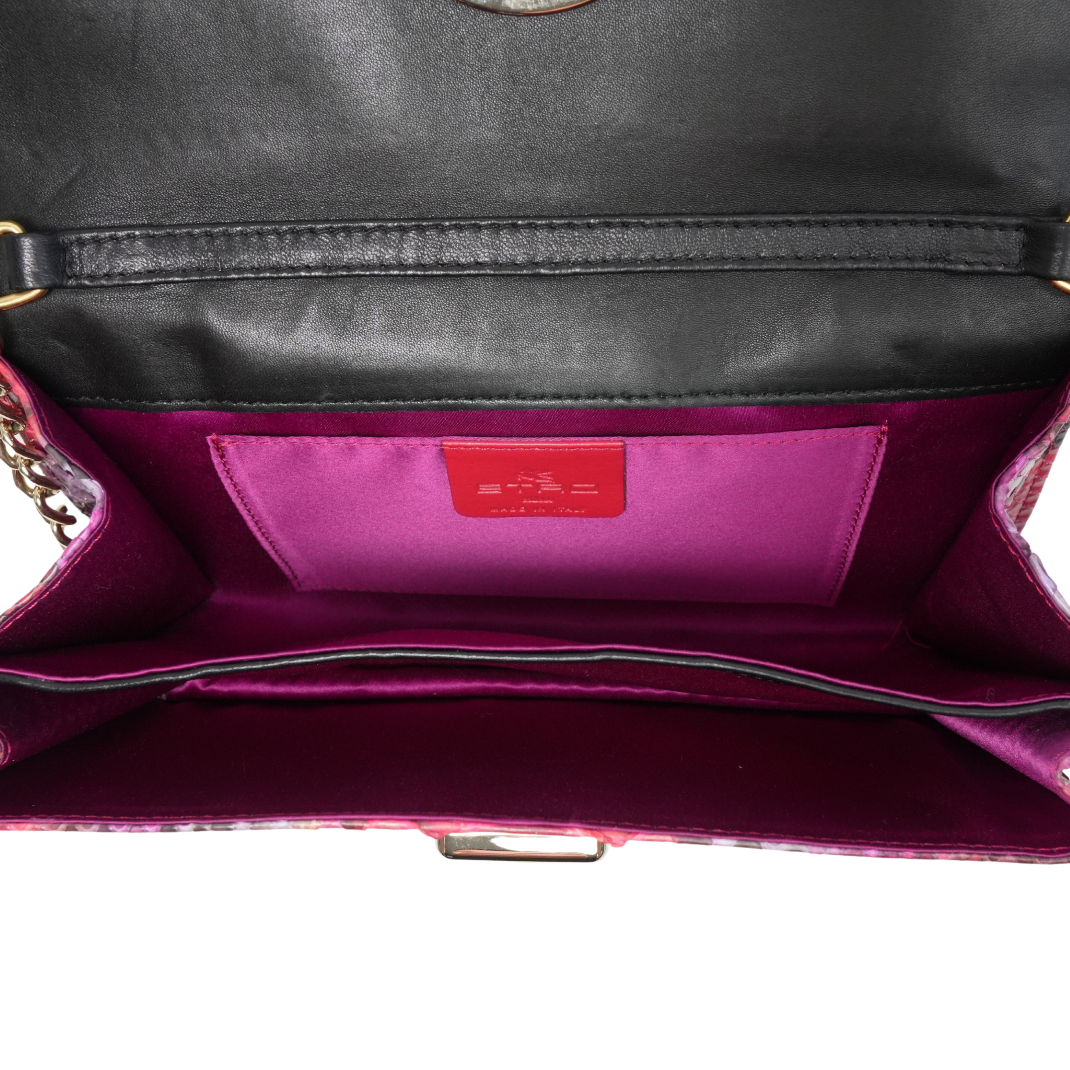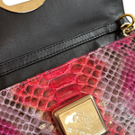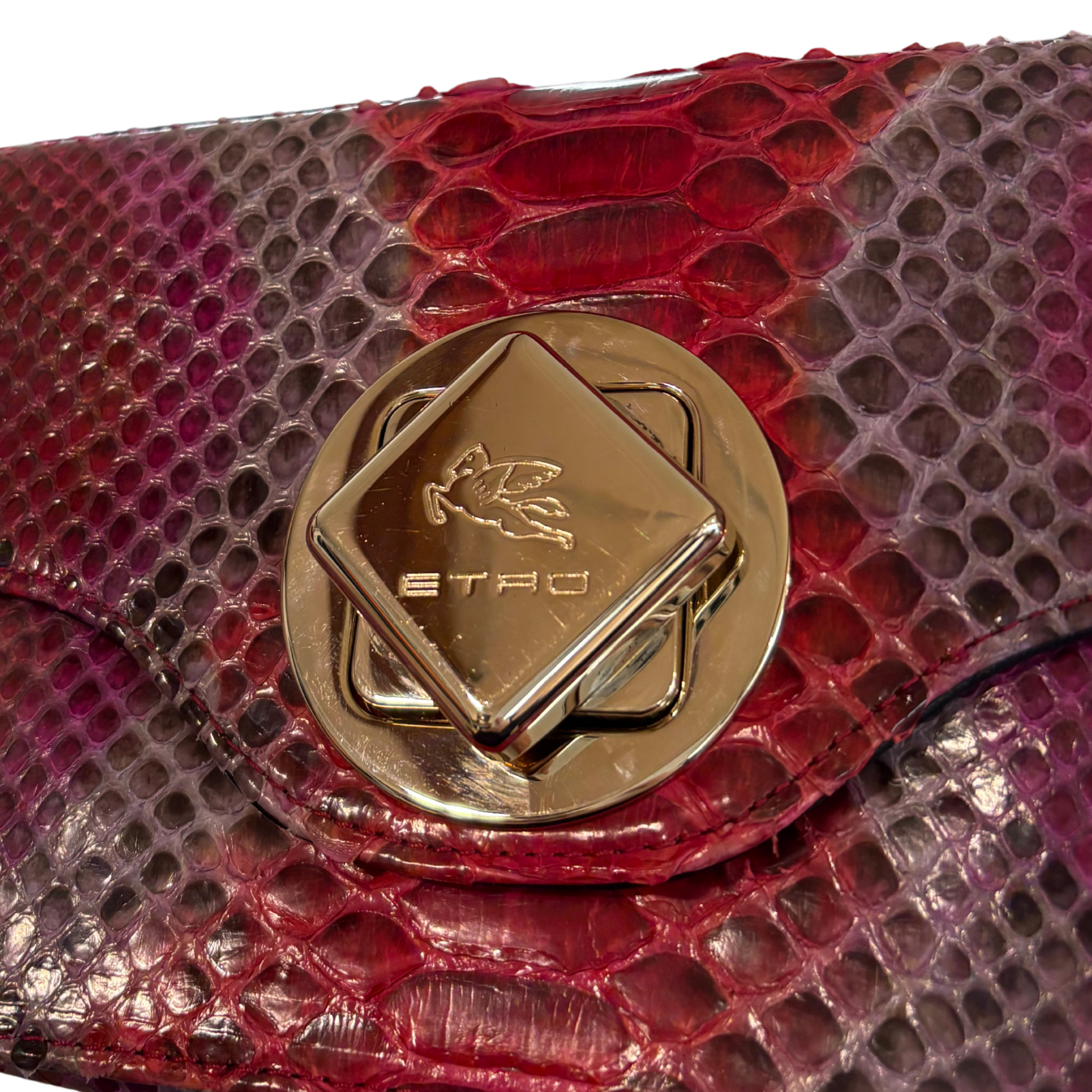 Etro clutch on chain in red, pink and purple snakeskin with engraved logo twist lock on the front and chain strap in gold hardware. Opens to a fuschia satin lining with two compartments and a slip pocket.