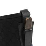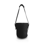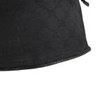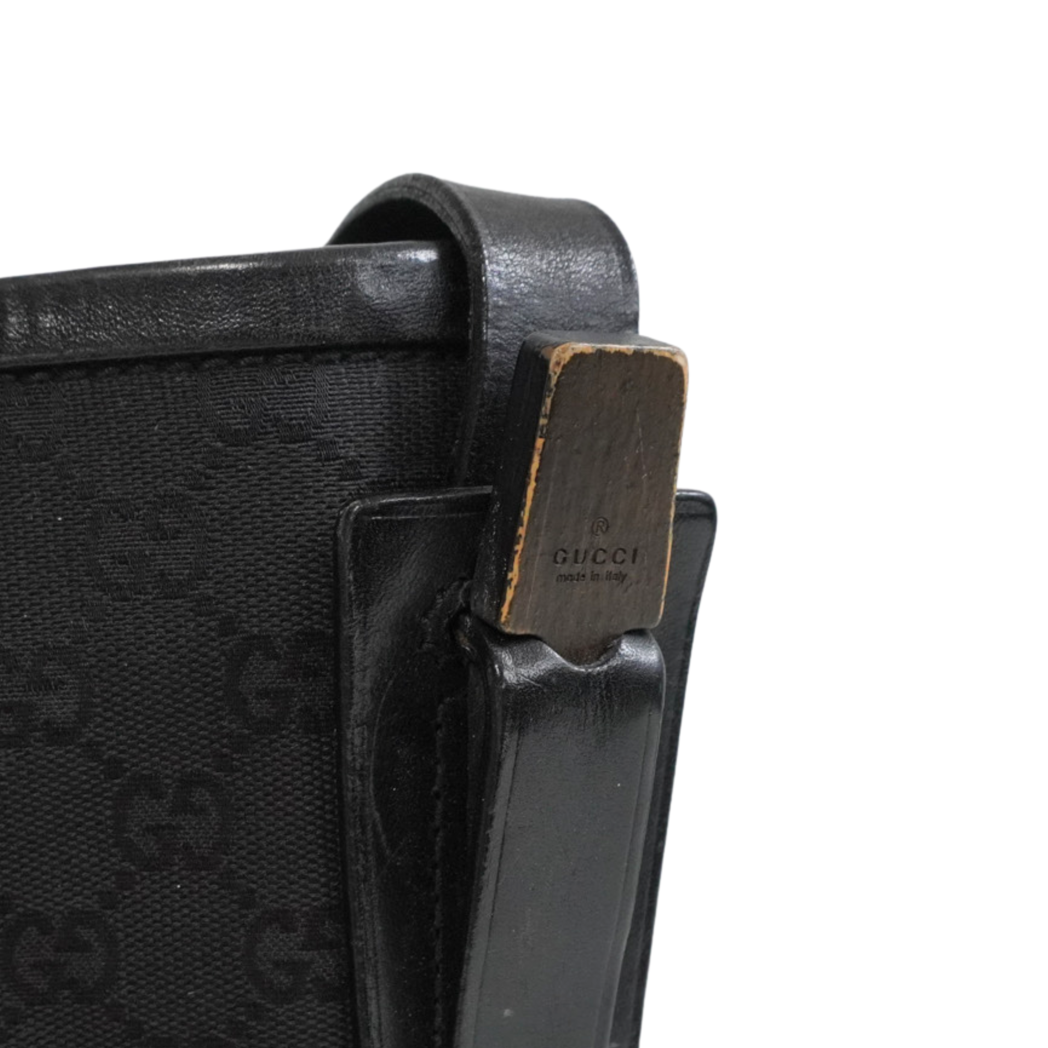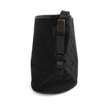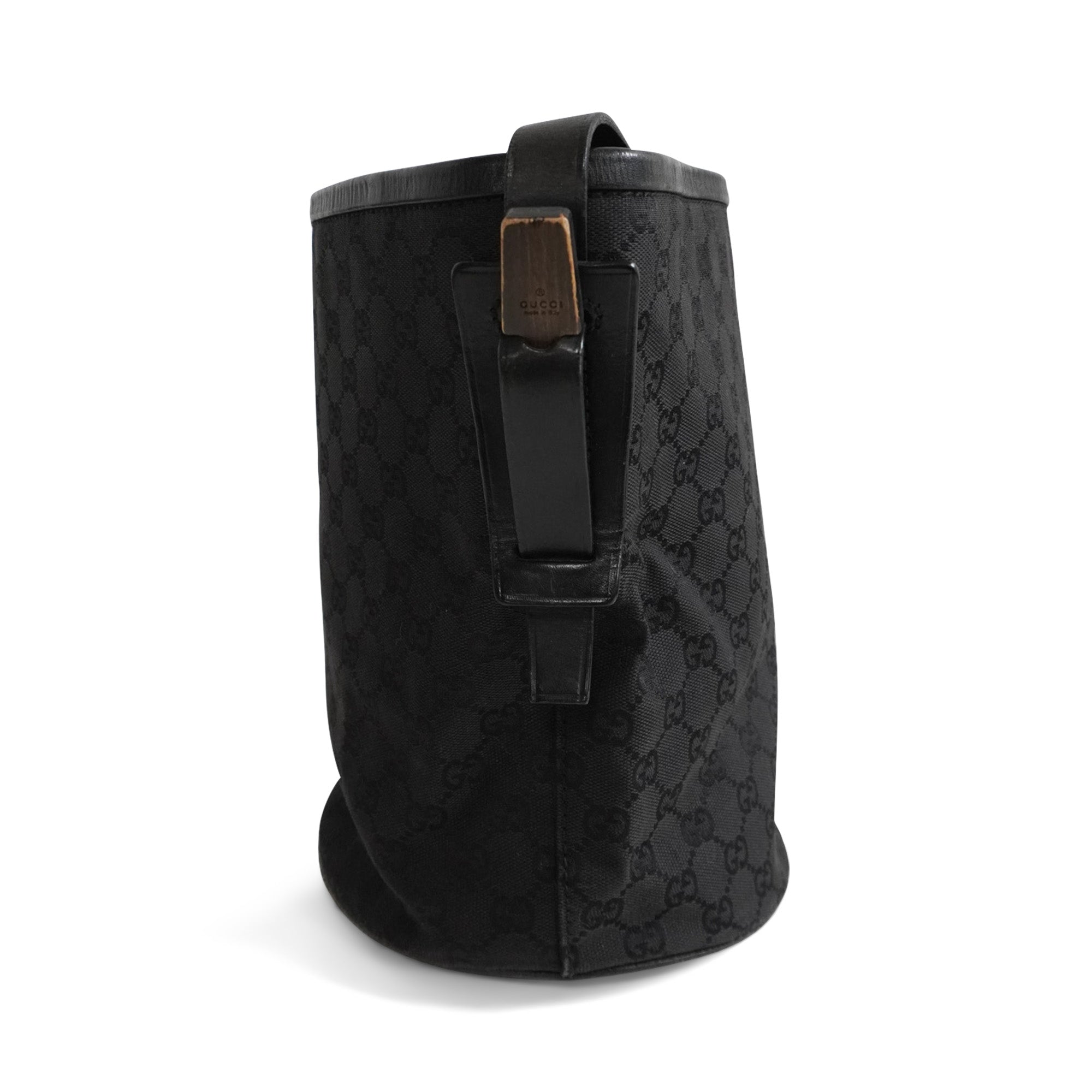 Gucci vintage bucket style shoulder bag in black monogram canvas with leather and wood details. Features a black leather shoulder strap with wood details on the sides, black leather trim, a round base, a magnetic snap closure, and an inner zip pocket.