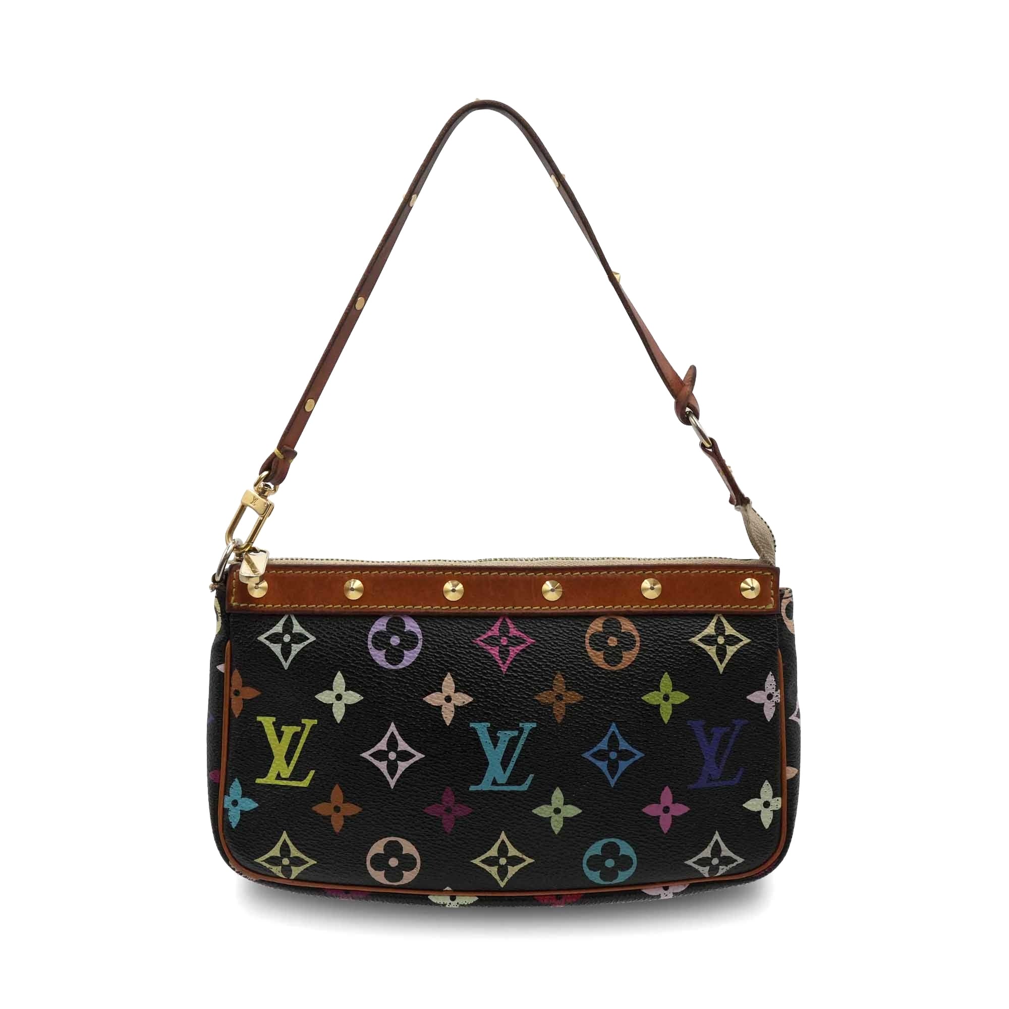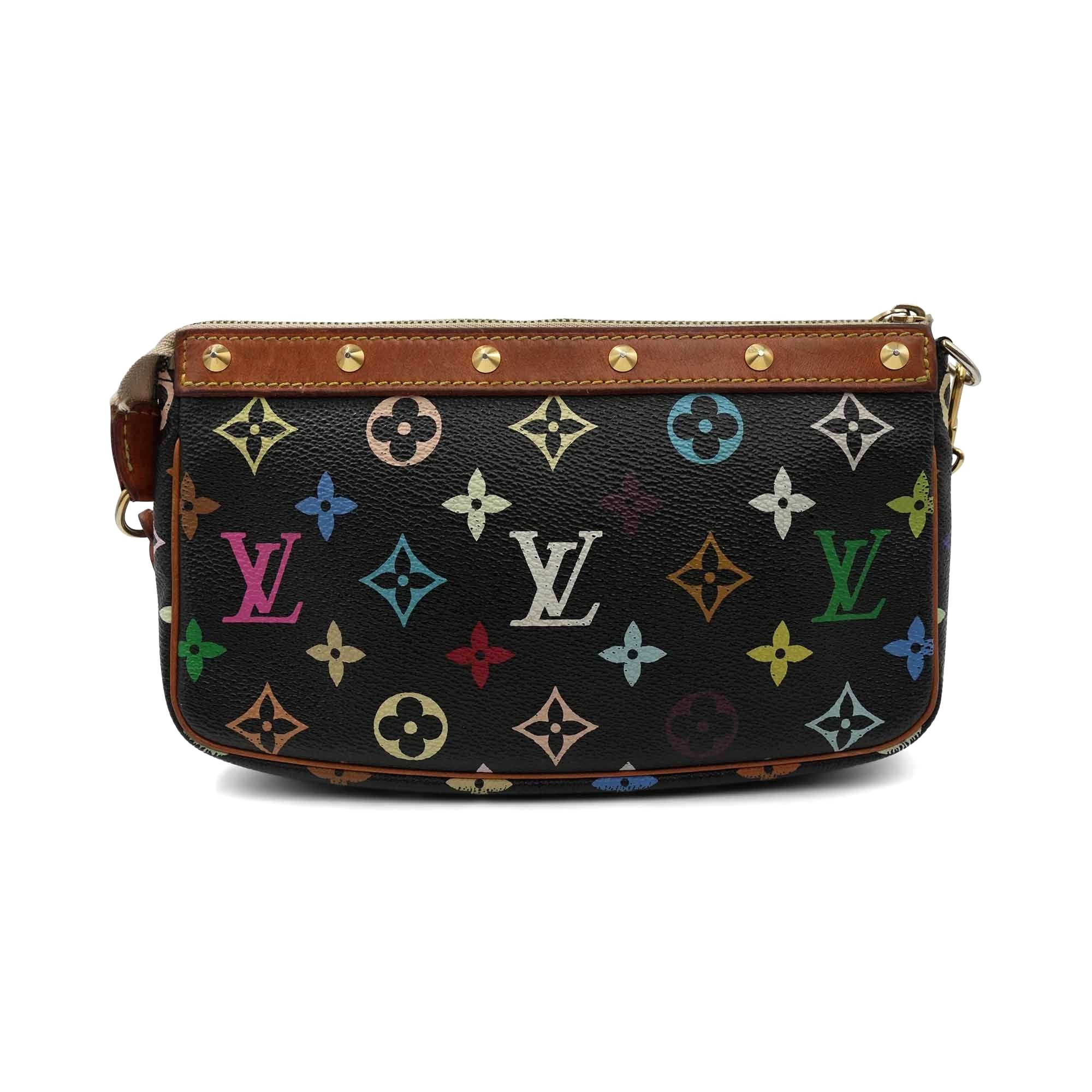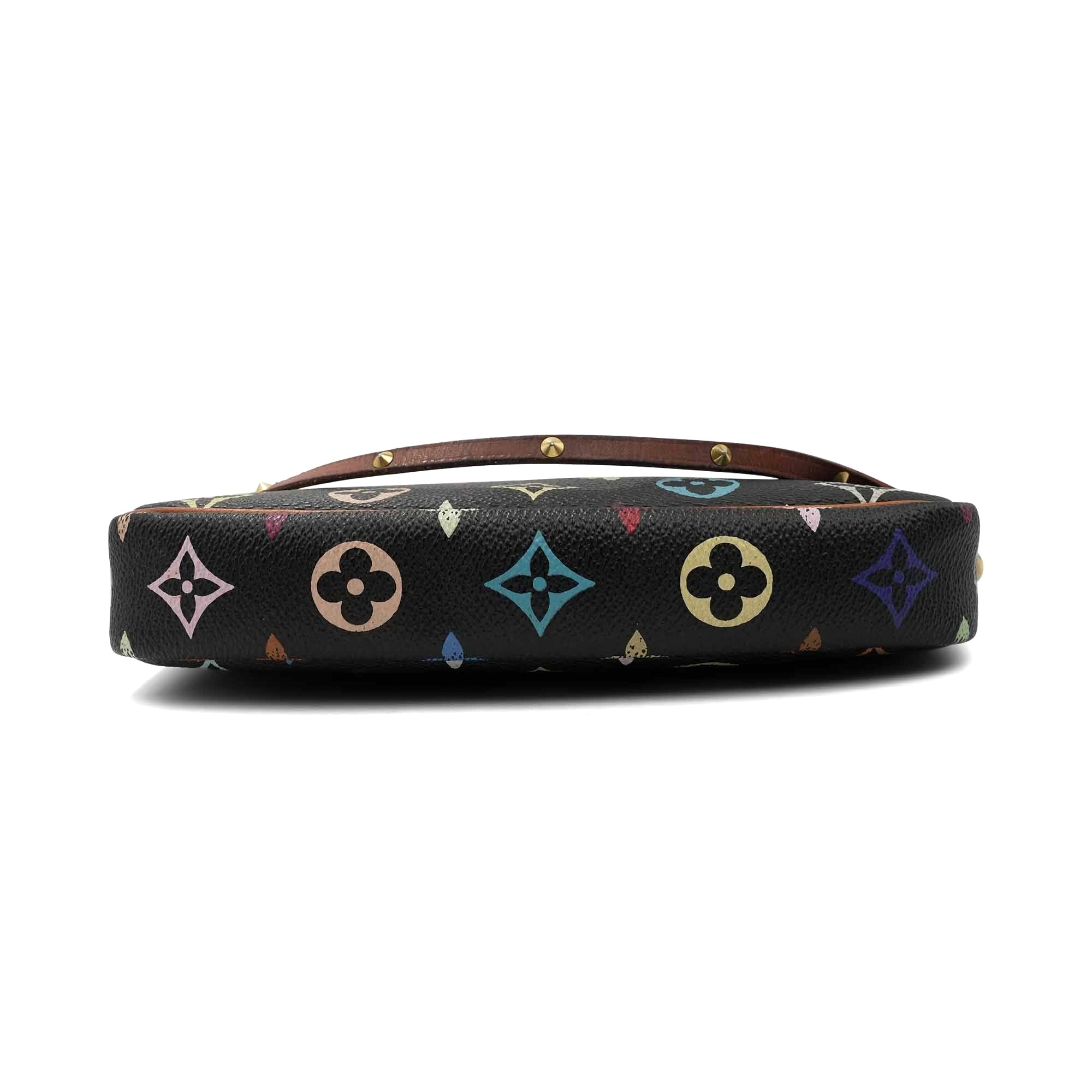 Louis Vuitton x Takashi Murakami 'Pochette Accessoires' shoulder bag in black coated canvas with an all-over rainbow monogram print and brown leather trim. The bag has a removable shoulder strap with gold stud trim, studding along the top of the bag, and a top zip opening in gold hardware, and a suede lined interior.