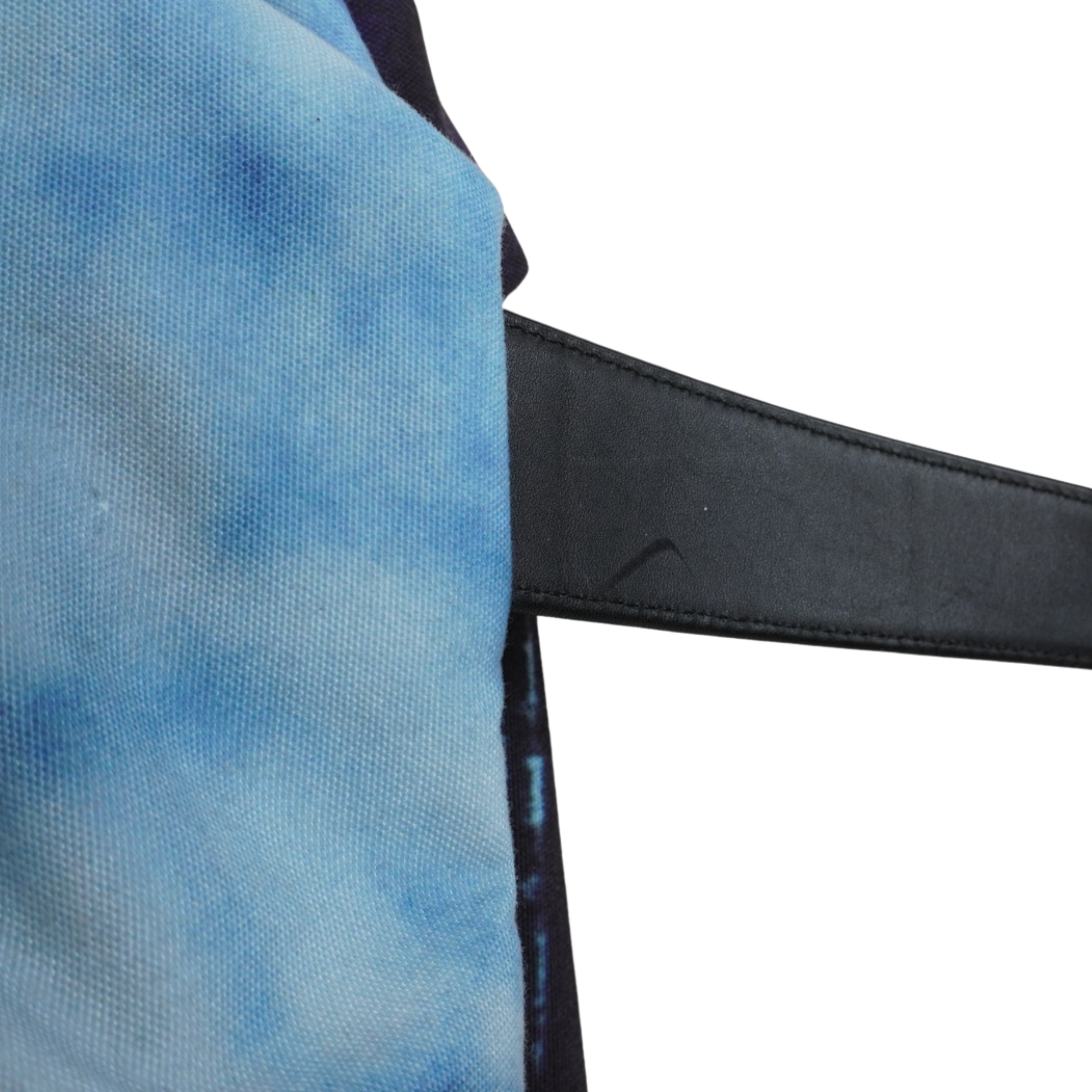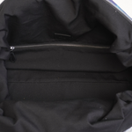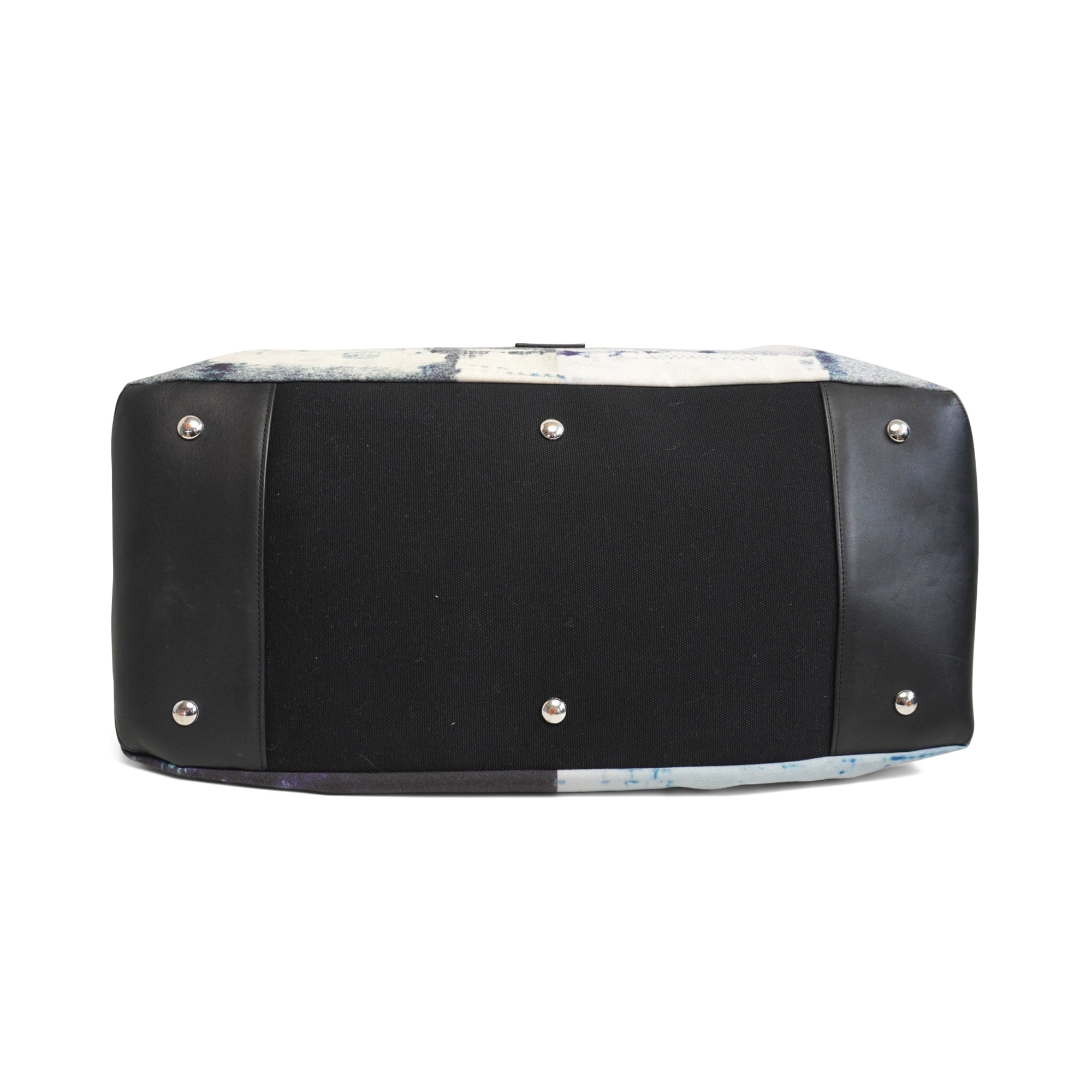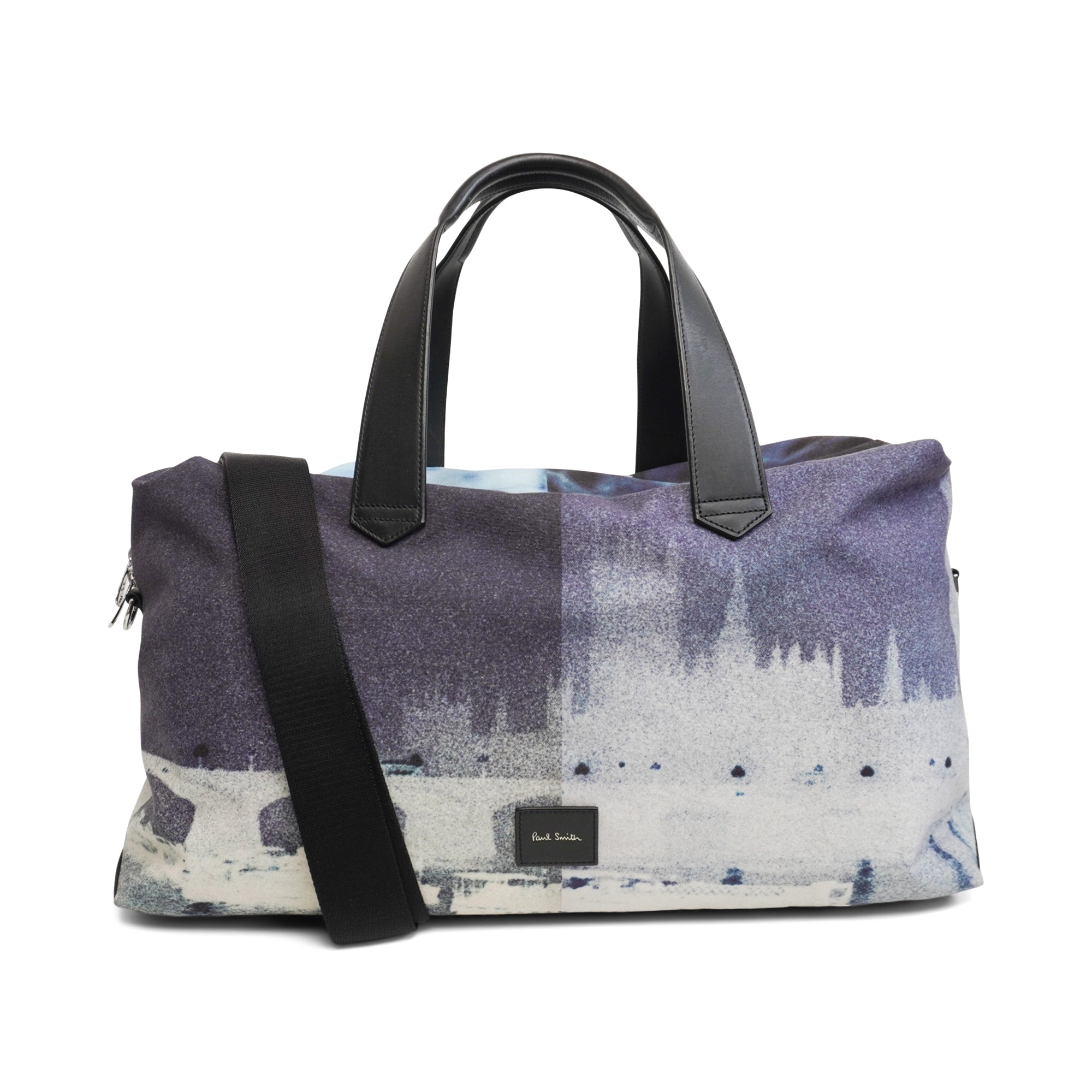 Paul Smith large duffle bag in a canvas blue skyline print with black flat leather handles and an optional adjustable shoulder strap. Interior features black canvas lining and three slip pockets.
