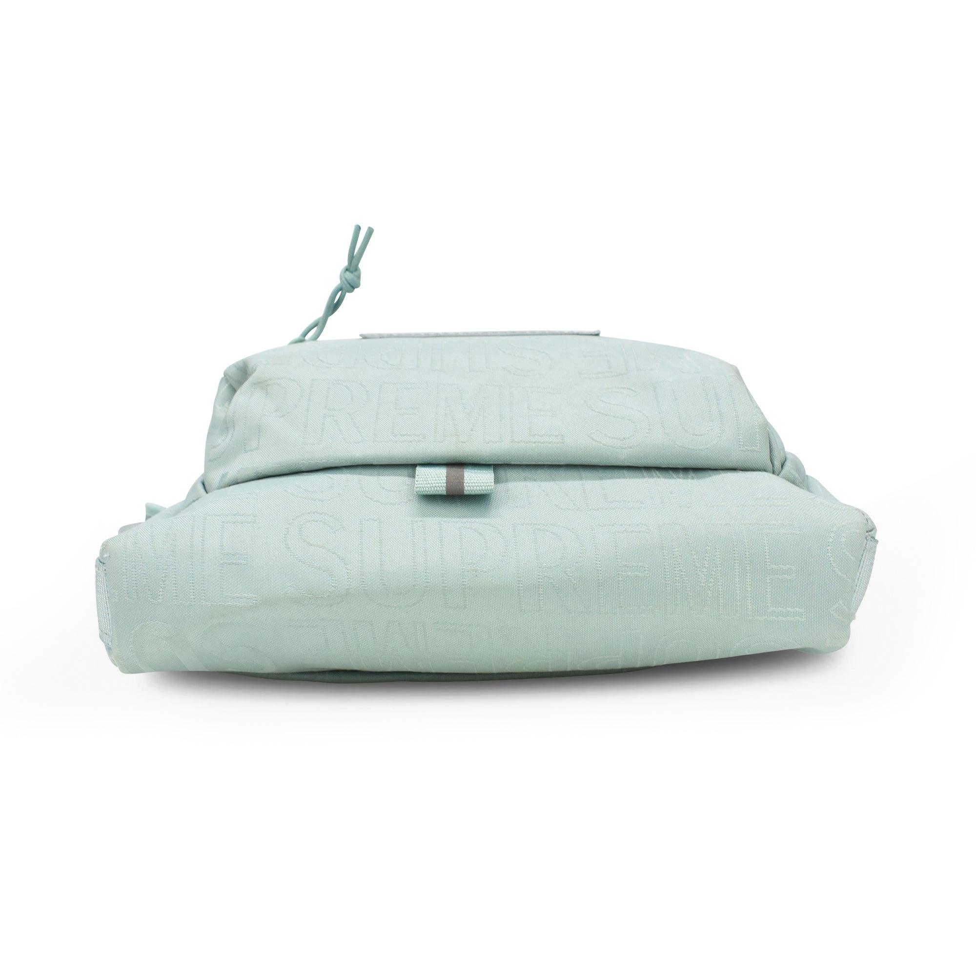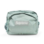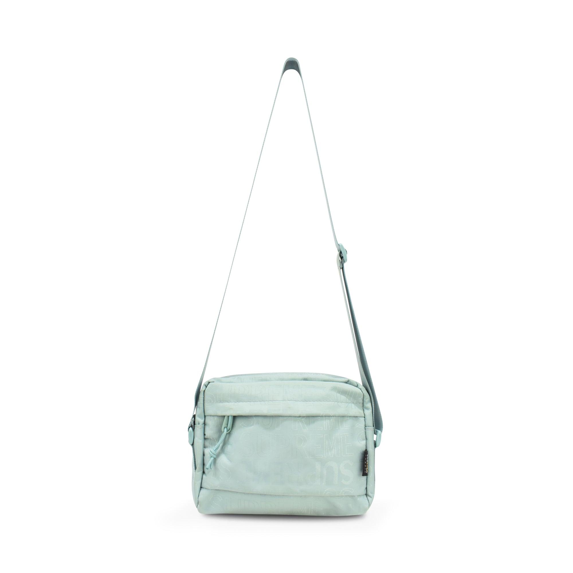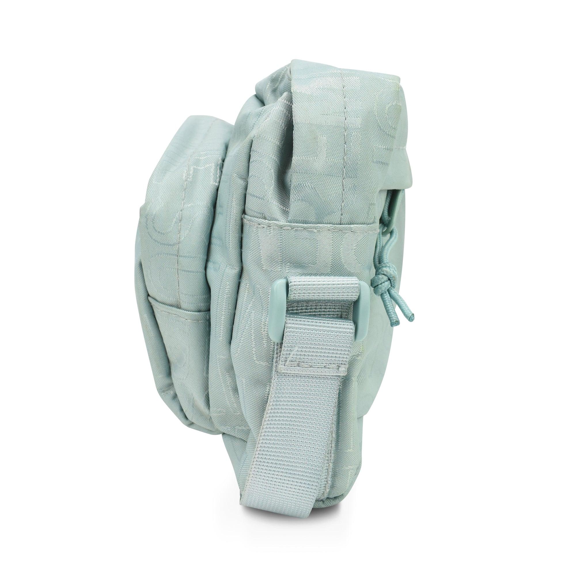 Supreme crossbody bag in light turquoise monogram canvas with a grey and white box logo. Features two zip pouches, a top zip closure and a canvas shoulder strap.