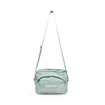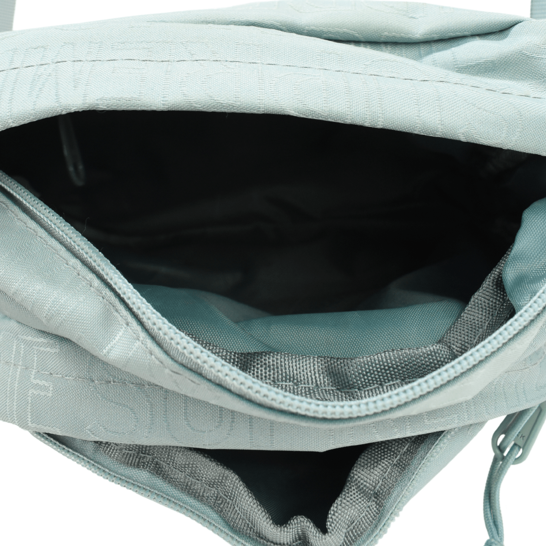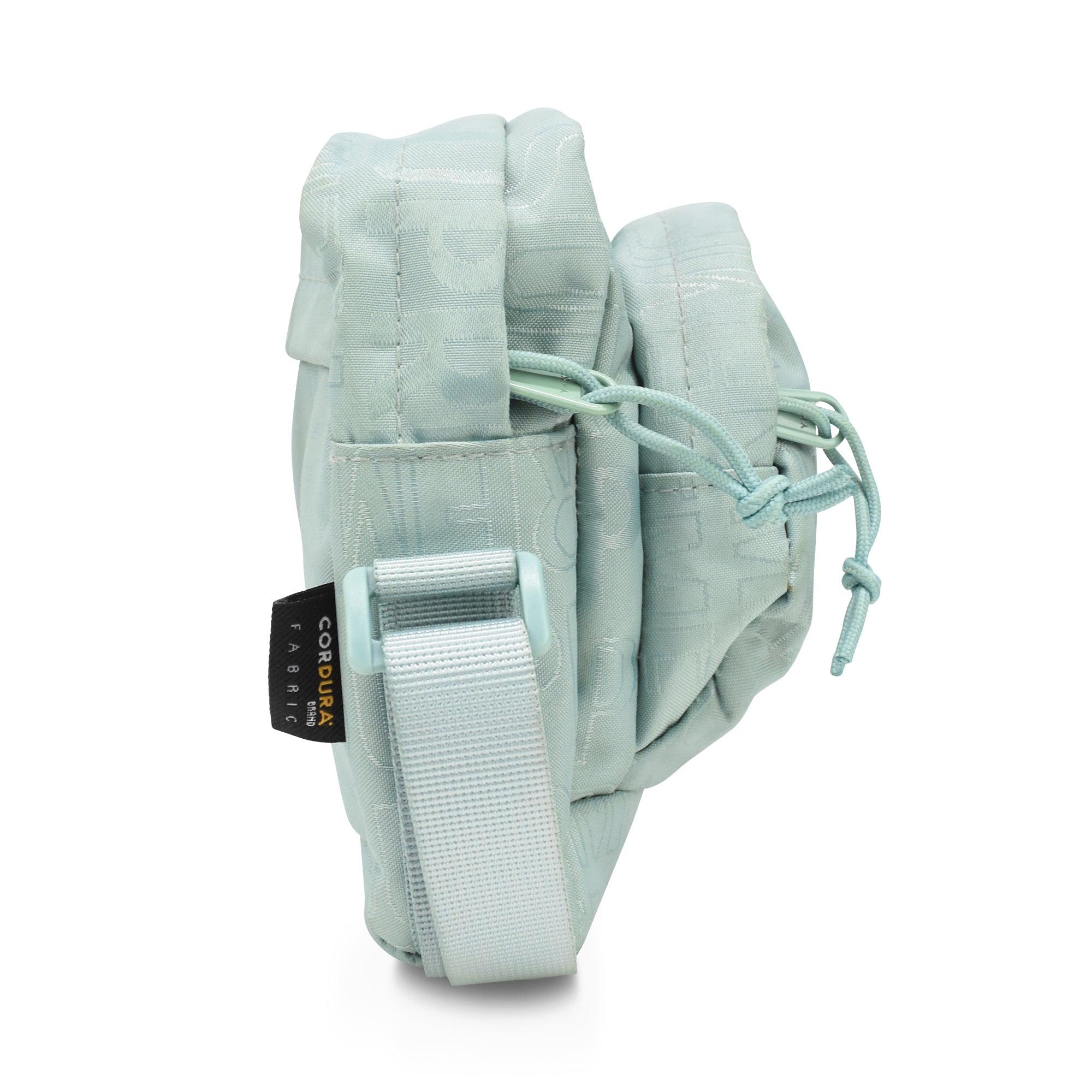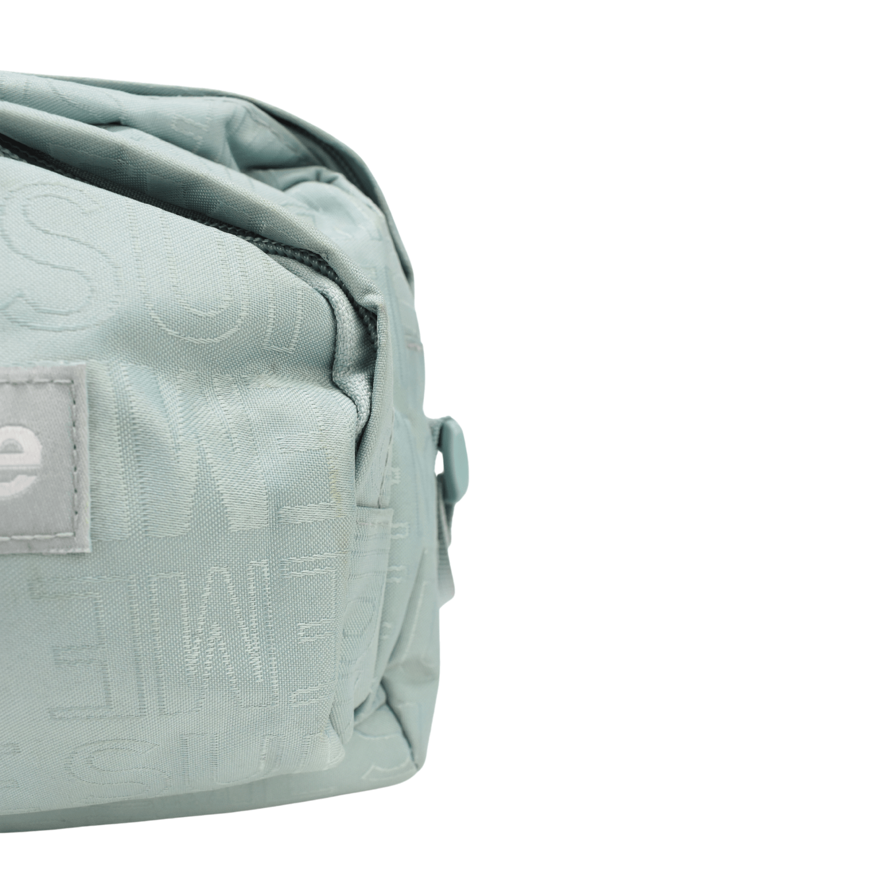 Supreme crossbody bag in light turquoise monogram canvas with a grey and white box logo. Features two zip pouches, a top zip closure and a canvas shoulder strap.