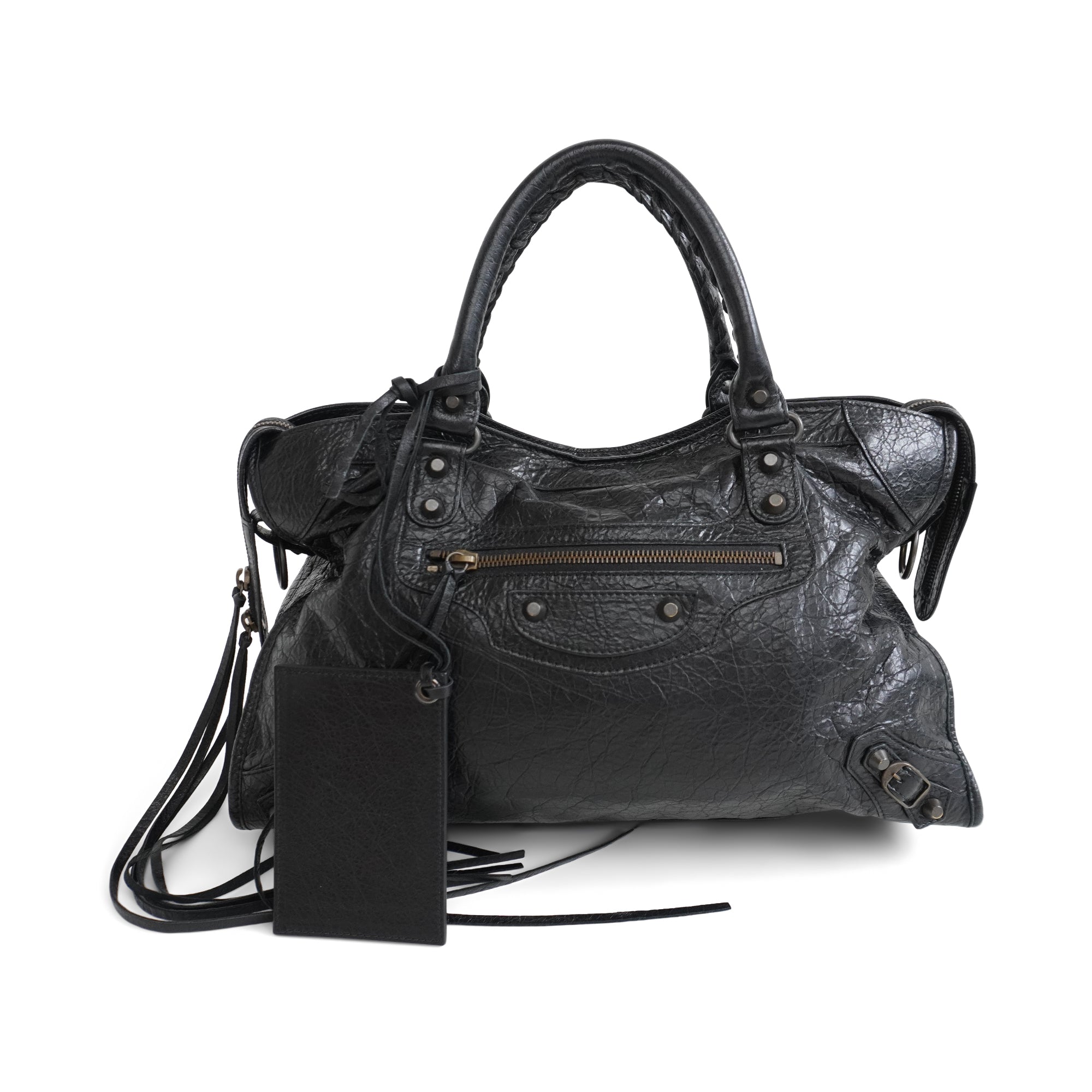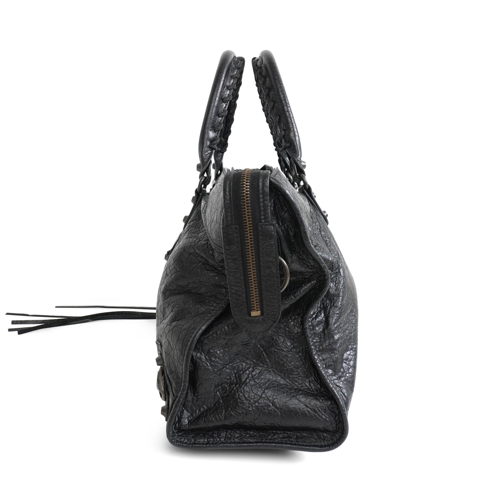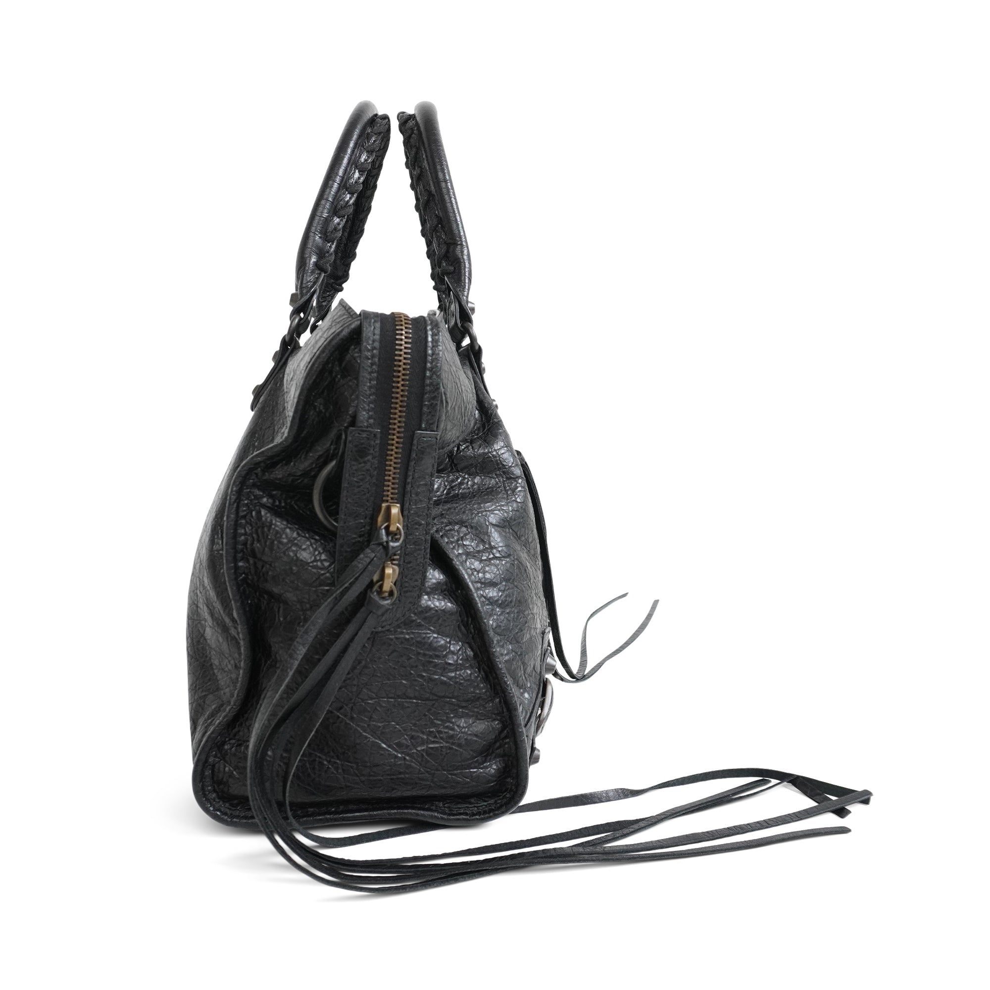 Balenciaga 'Motocross City' bag in black crinkled leather with aged brass stud and buckle hardware, dual rolled top handles with whipstitch detailing, and a removable shoulder strap. Features a two-way zipper opening and a smaller zip pocket on the front. The interior is lined with black fabric and has flat zip and slip pockets.