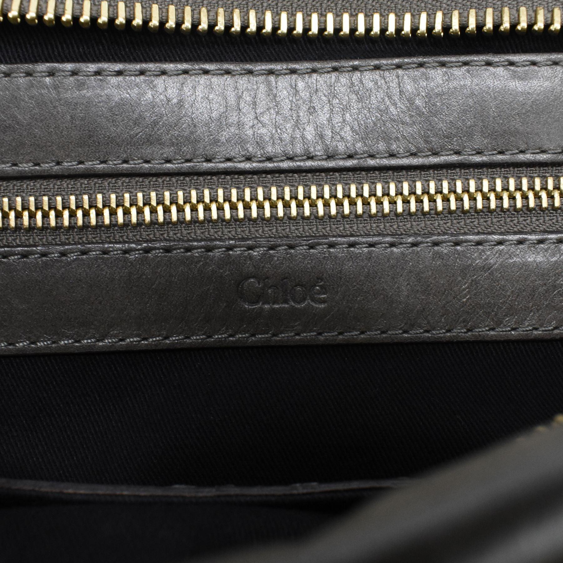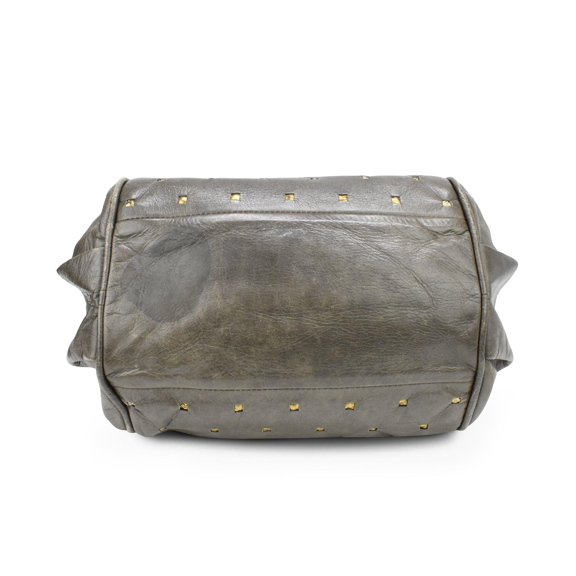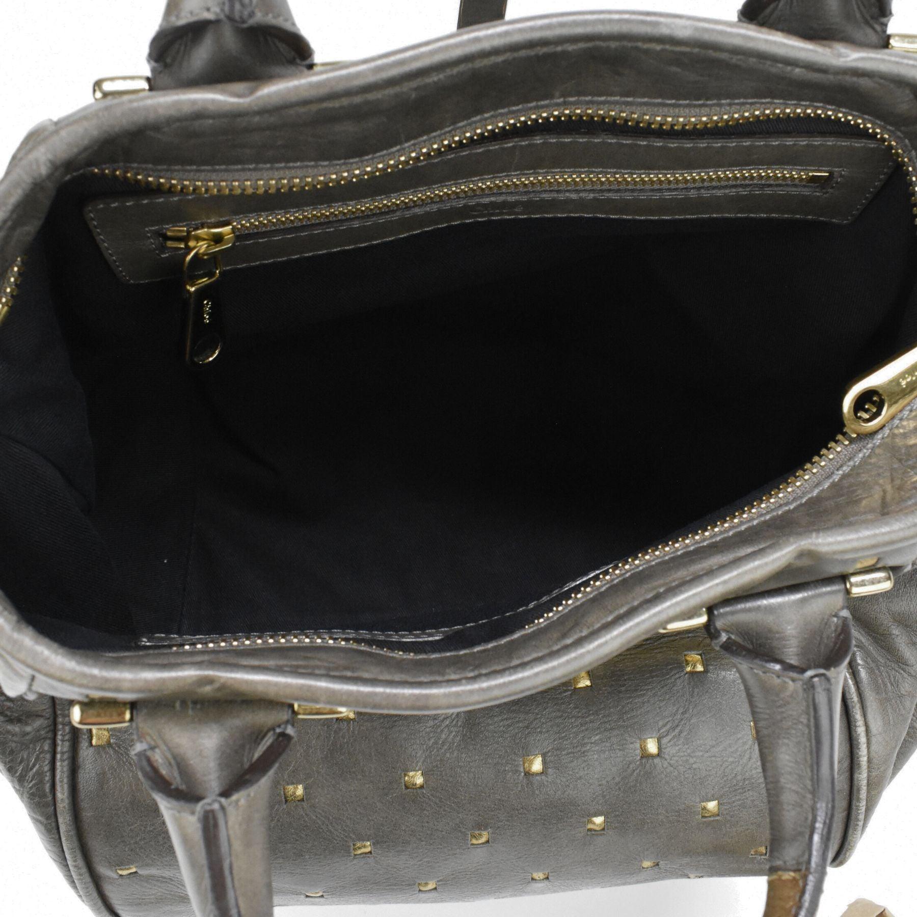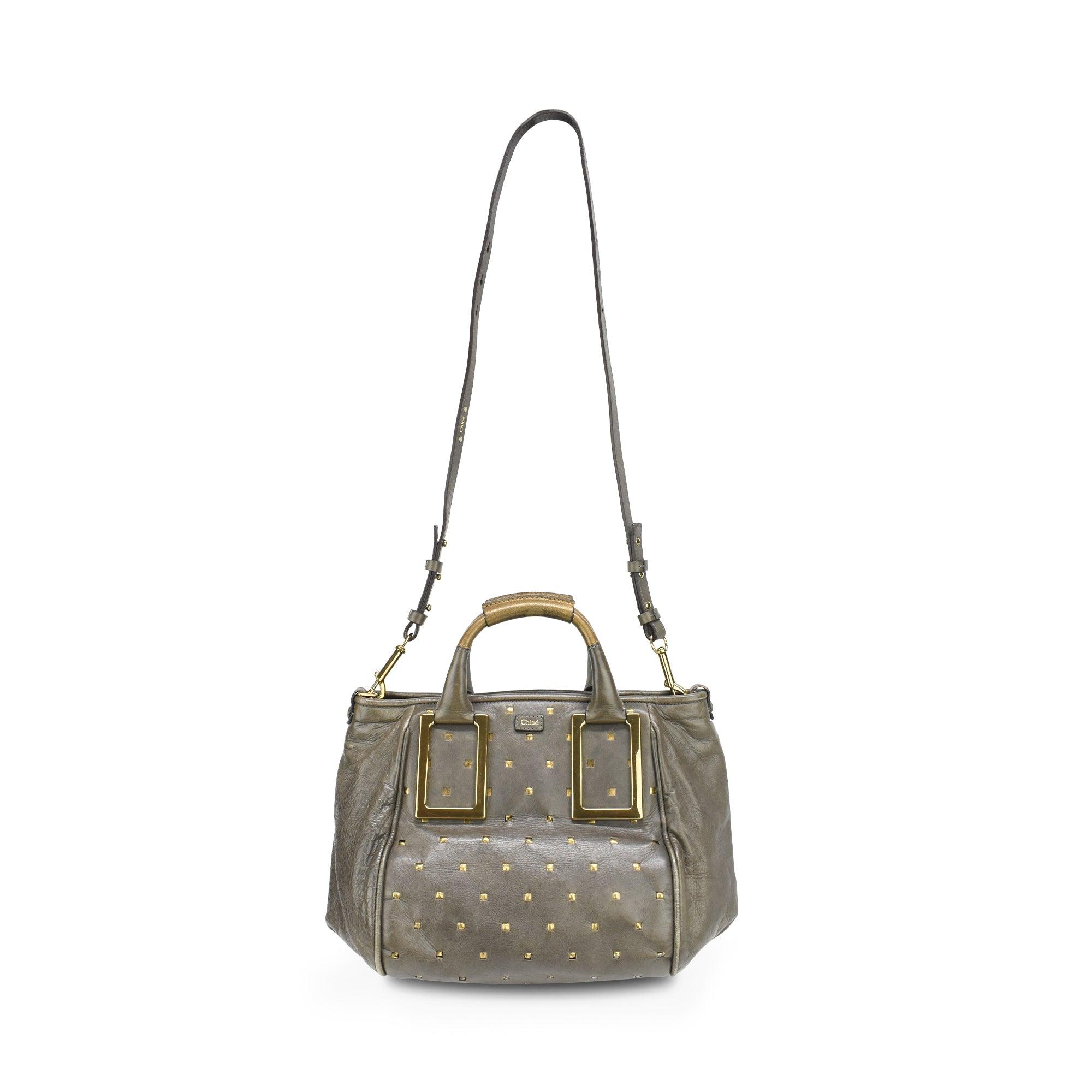 Chloe 'Ethel' handbag in grey perforated leather with metallic gold leather details, metallic leather top handles, and a top zip opening in gold hardware. Features an inner zip pocket and a removable and adjustable crossbody strap.