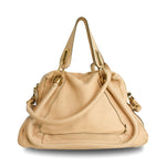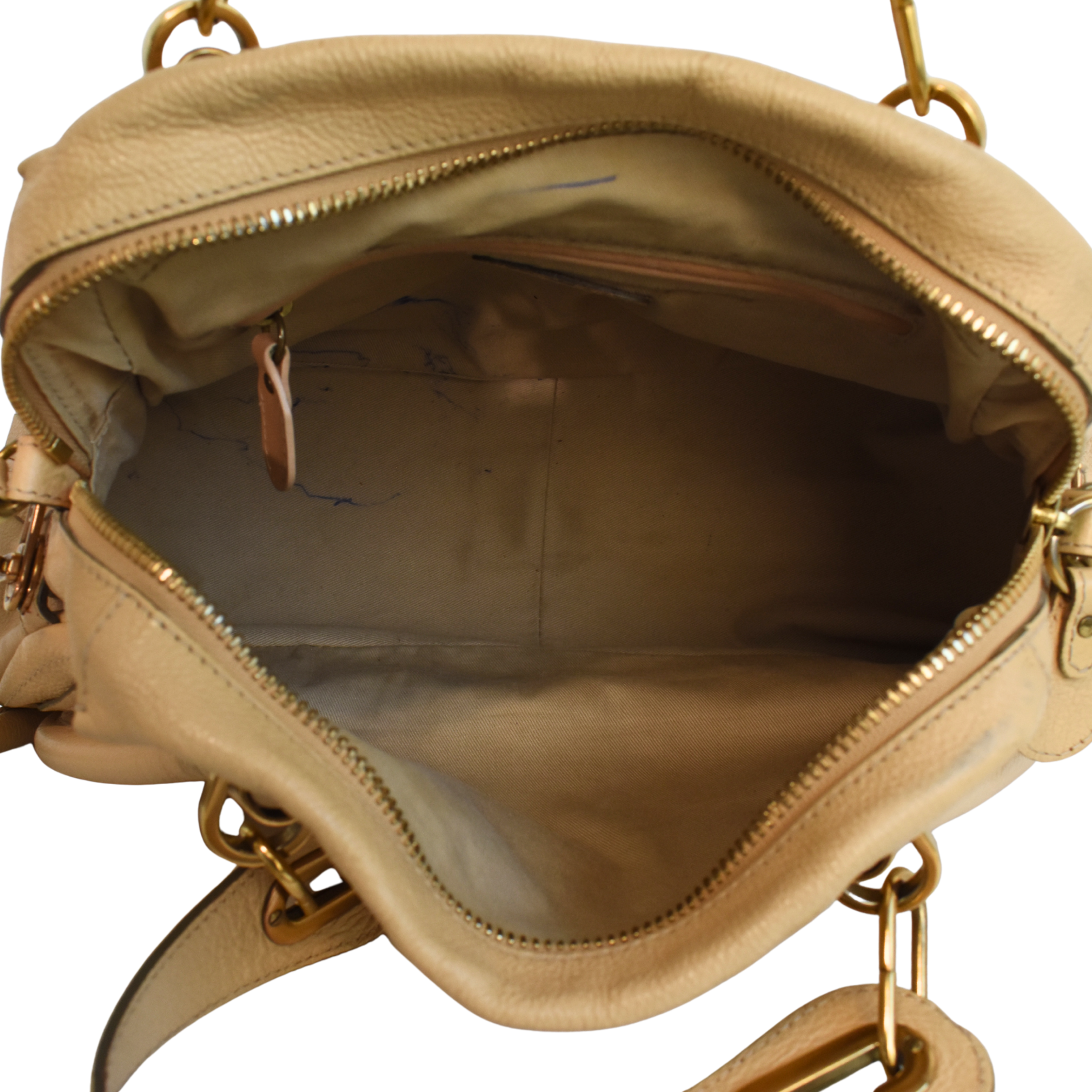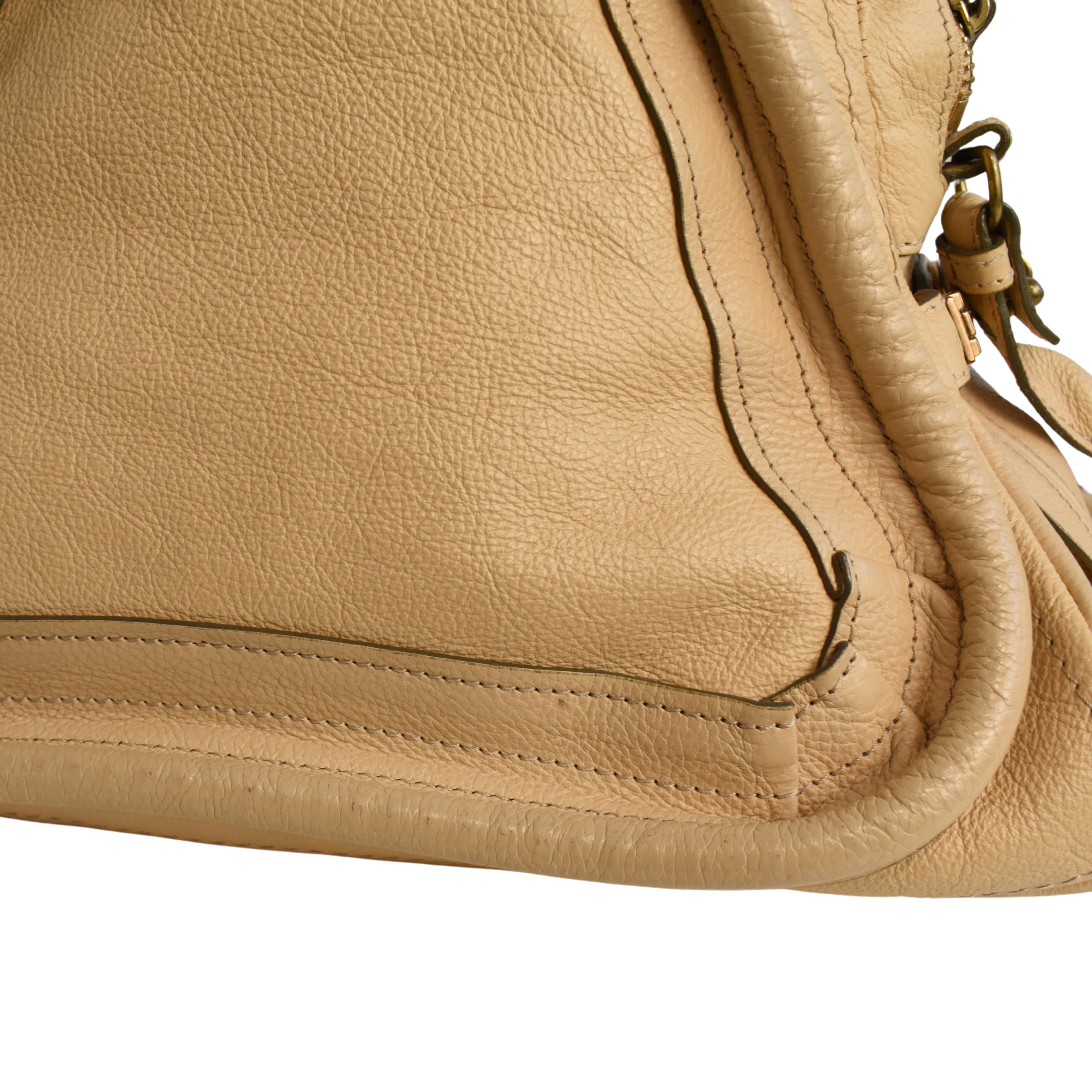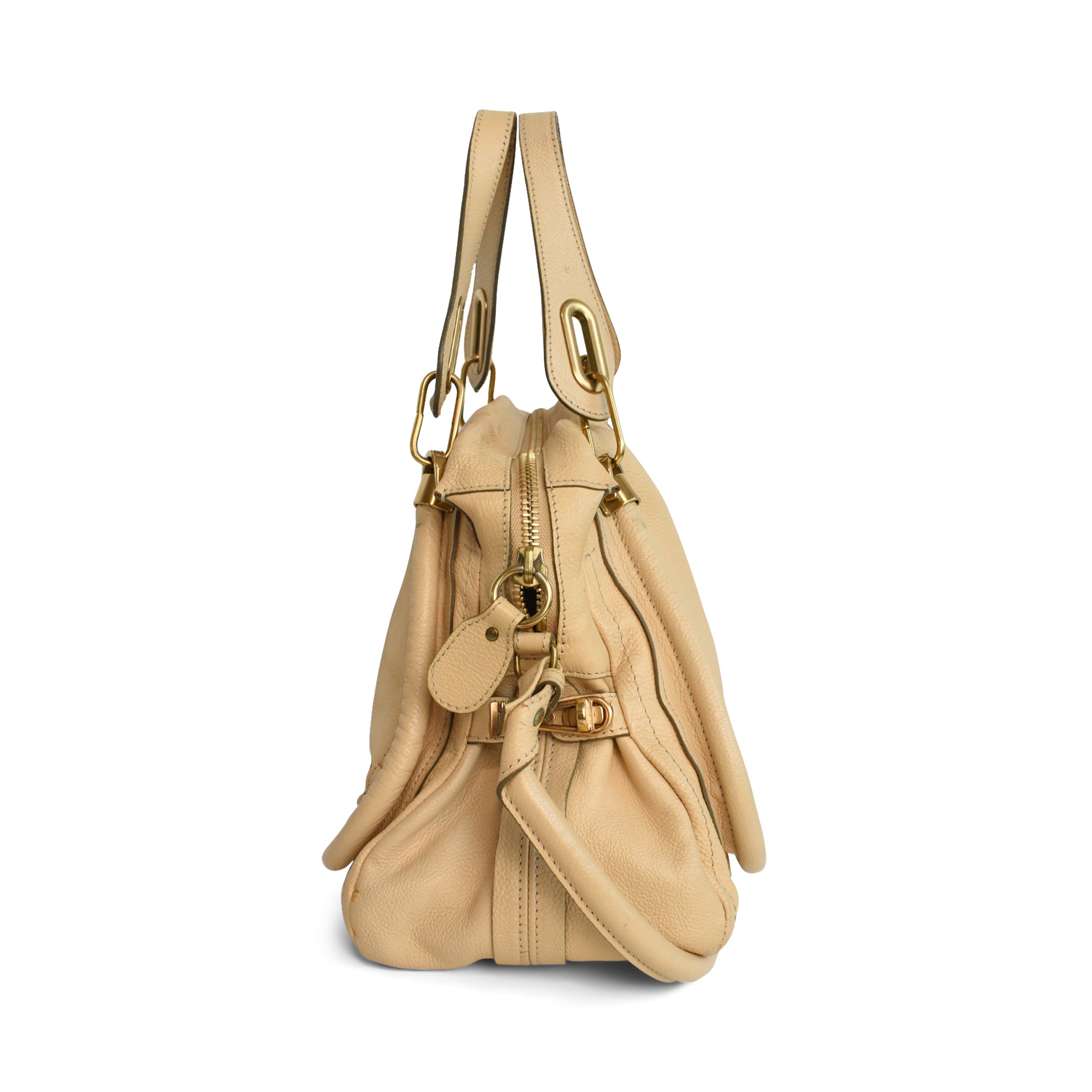 Chloe 'Paraty' bag in light beige grained leather with aged gold hardware and signature raised trim detail. Features a zip pocket with cream fabric lining, flat top handles, and a removable shoulder strap. The gussets have small turnlock clasps that can be opened to slightly expand the bag.