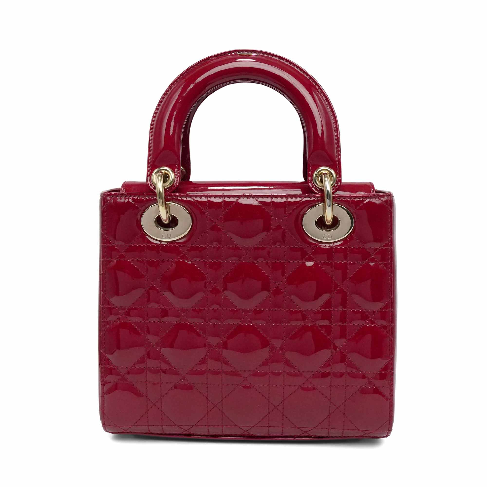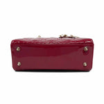 Christian Dior 'Lady Dior' small handbag in red patent leather with all-over cannage quilting, dual top handles with gold hardware, and signature 'Dior' logo charms. The bag has a hidden flap closure revealing a suede lined interior with zip and slip pockets.