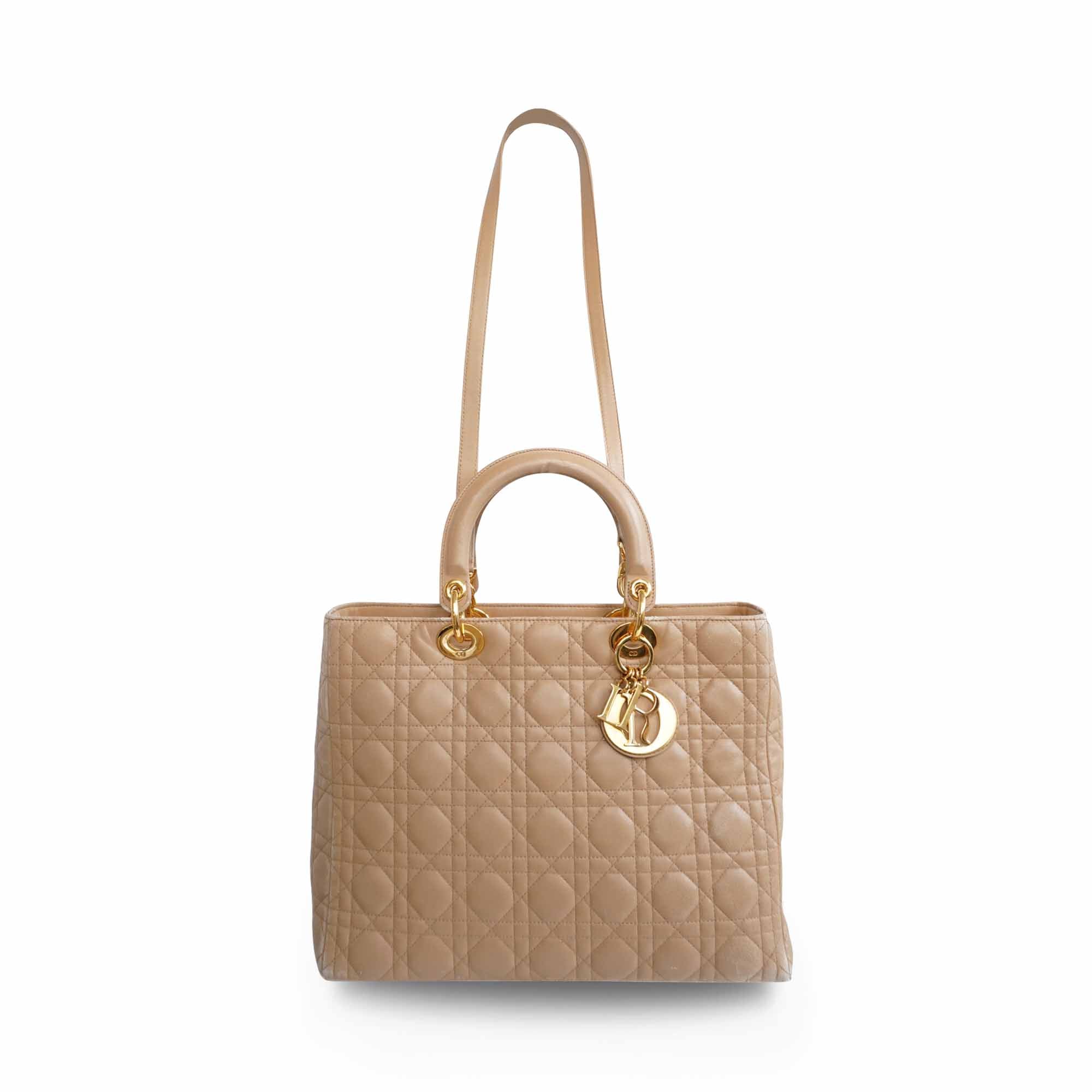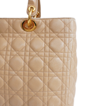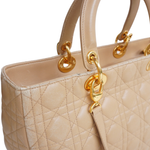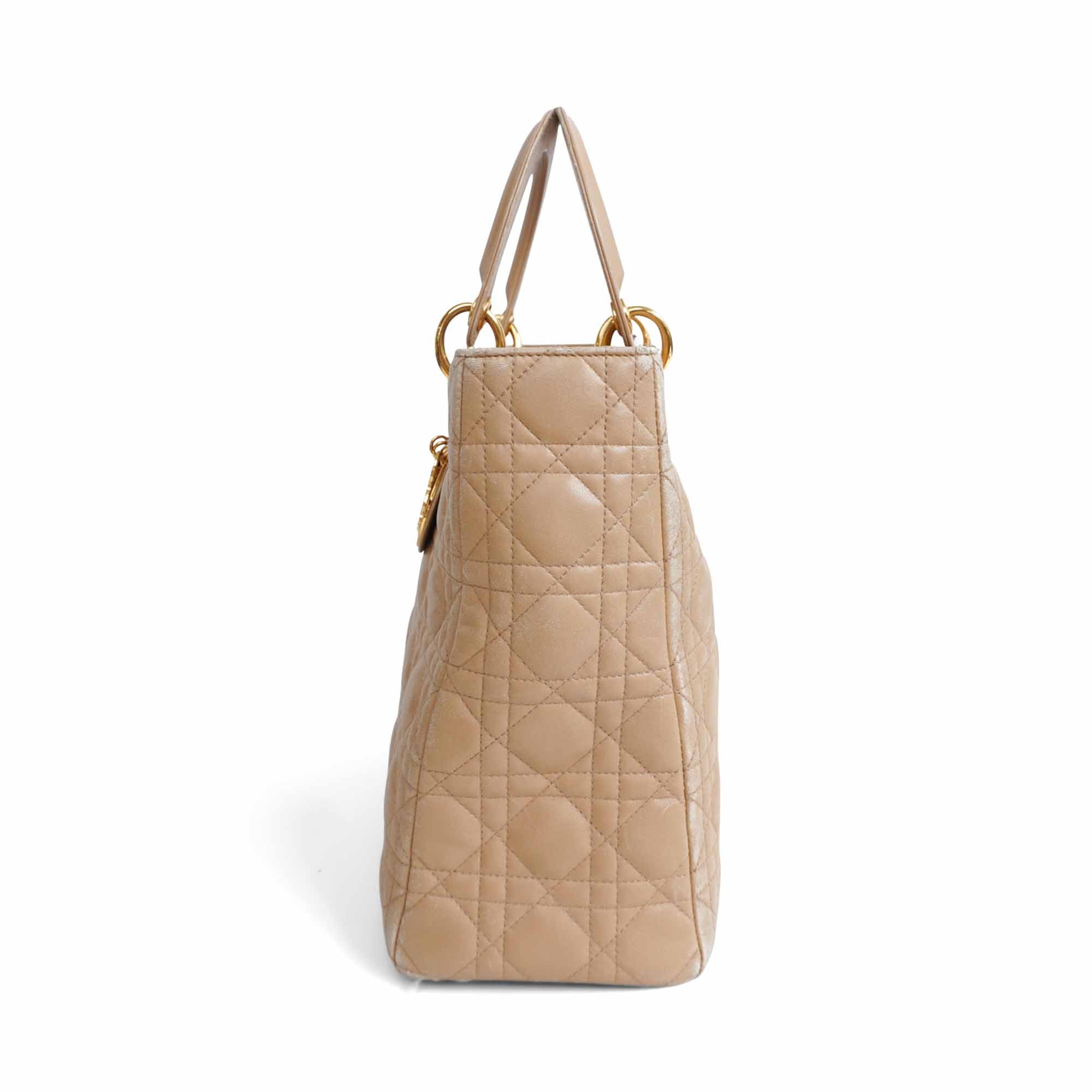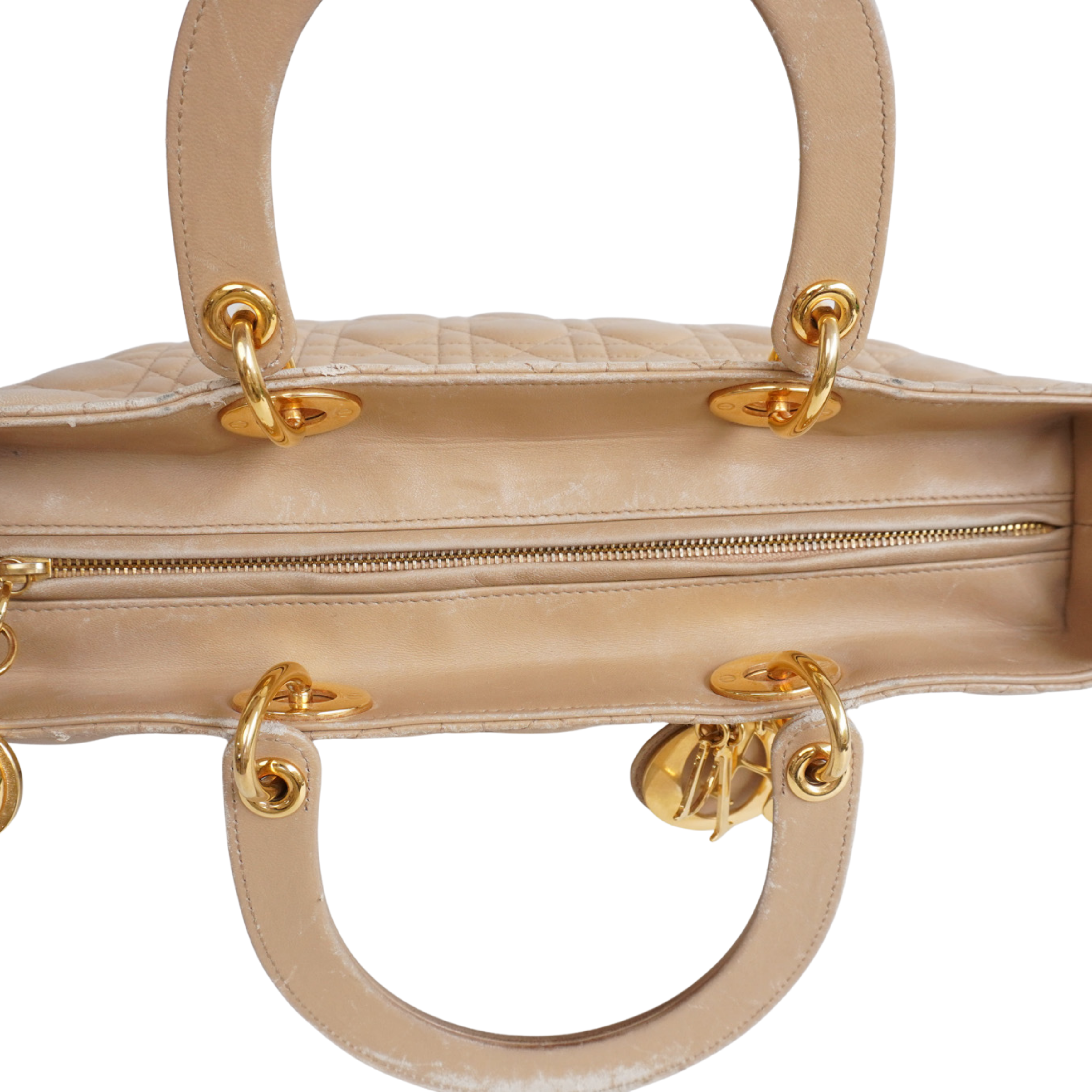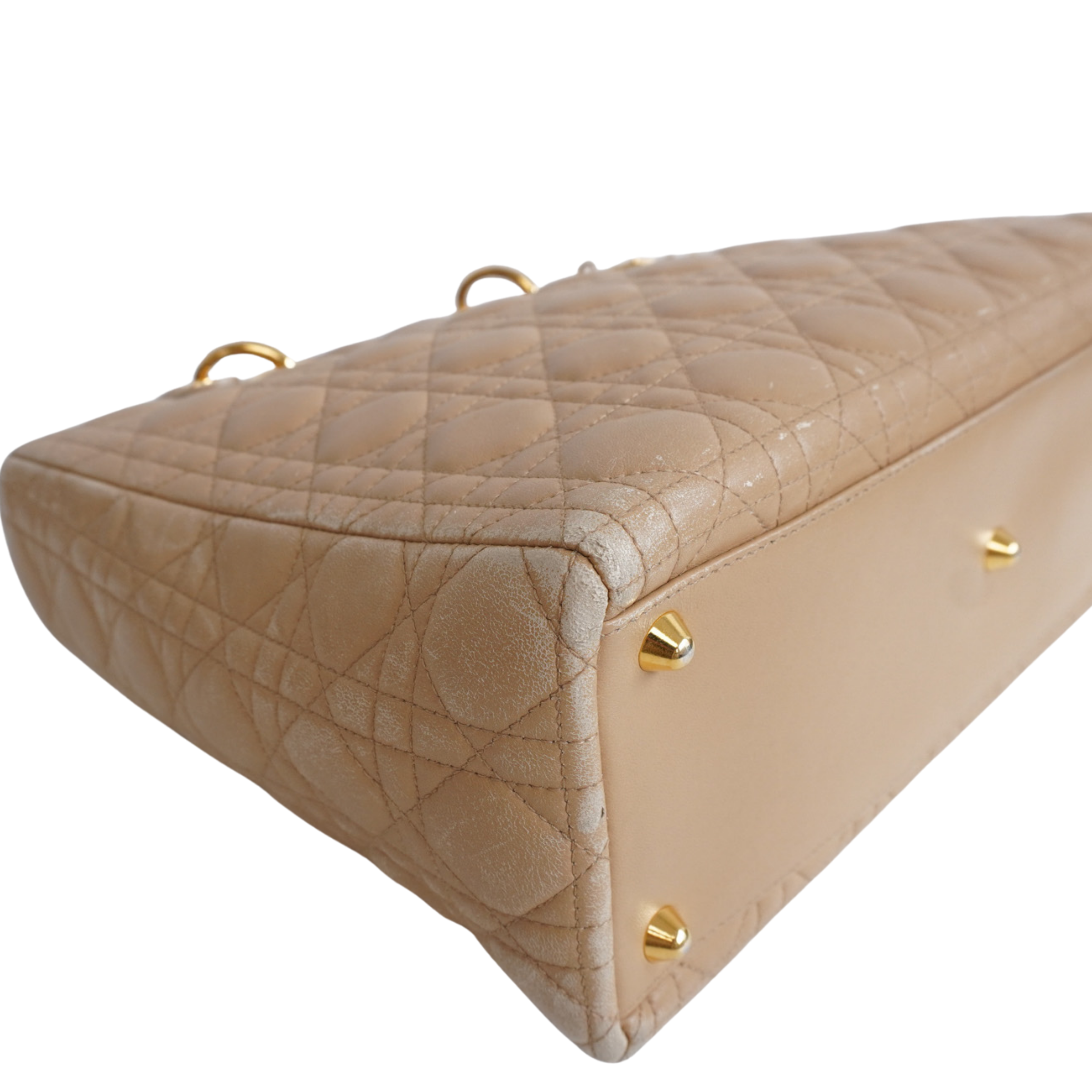 Christian Dior 'Large Lady Dior' handbag in beige cannage quilted leather with gold hardware and letter logo charm. Features a zip closure and jacquard cannage grey canvas lining. The bag has structured top handles and a removable shoulder strap.
