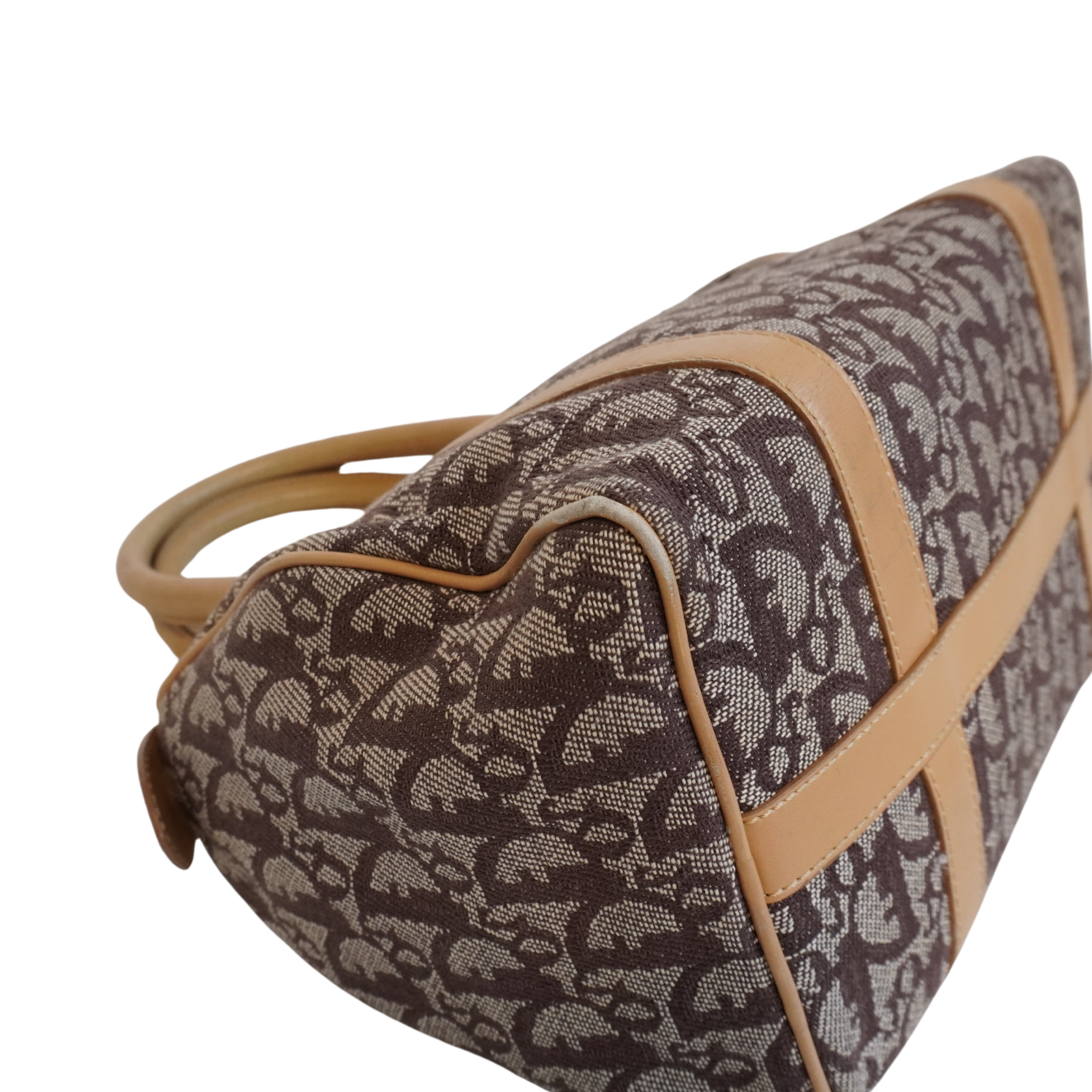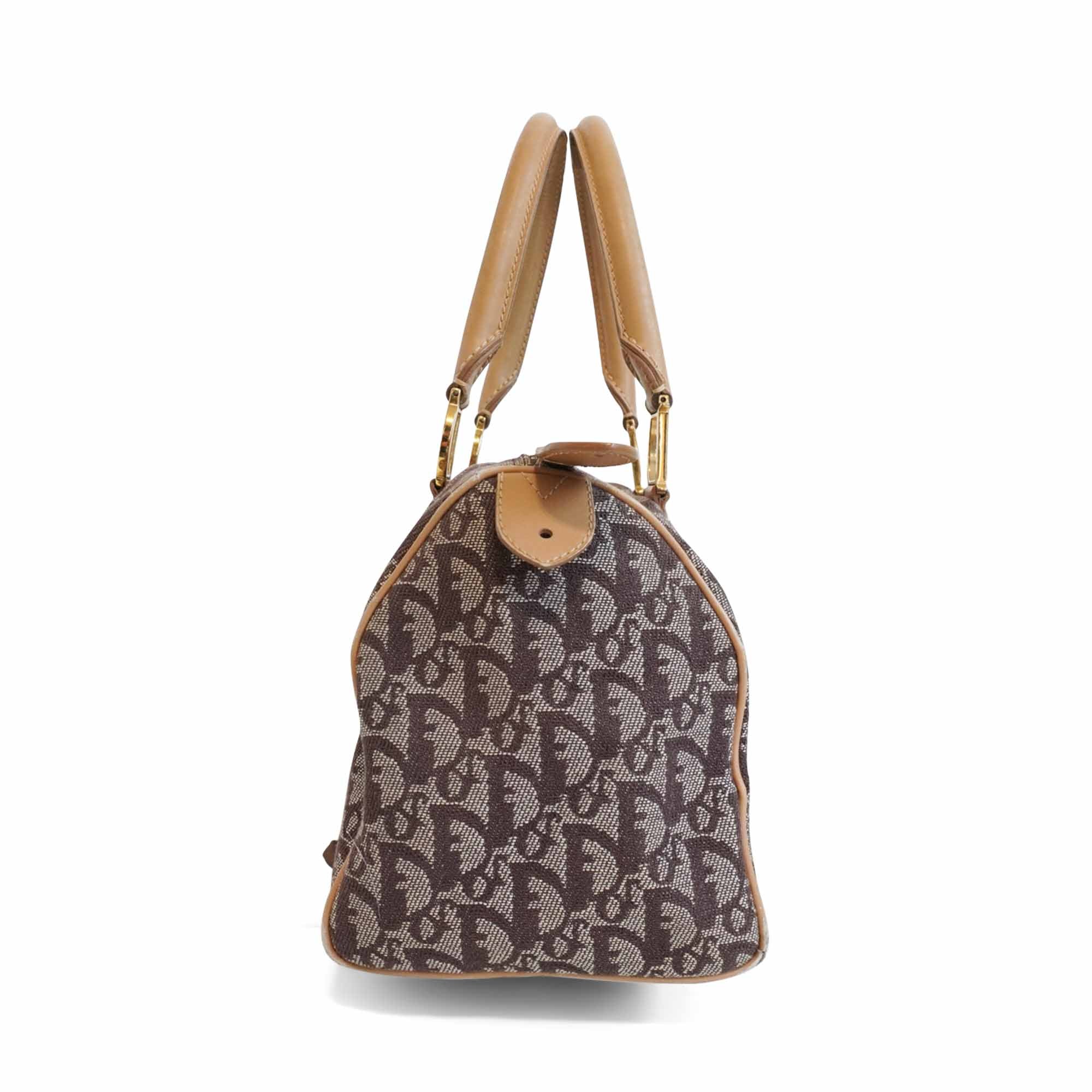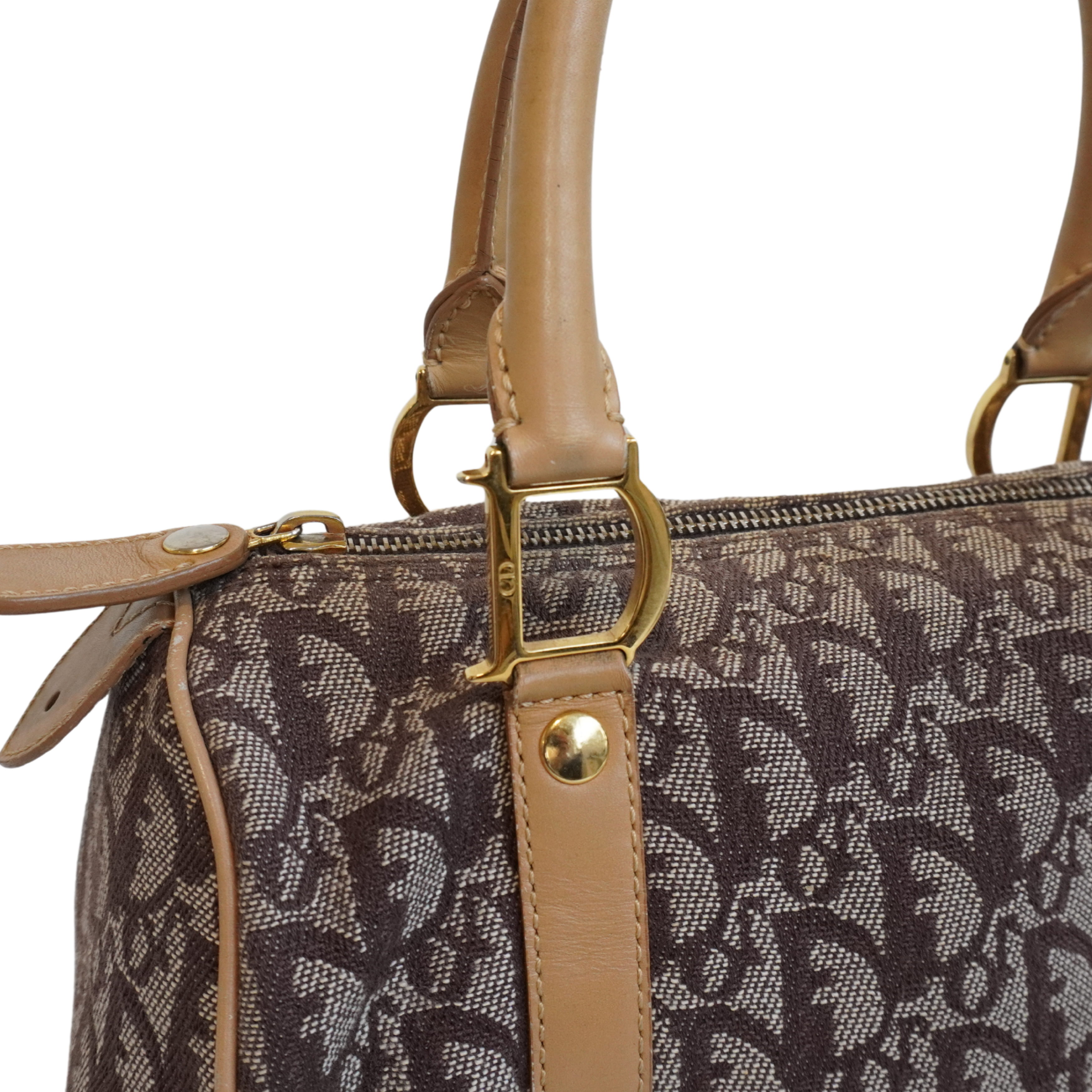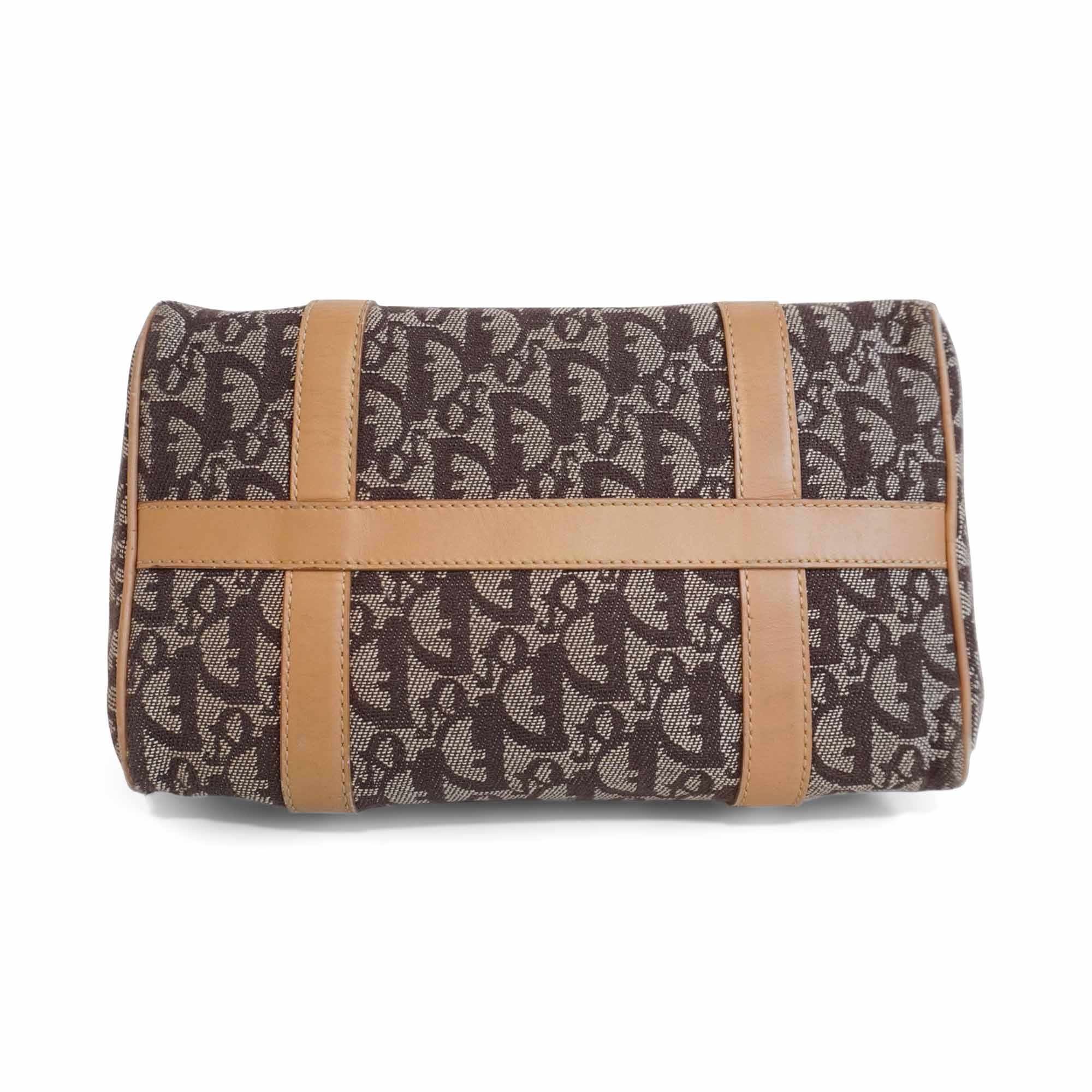 Christian Dior 'Trotter' Boston Bag in brown monogram canvas with beige rolled leather dual handles and trim with logo D rings in soft gold hardware. Featuring a top zip that opens to a brown canvas lining with two slip pockets.