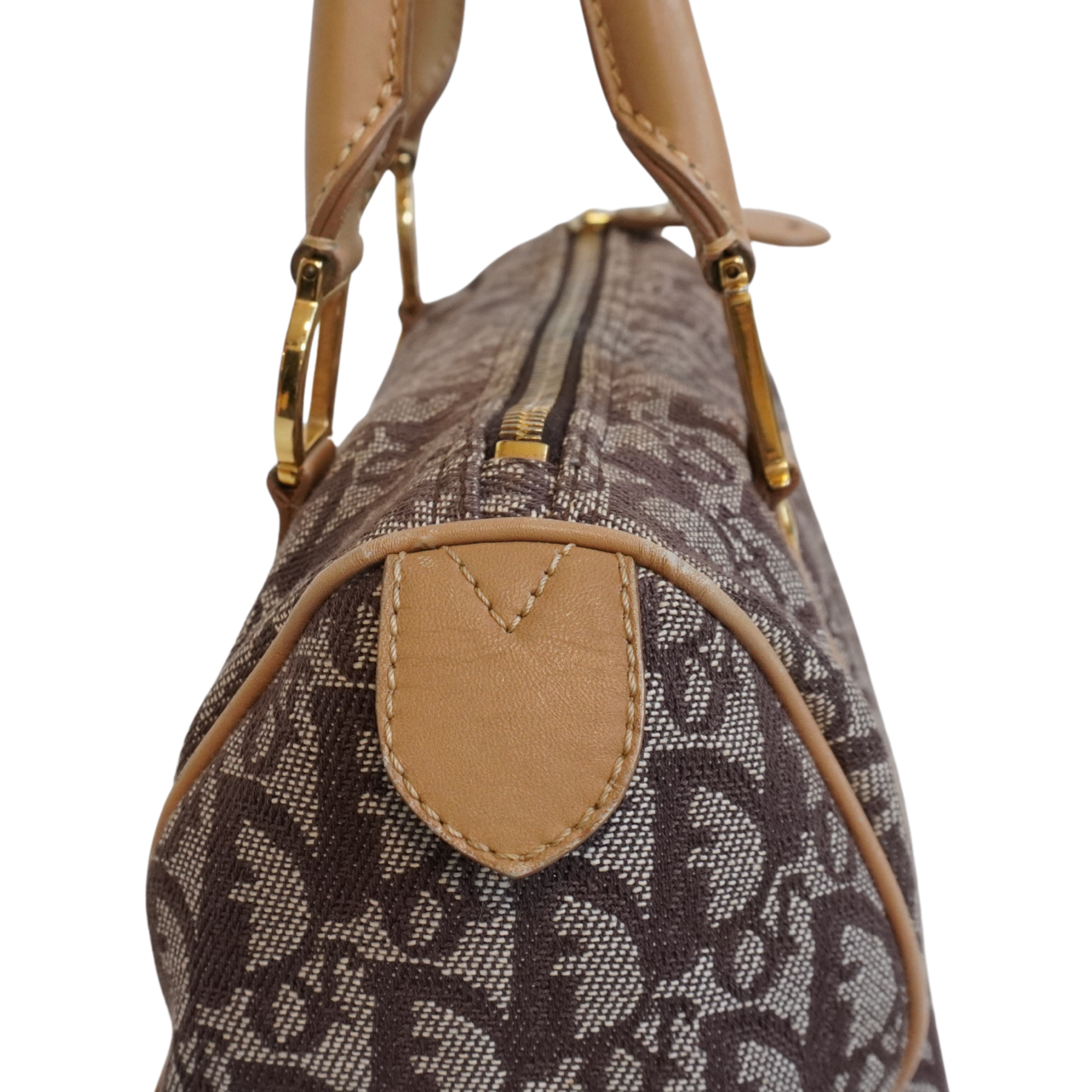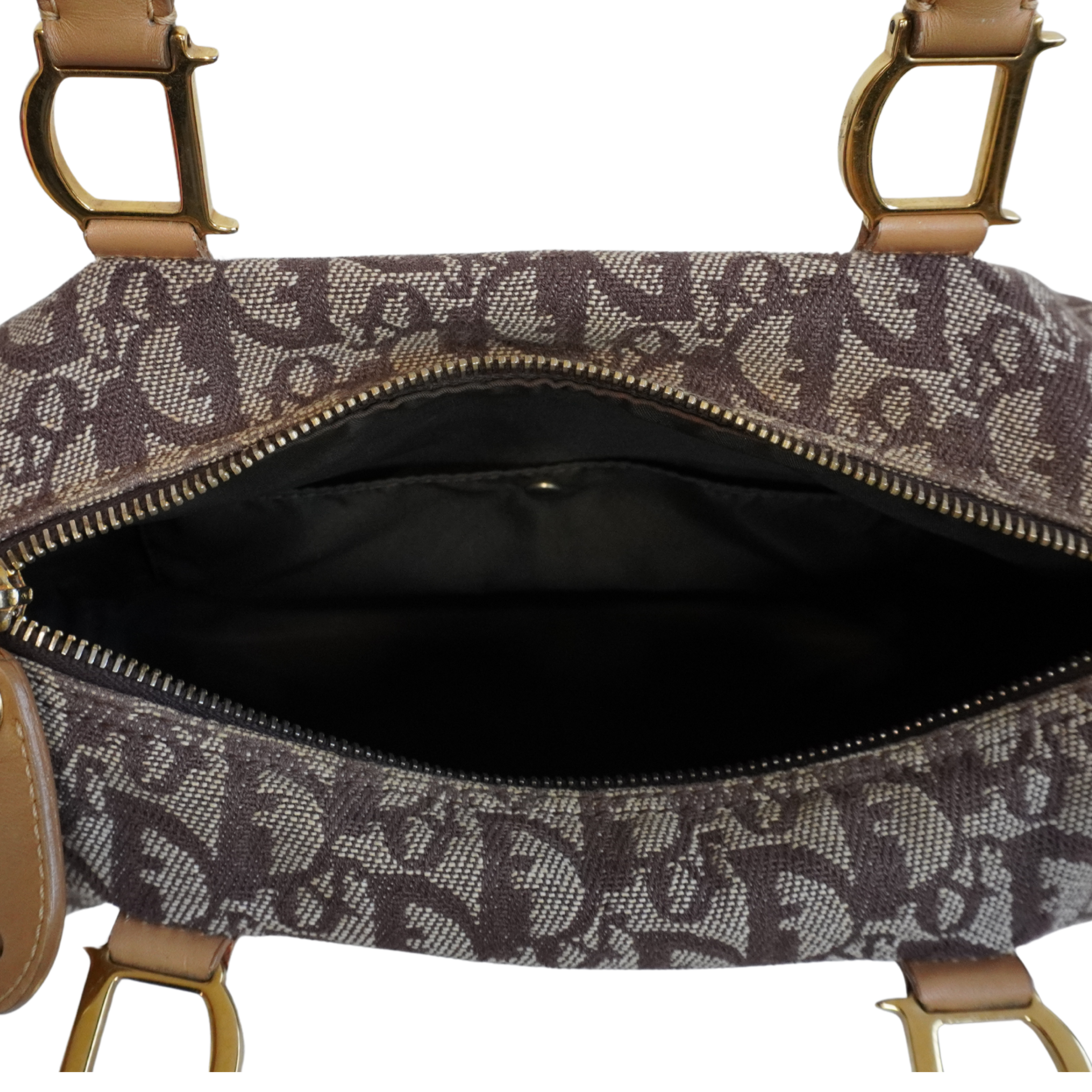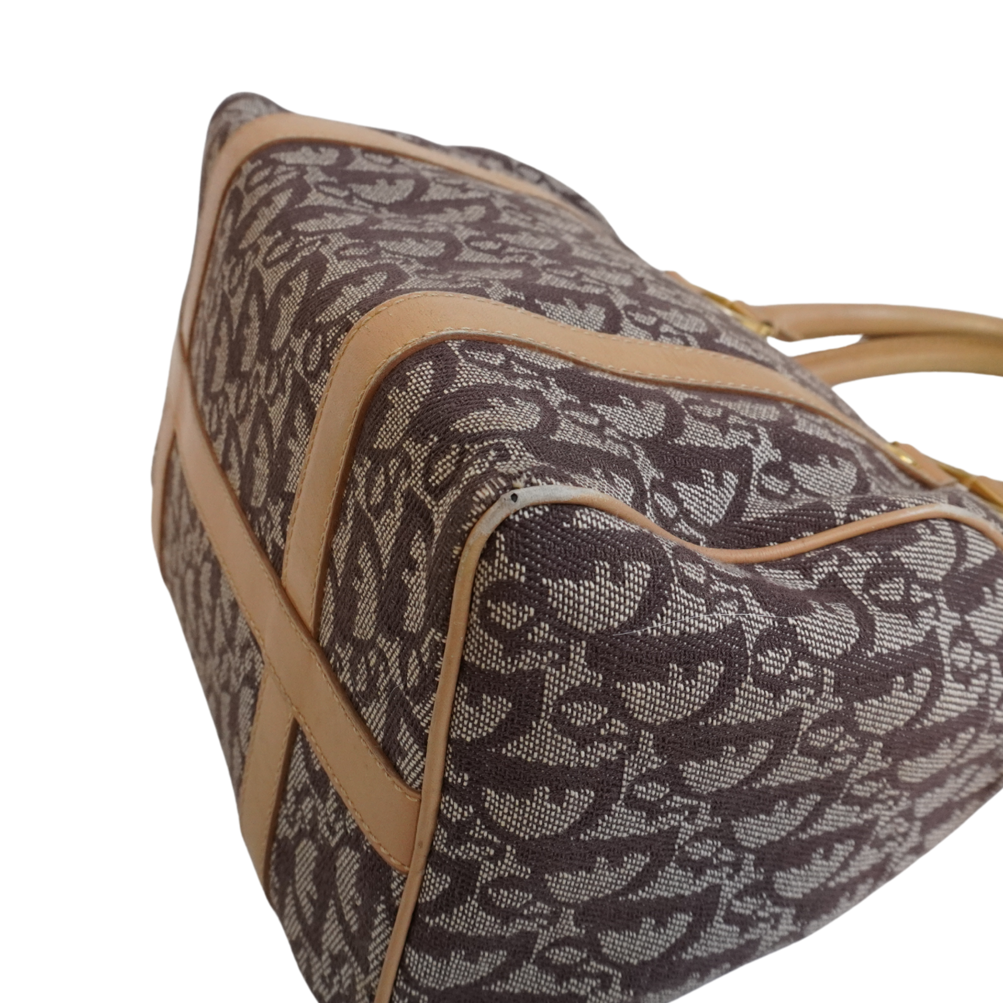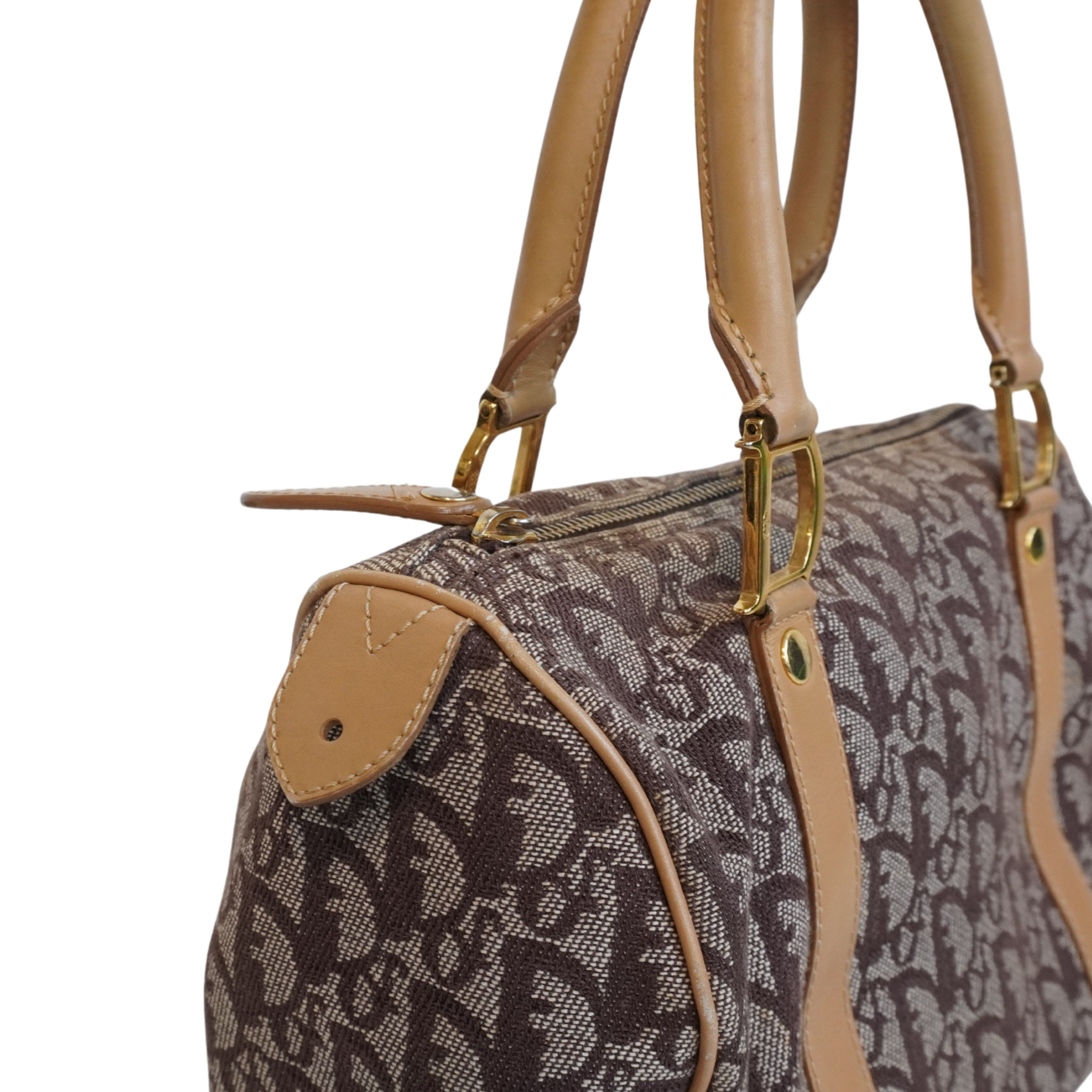 Christian Dior 'Trotter' Boston Bag in brown monogram canvas with beige rolled leather dual handles and trim with logo D rings in soft gold hardware. Featuring a top zip that opens to a brown canvas lining with two slip pockets.