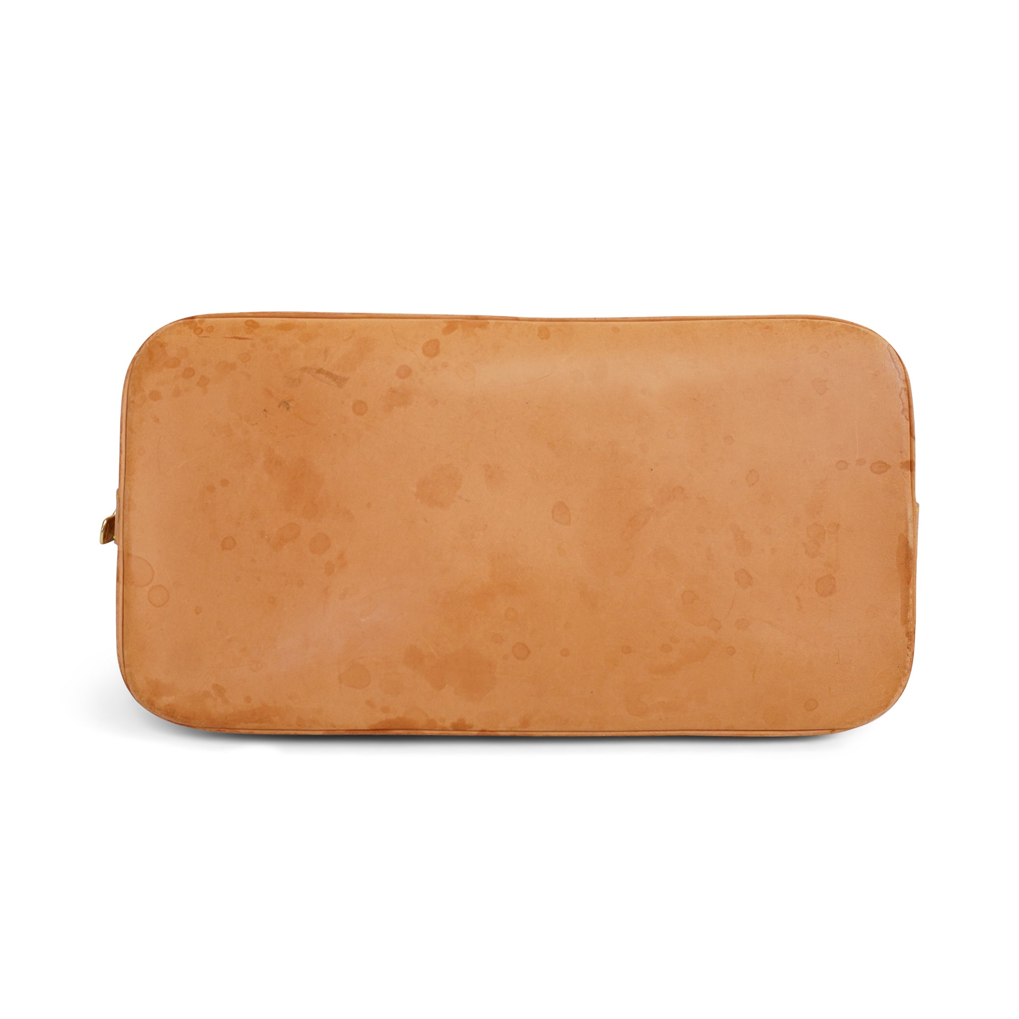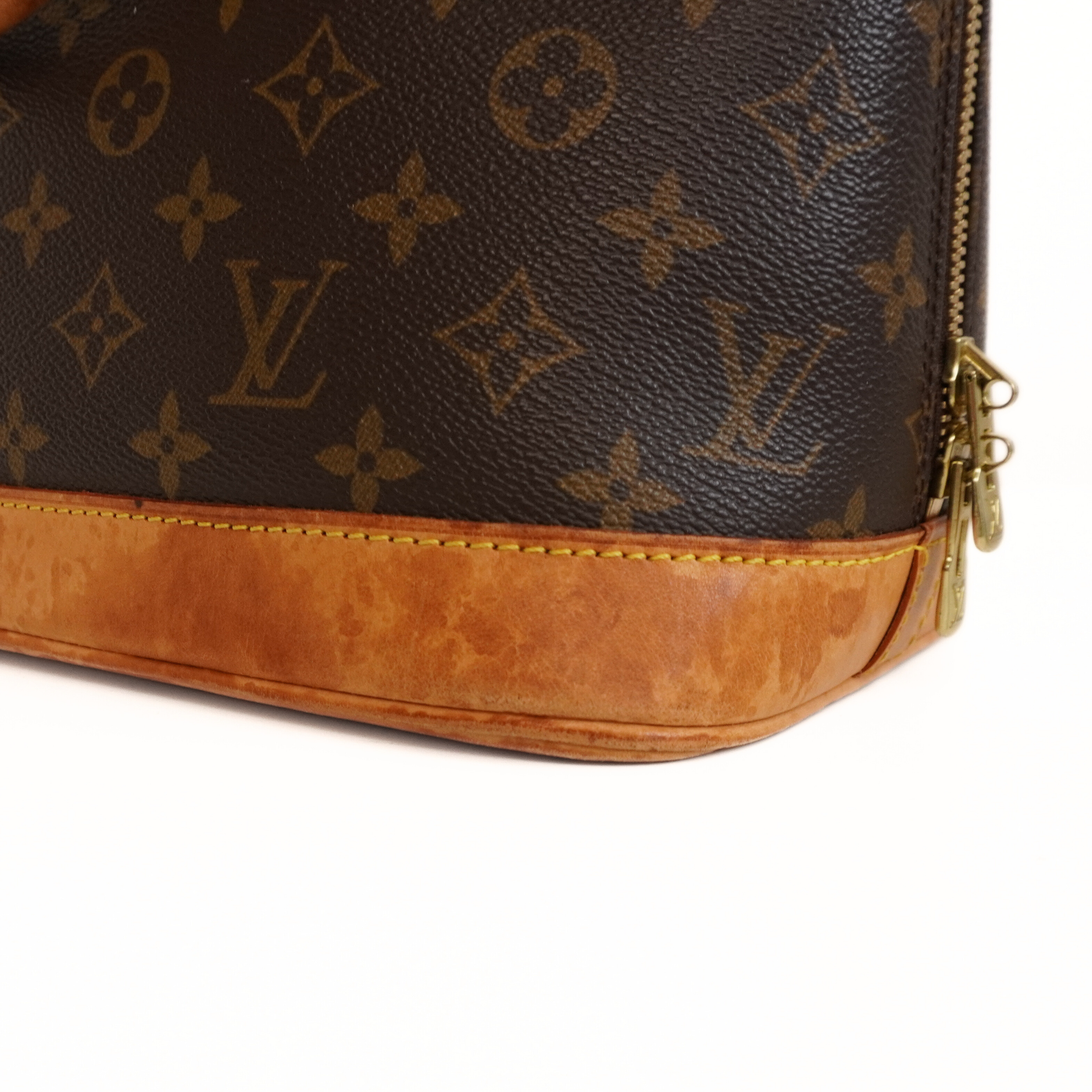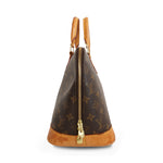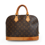 Louis Vuitton 'Alma PM' handbag in monogram coated canvas with vachetta leather handles and base. Features a two-way zipper closure and brown canvas lining with interior slip pocket. The handles have additional D-rings for attaching an optional crossbody strap (not included).