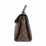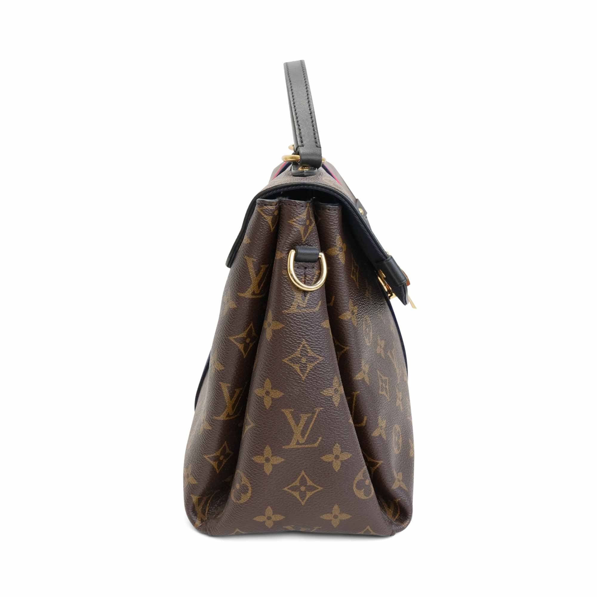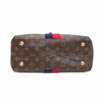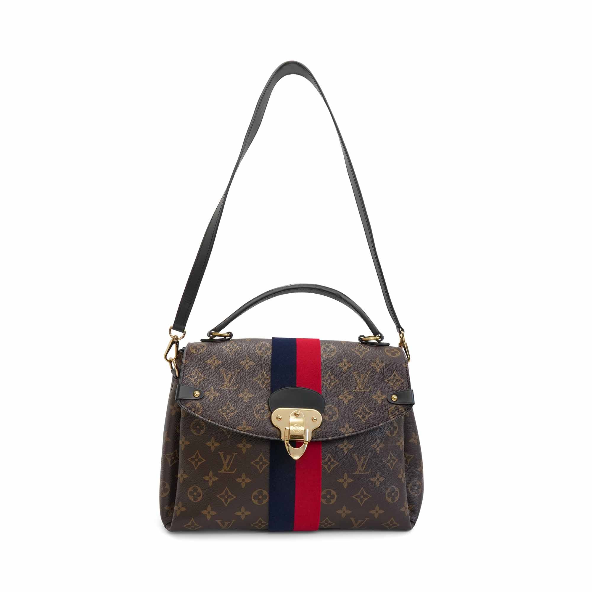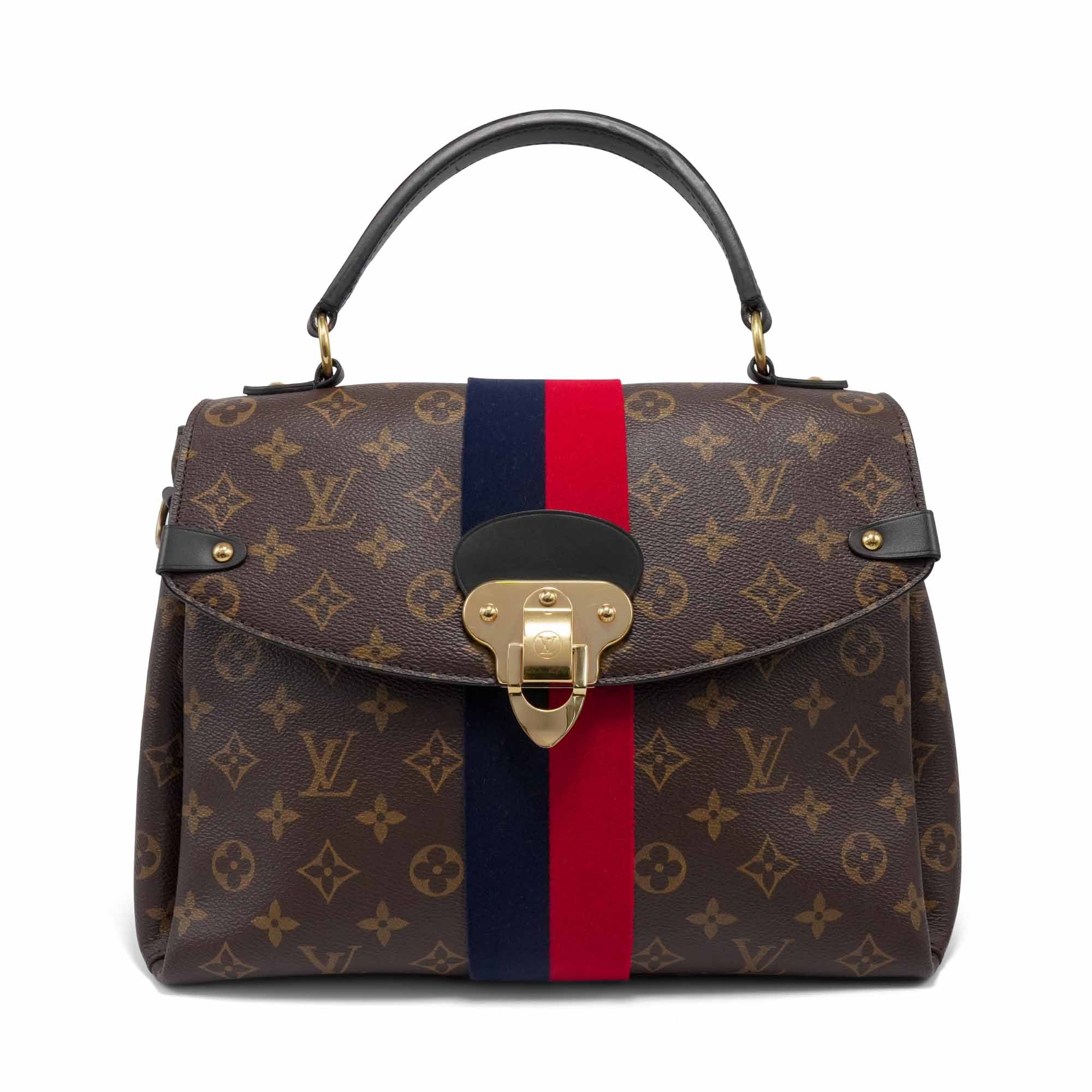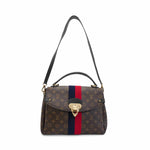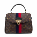 Louis Vuitton 'Gorgeous MM' handbag in brown monogram coated canvas with black leather trim, a leather top handle and removable shoulder strap, a navy and red velvet stripe, and a magnetic latch closure in gold hardware. The interior is lined with navy canvas and has dual main compartments with a zip pocket.