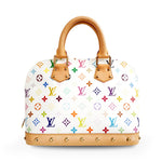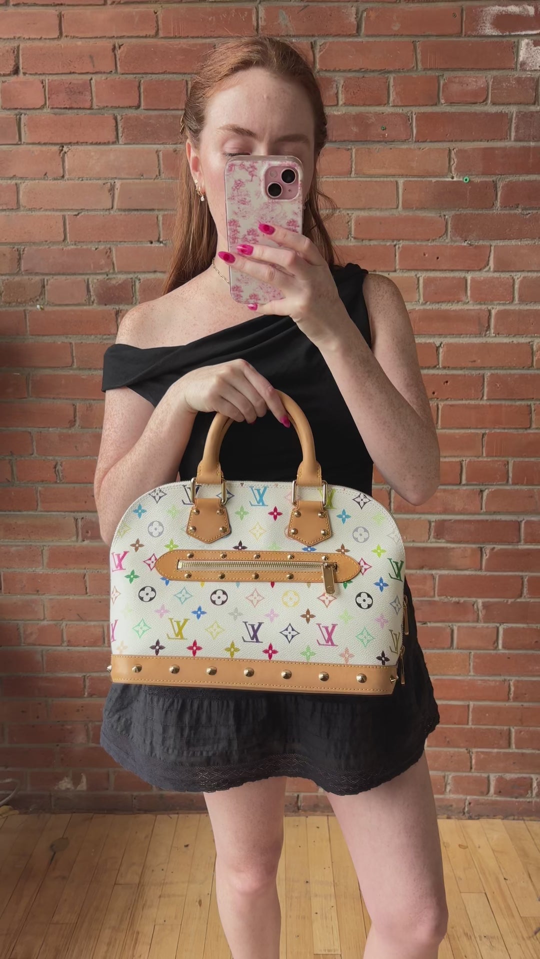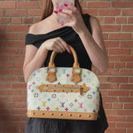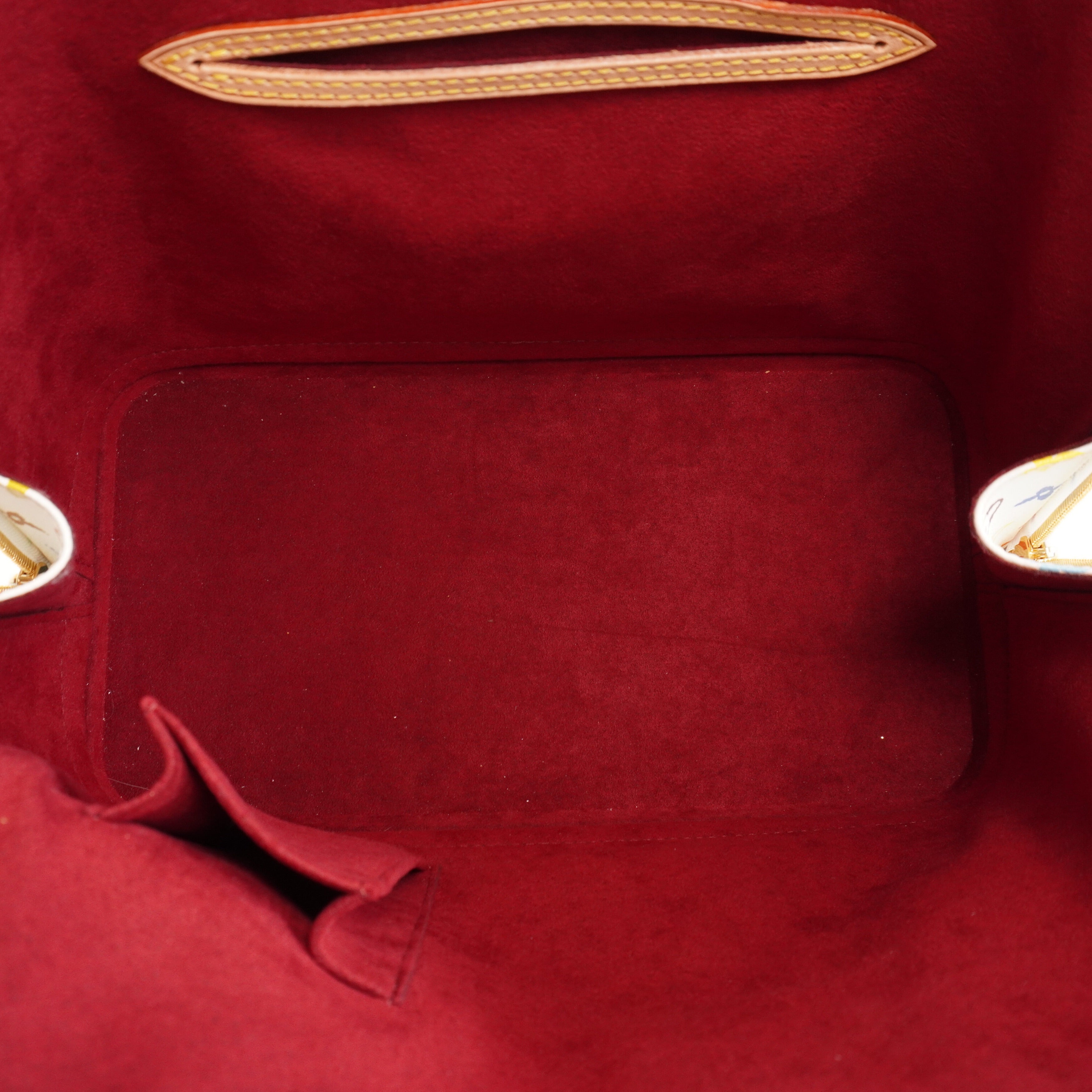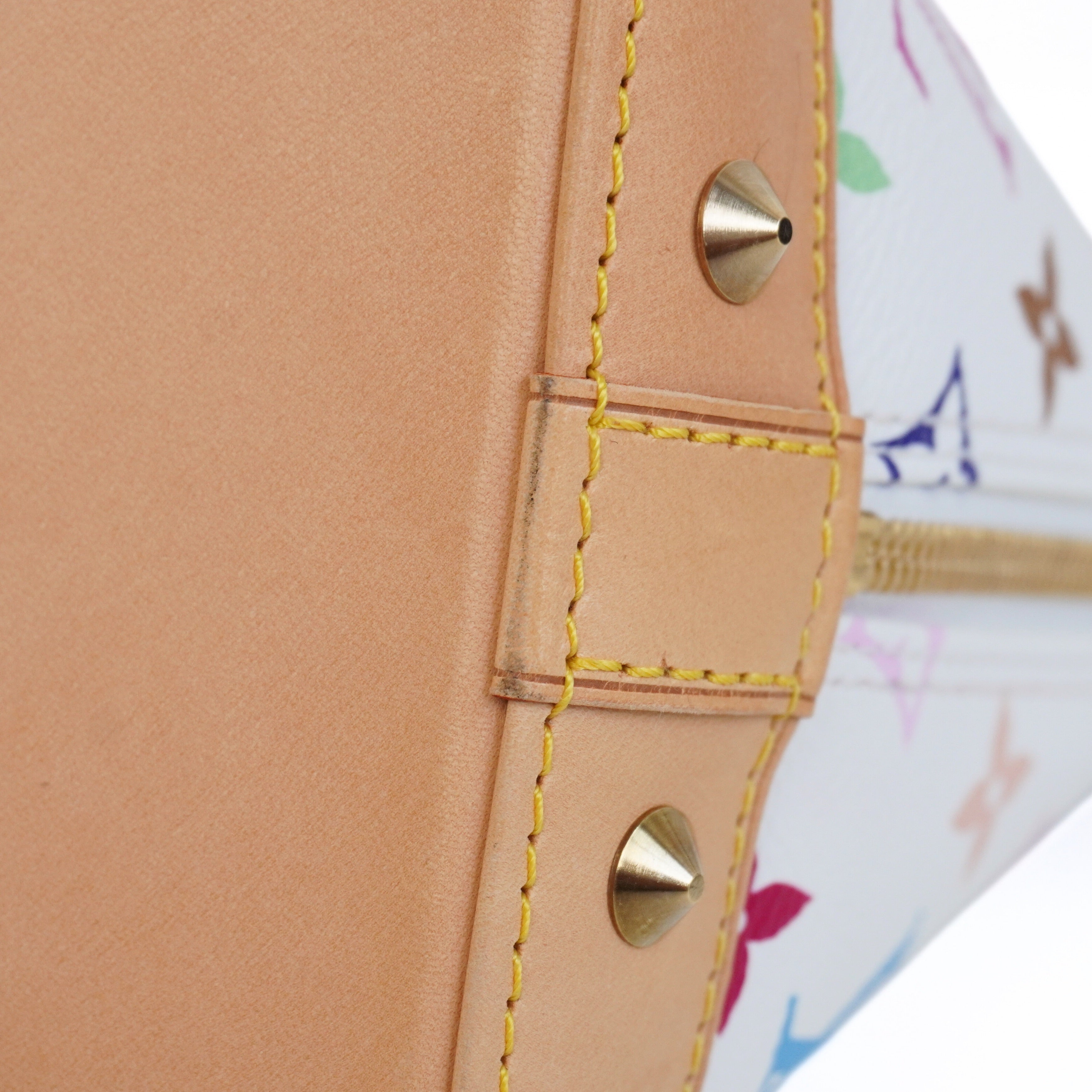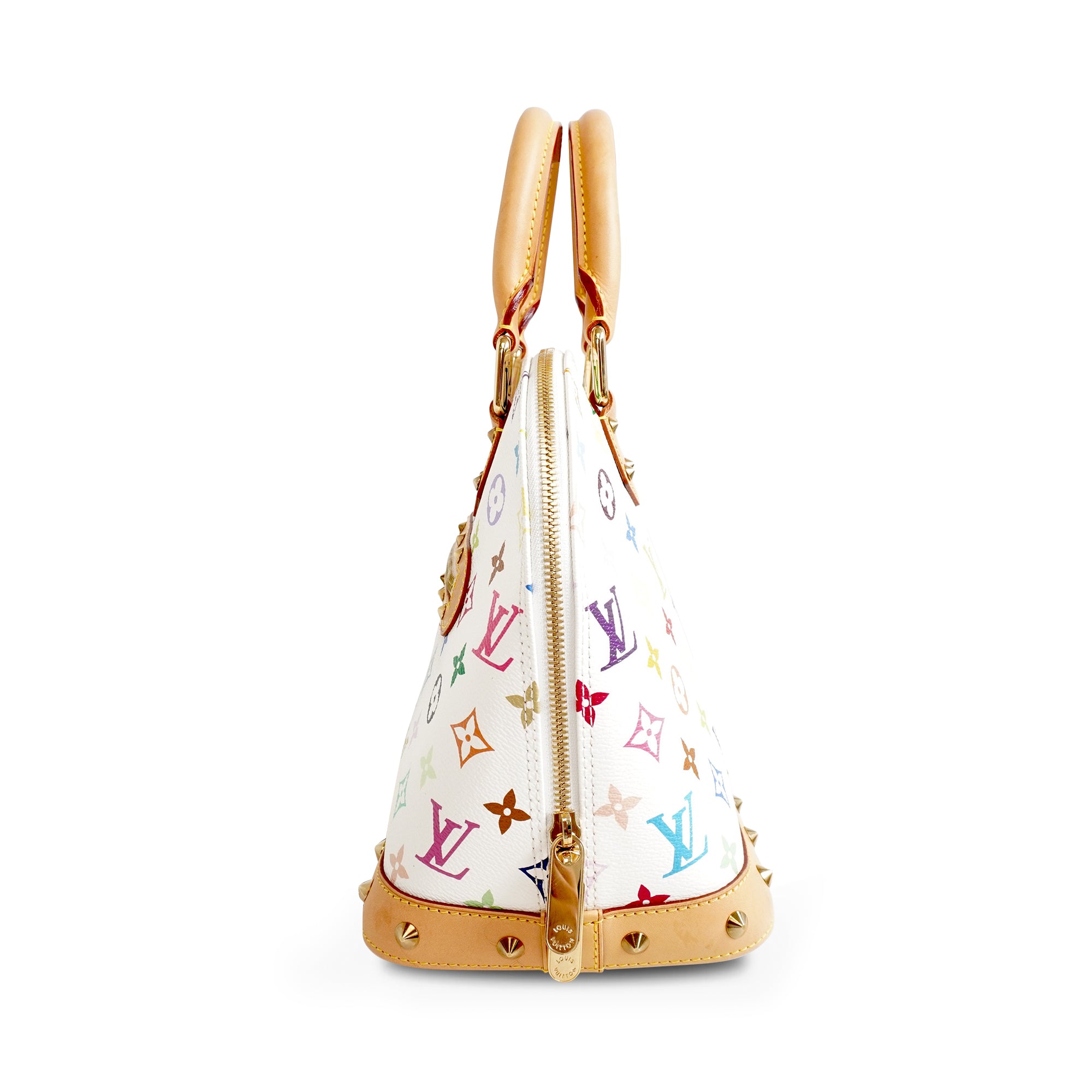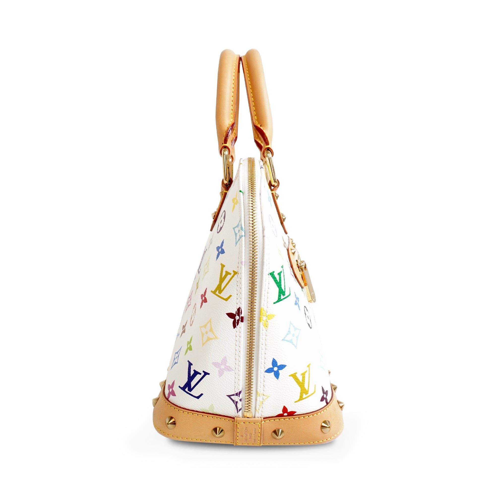 Louis Vuitton x Takashi Murakami 'Alma' handbag in white multicolour monogram coated canvas with vachetta leather trim and handles. Features gold spike studs, a front zip pocket, and two-way main zip pocket with red suede lining.