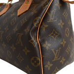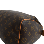 Louis Vuitton 'Speedy 25' handbag in monogram coated canvas with vachetta leather top handles, brown leather piping and top zip closure. Interior features brown canvas lining and small interior slip pocket.