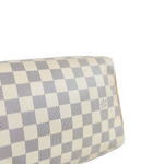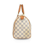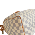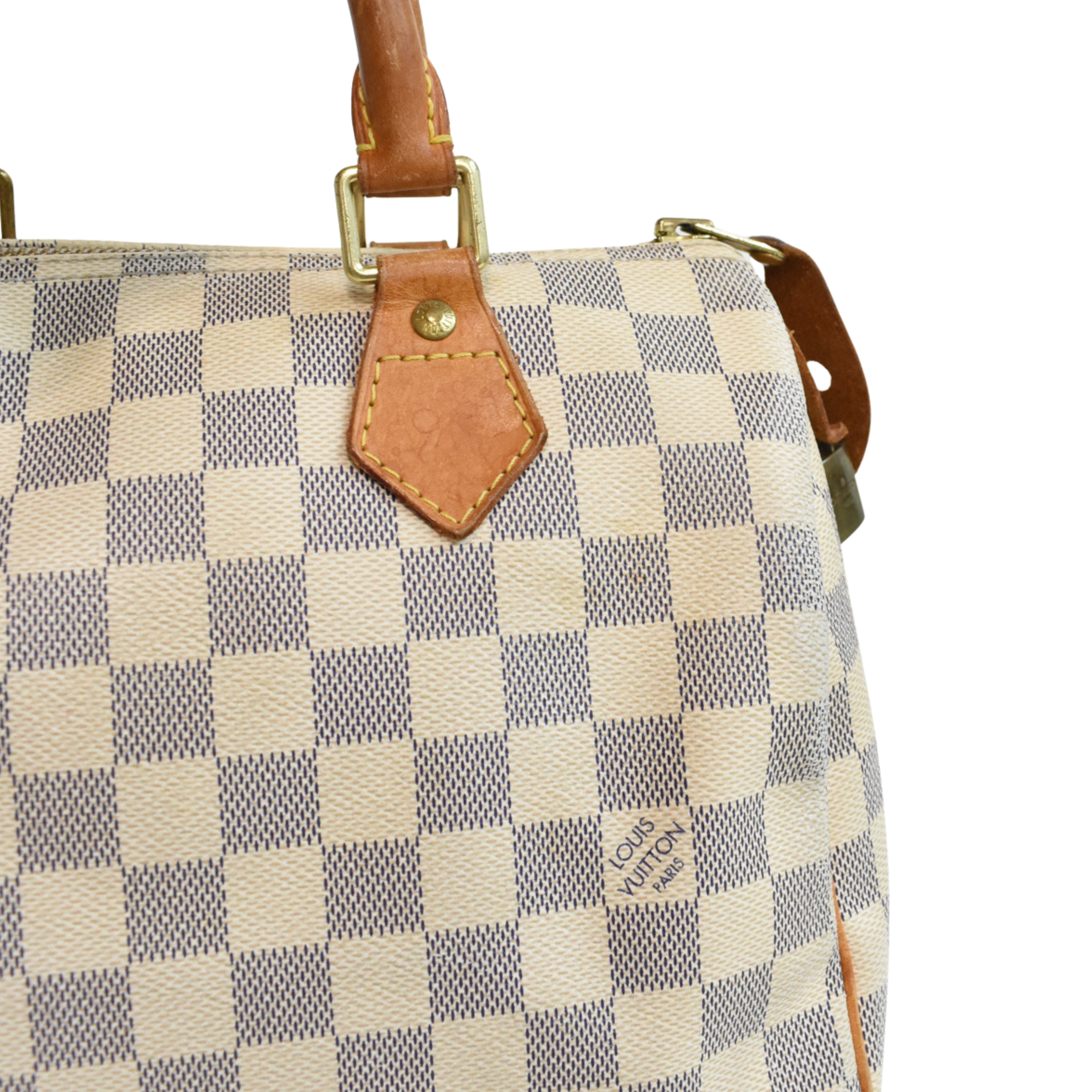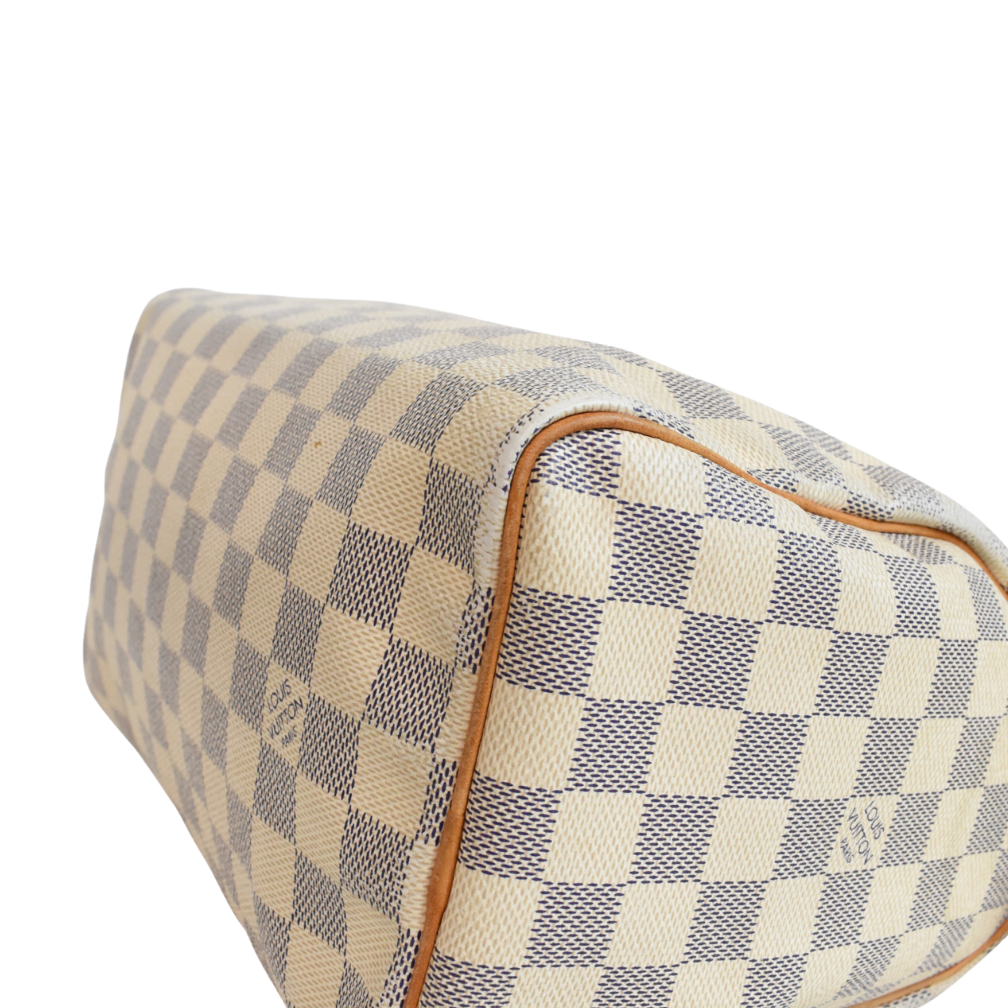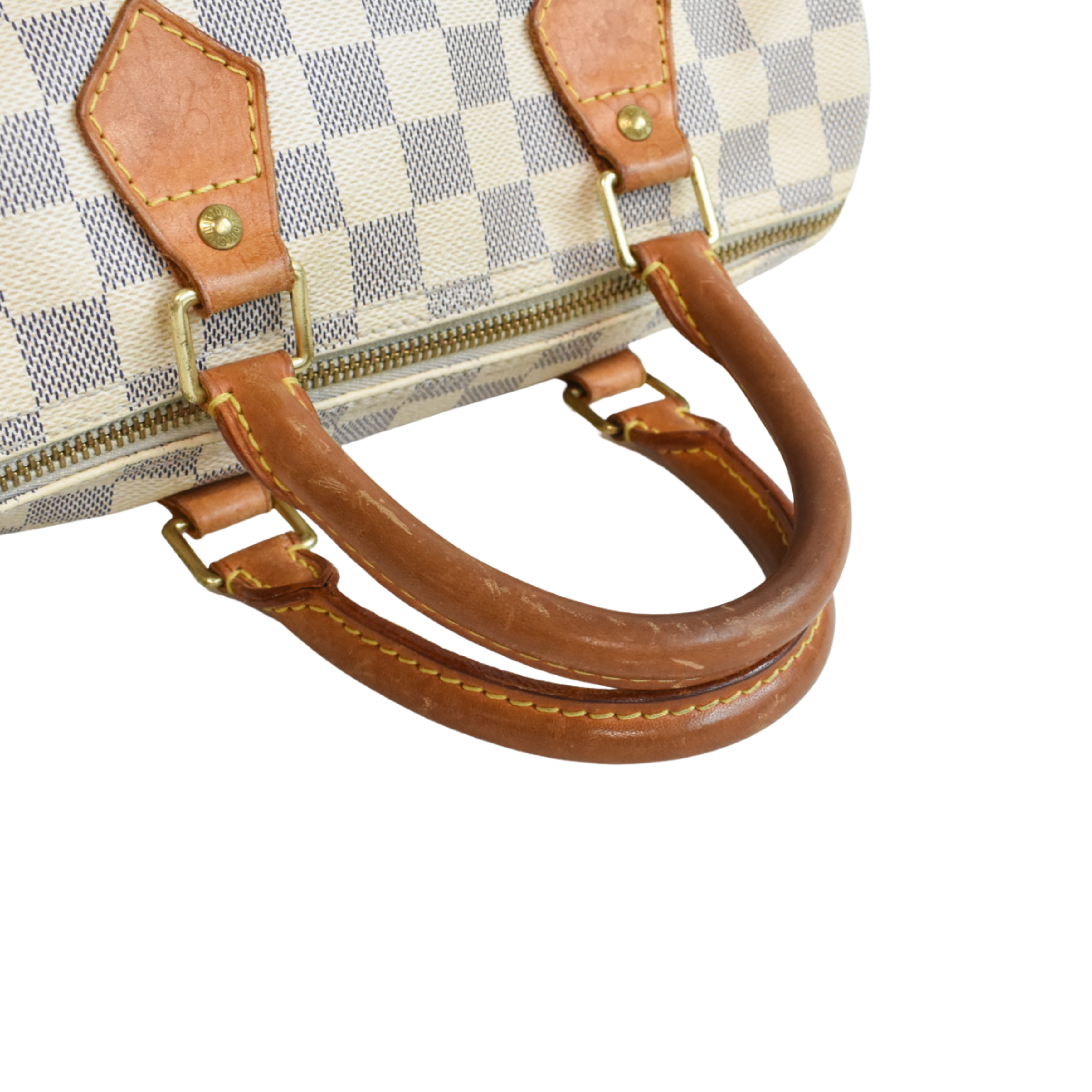 Louis Vuitton 'Speedy 25' handbag in damier azur coated canvas with a brown vachetta leather trim, dual rolled top handles, and a top zip opening in gold hardware revealing a beige canvas interior lining with a slip pocket.