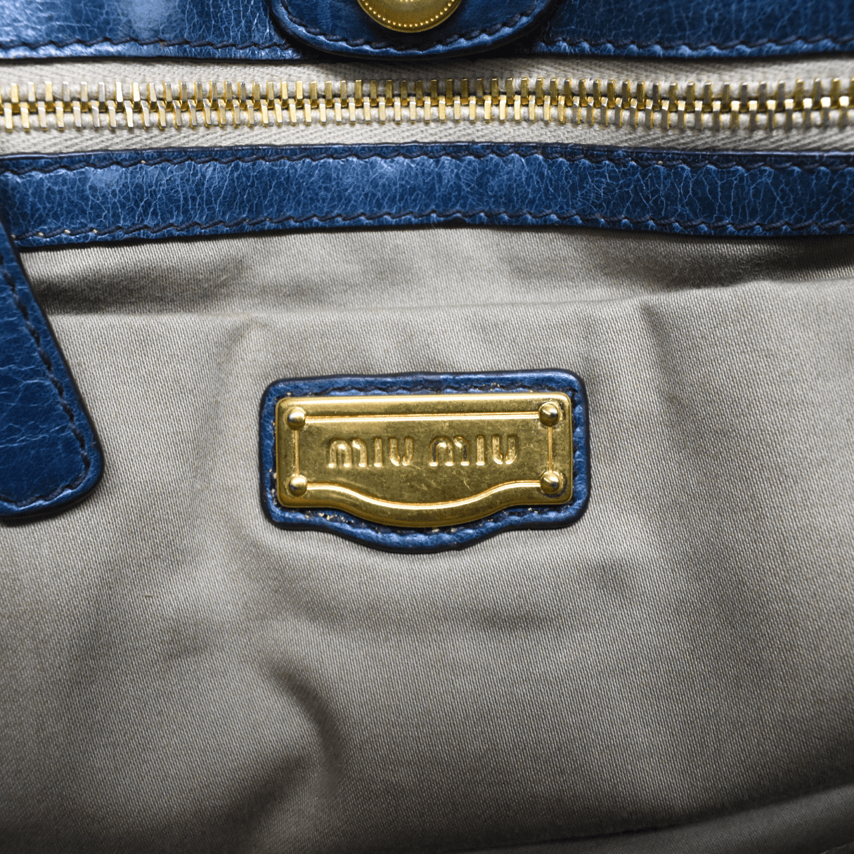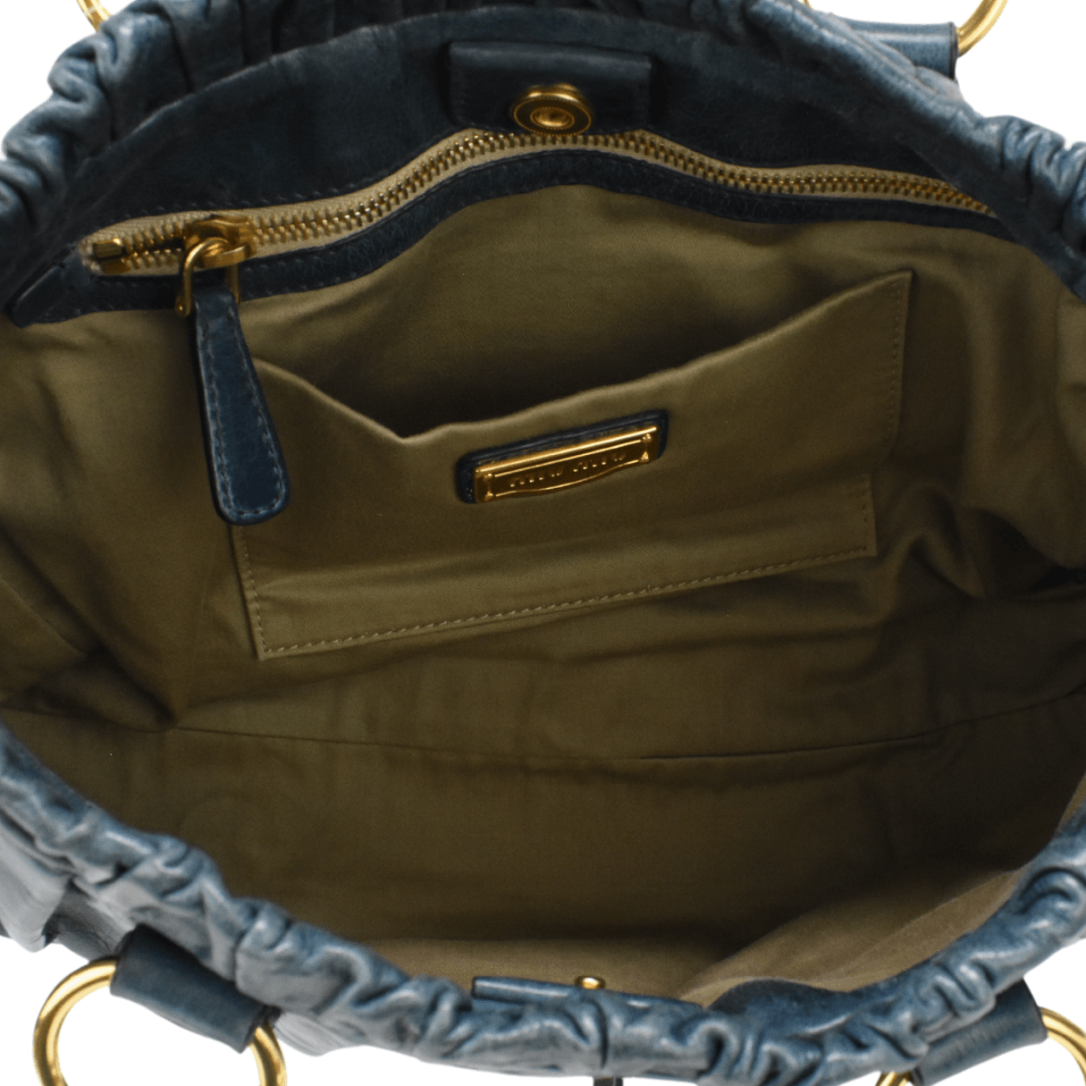 Miu Miu Handbag in teal pleated leather with a logo plaque in gold hardware, buckle detailing and dual top handles. Features a top zip closure, drawstring cod detailing on the sides, brown canvas lining and an inner zip pocket.