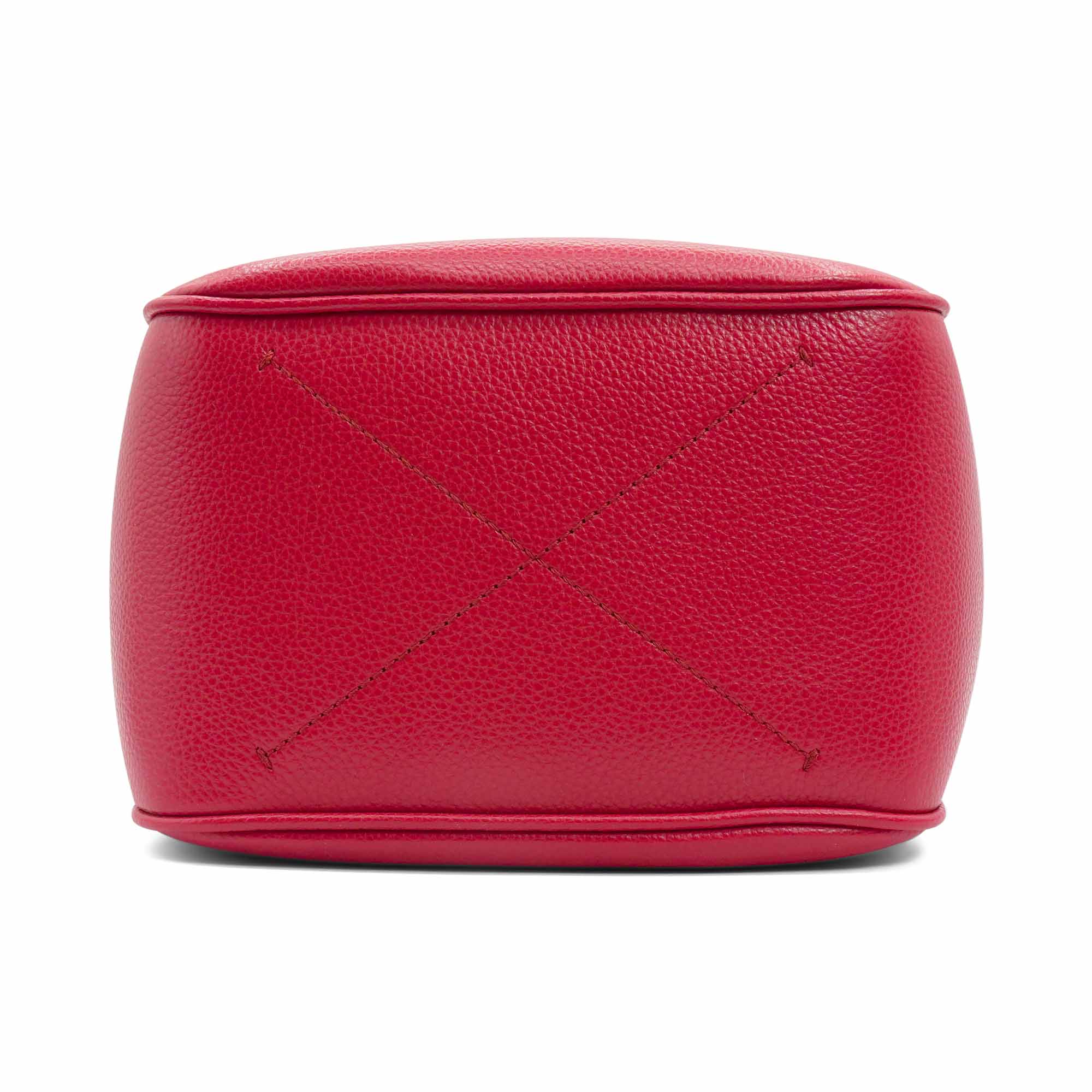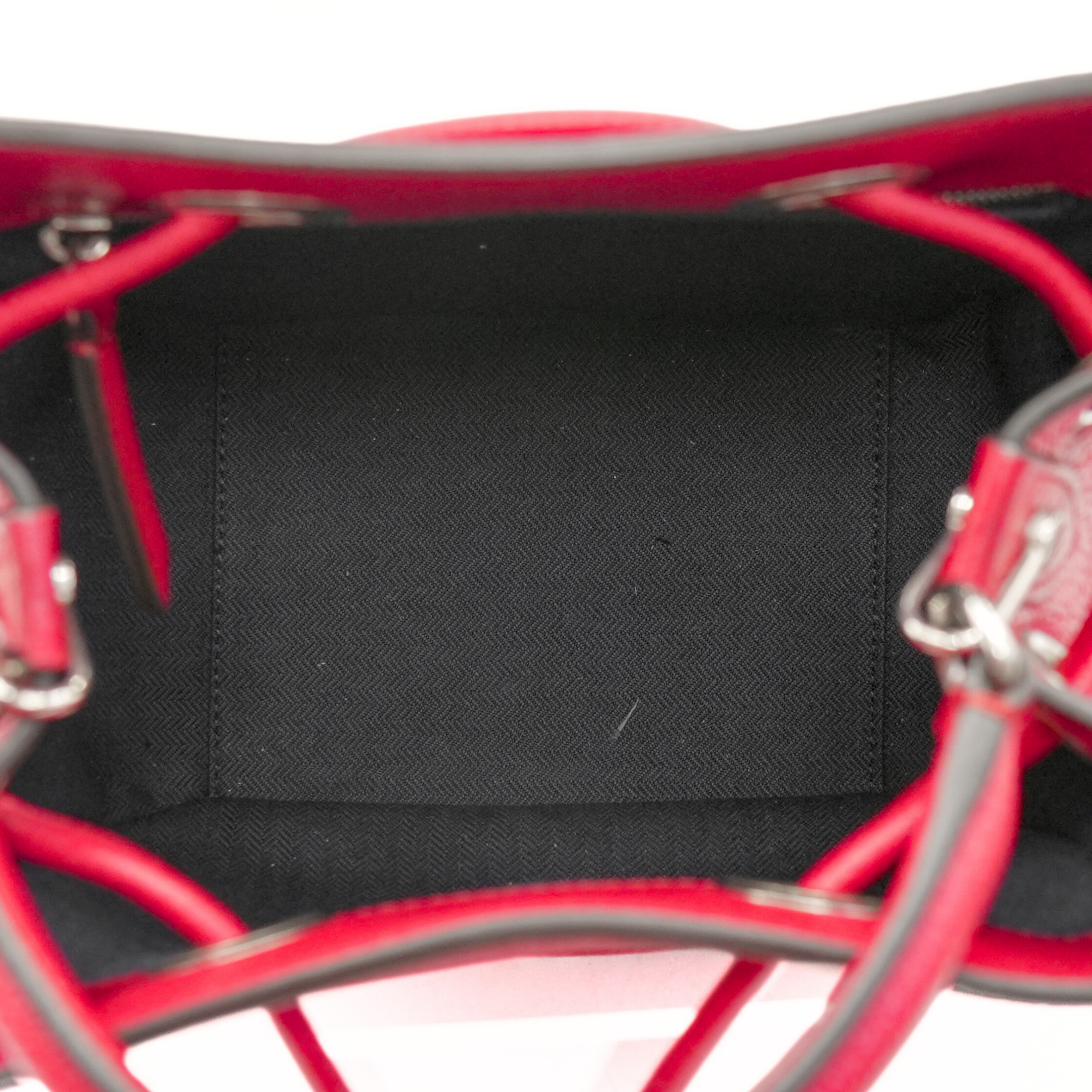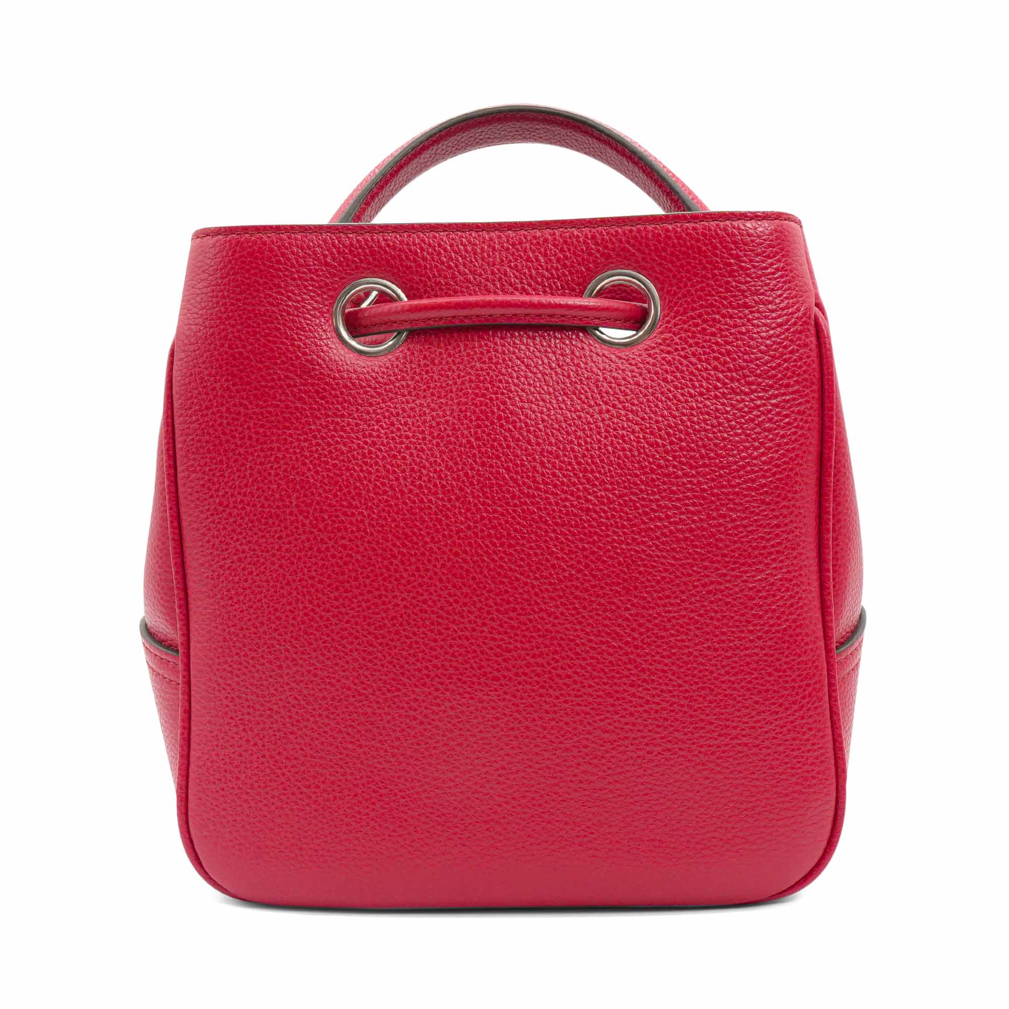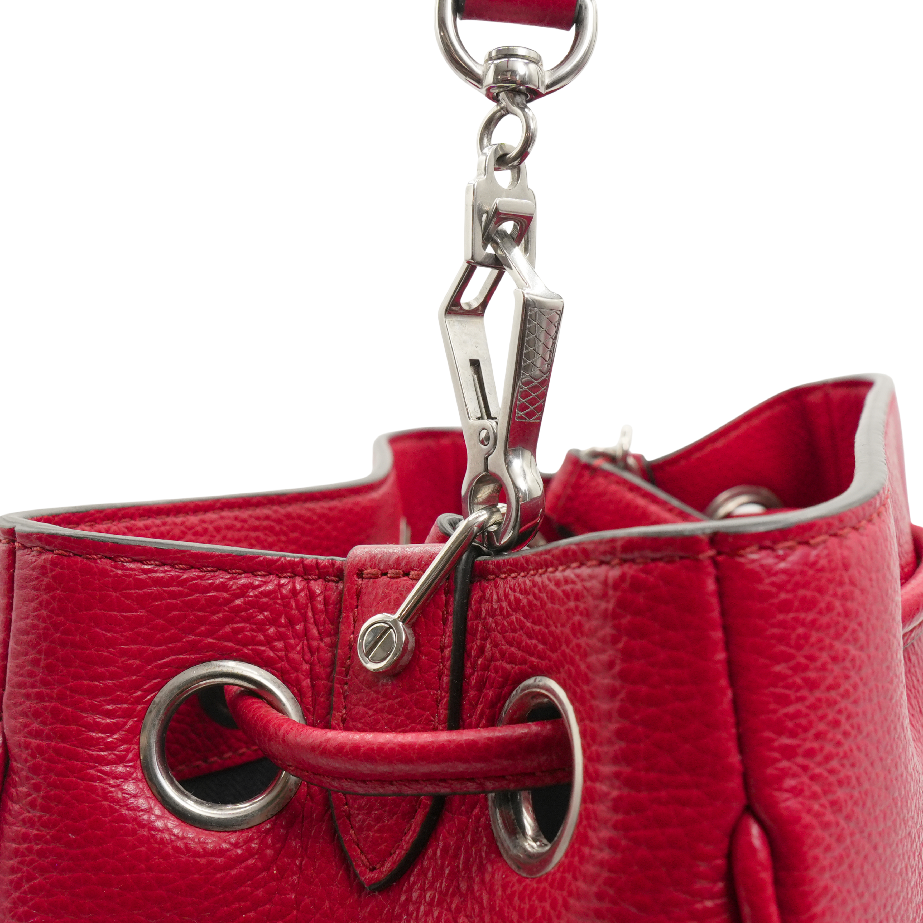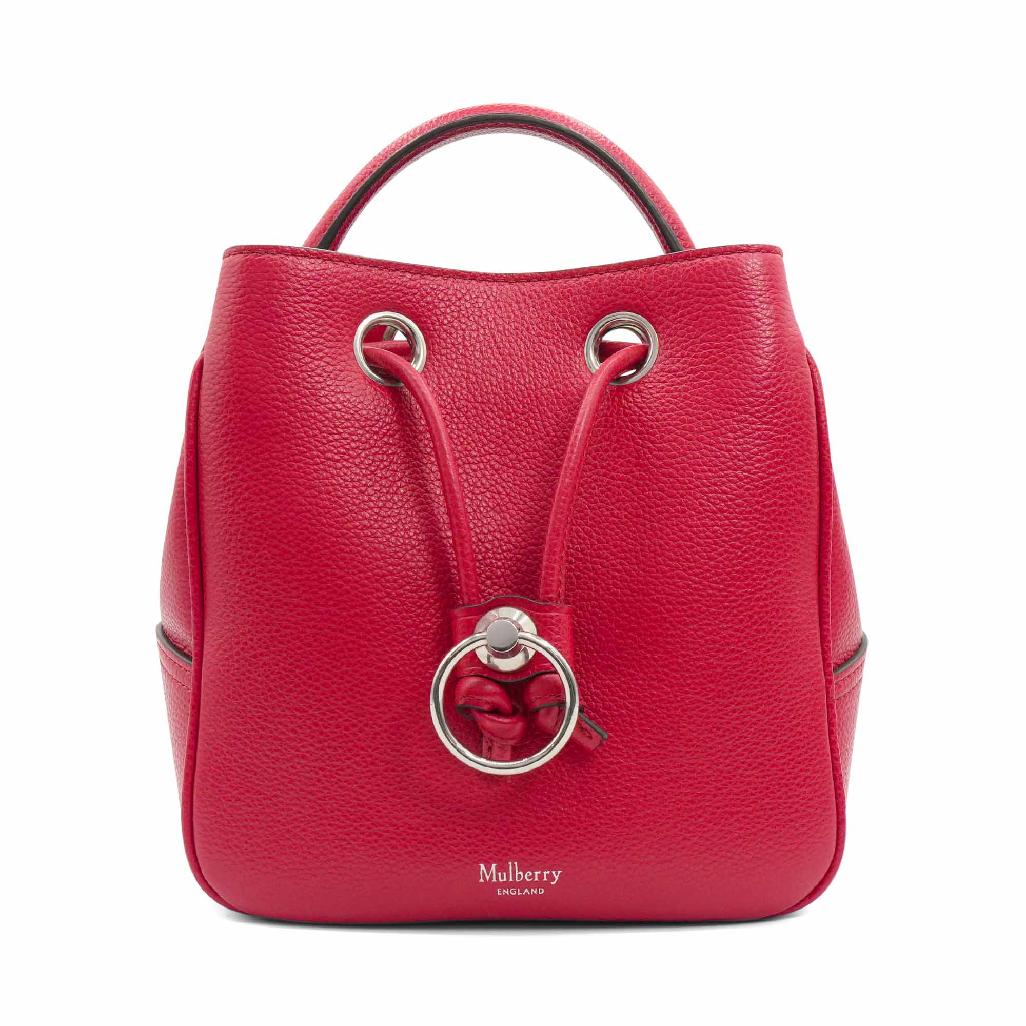 Mulberry 'Hampstead' bucket bag in red grained leather with silver hardware and logo stamping. Features a drawstring closure with O-ring detail, a navy canvas lining, and interior zip pocket. The bag has a structured top handle and removable shoulder strap.