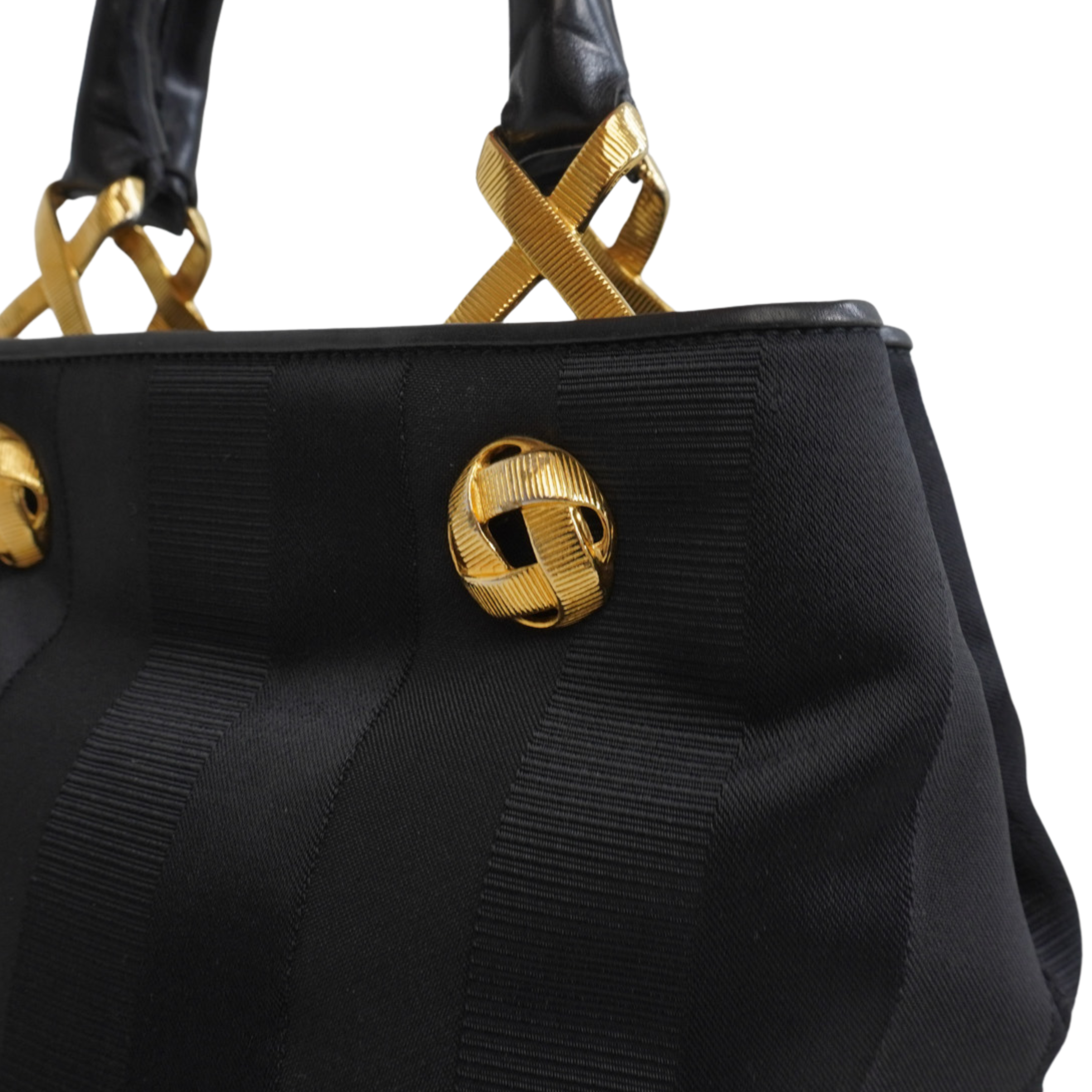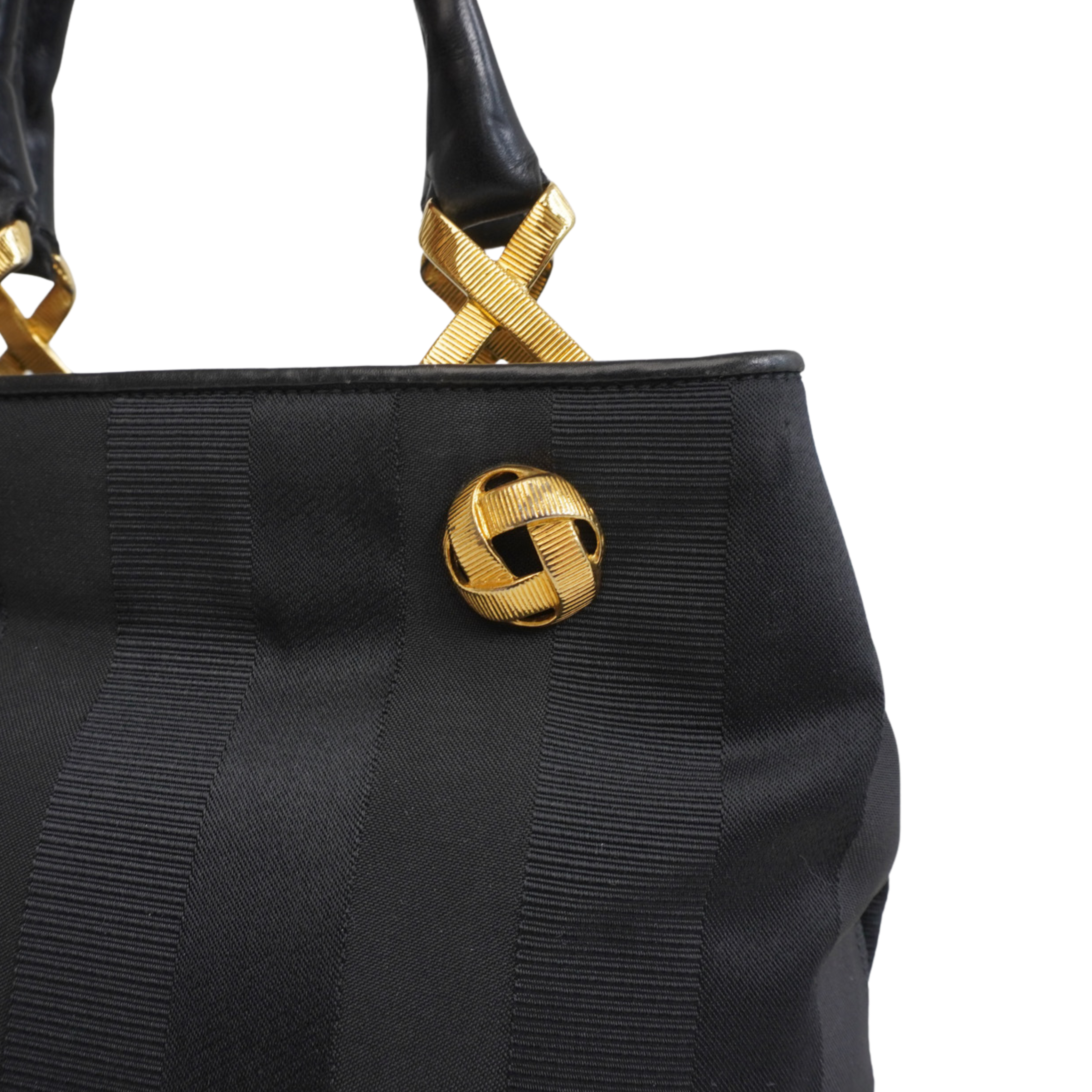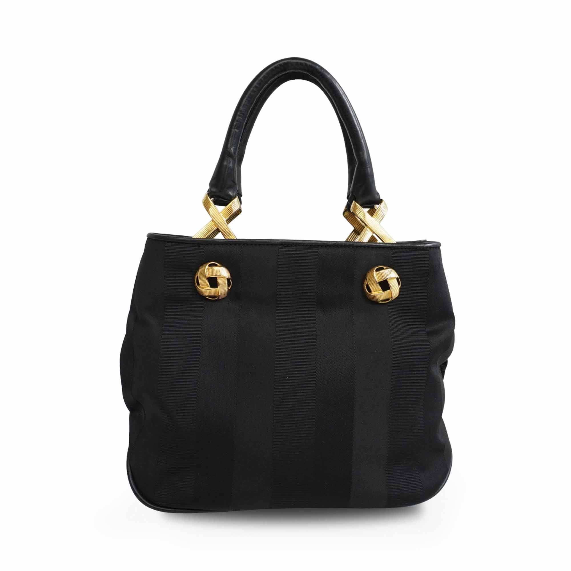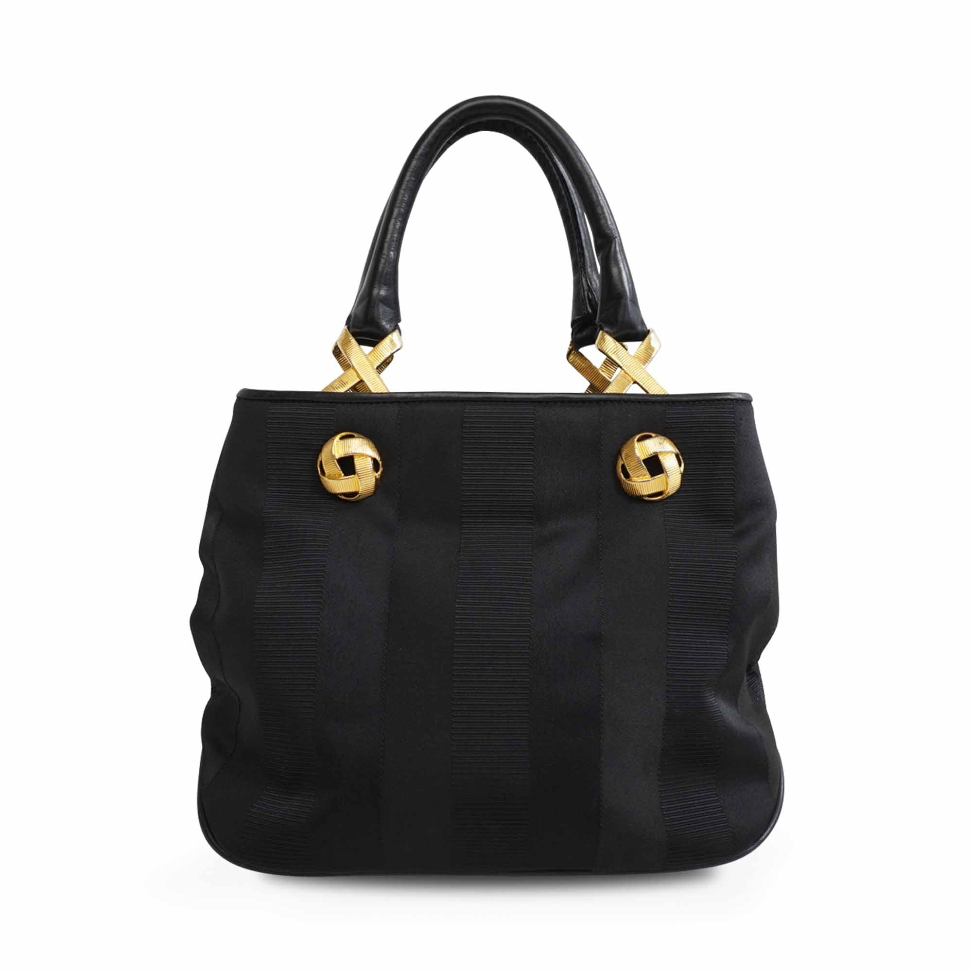 Salvatore Ferragamo small tote bag in black jacquard striped canvas with with gold knotted hardware and leather top handles. Features magnetic gussets and a leather lining with flat inner zip pocket.
