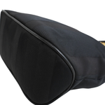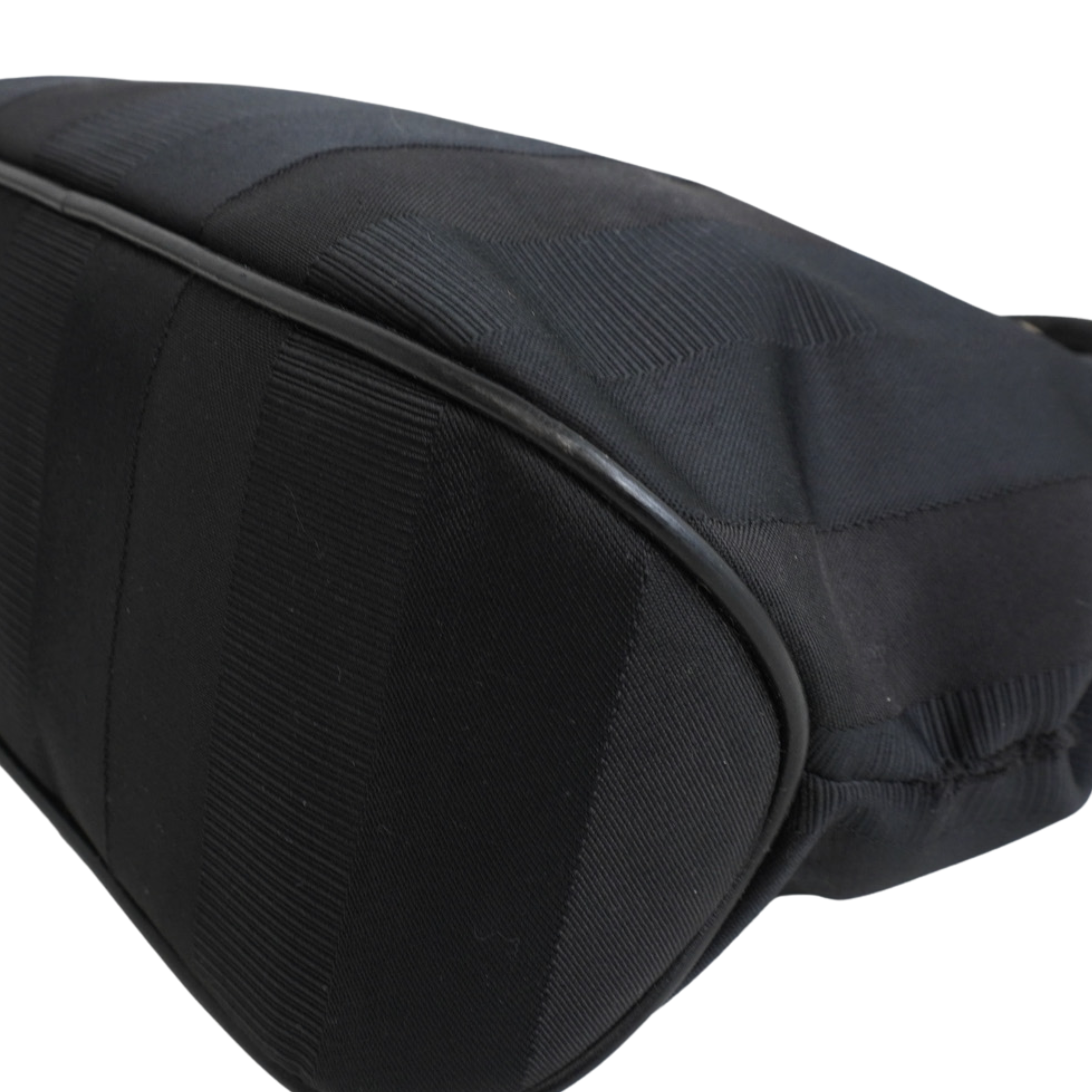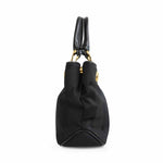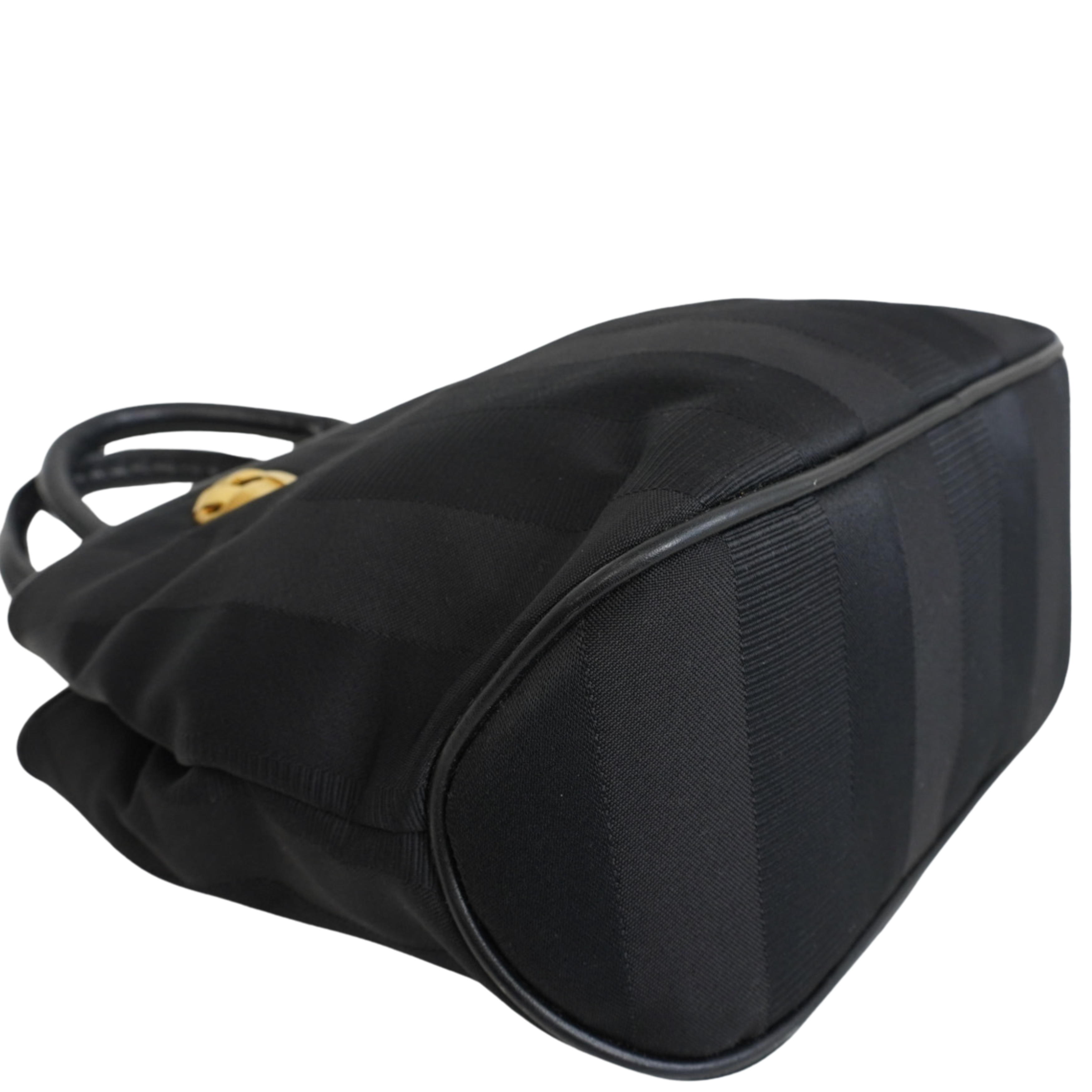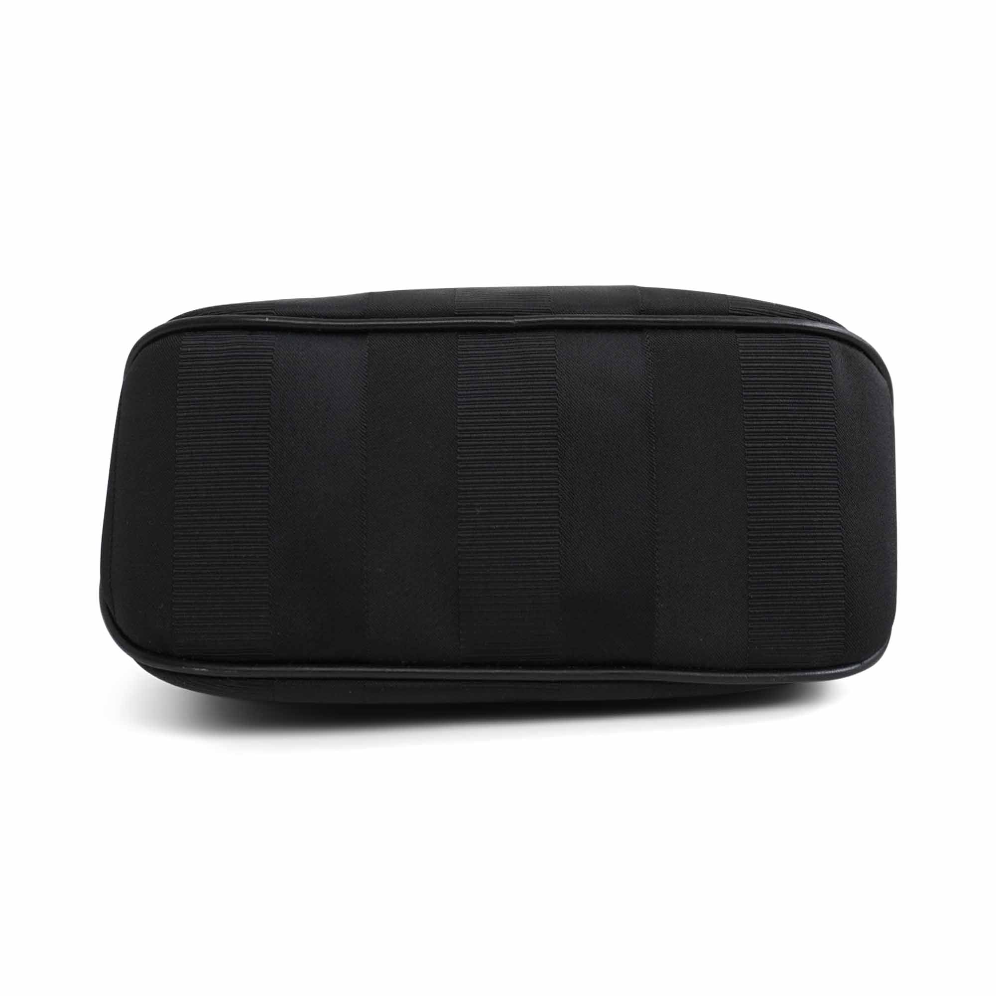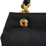 Salvatore Ferragamo small tote bag in black jacquard striped canvas with with gold knotted hardware and leather top handles. Features magnetic gussets and a leather lining with flat inner zip pocket.
