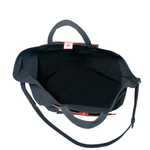 Acne 'Baker' tote bag in faded black canvas with red and pink leather panels at the top. Features top handles and an adjustable shoulder strap, an outer zip pocket, a snap closure, and a white logo on the red leather panel.