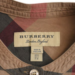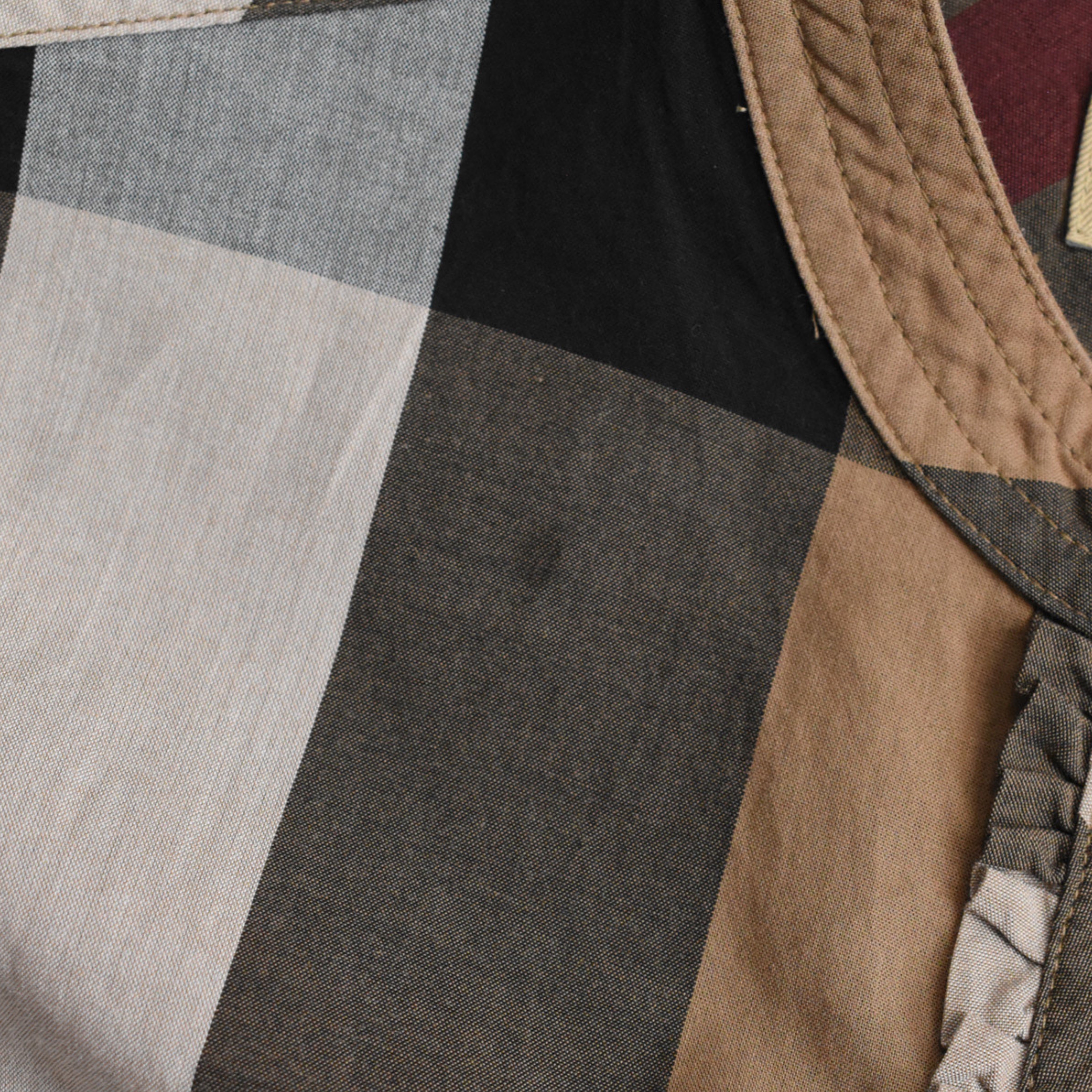 Burberry half-button blouse top in tan, black and red novacheck pattern. Features a collarless neckline, small ruffle trim on the button placket, silver logo buttons, and three quarter sleeves.