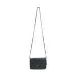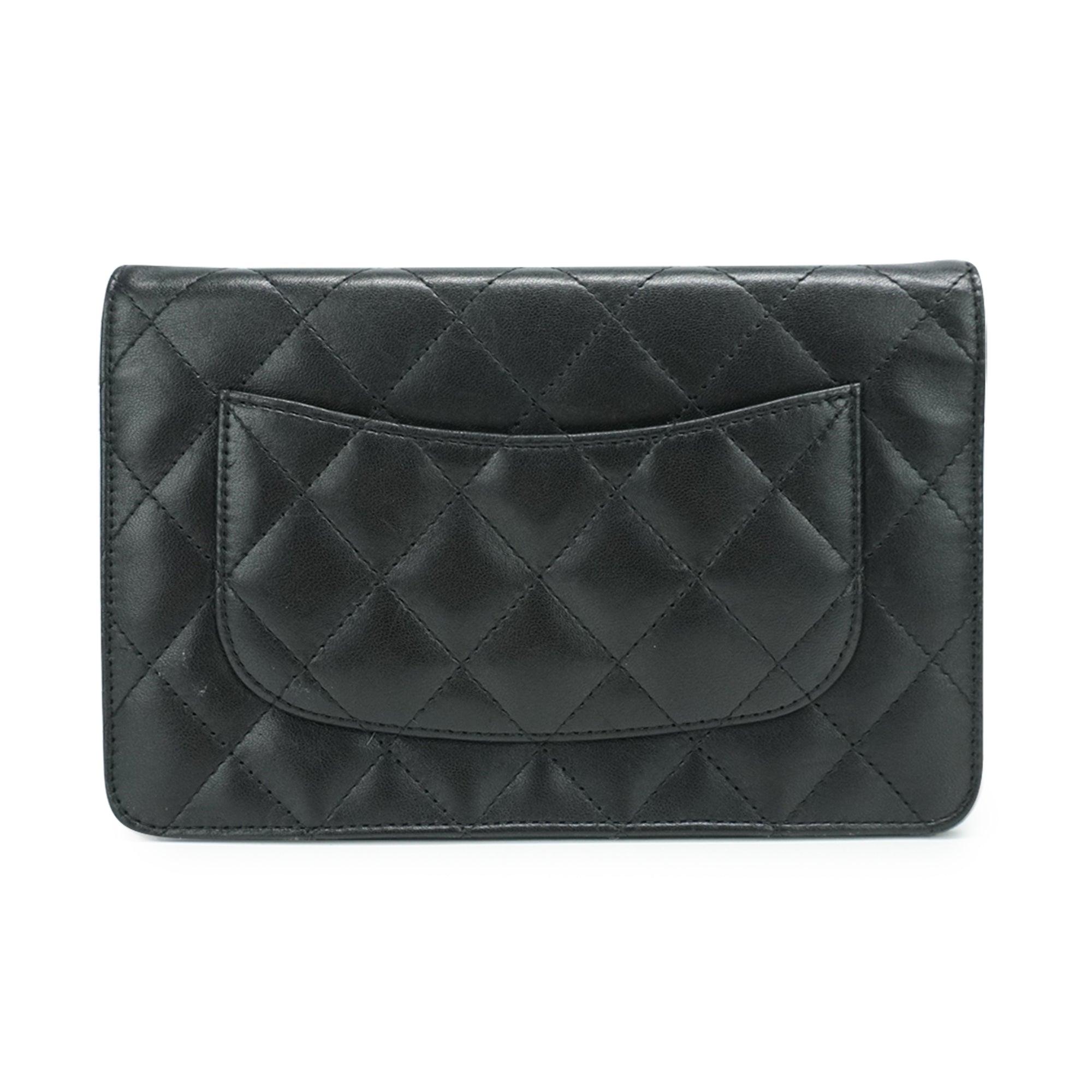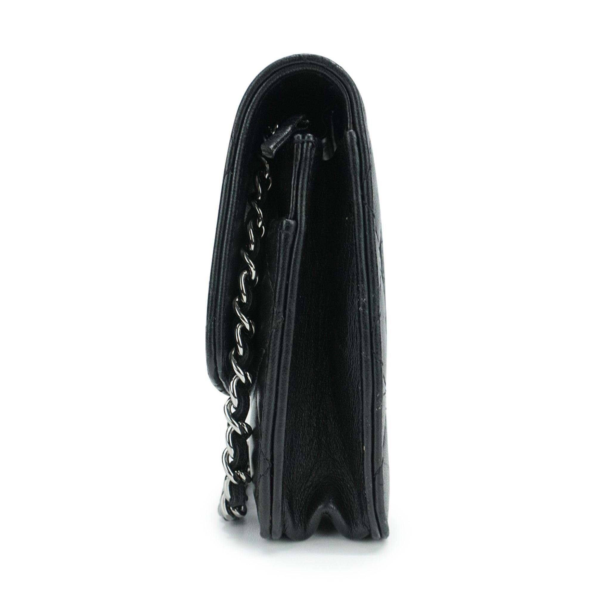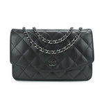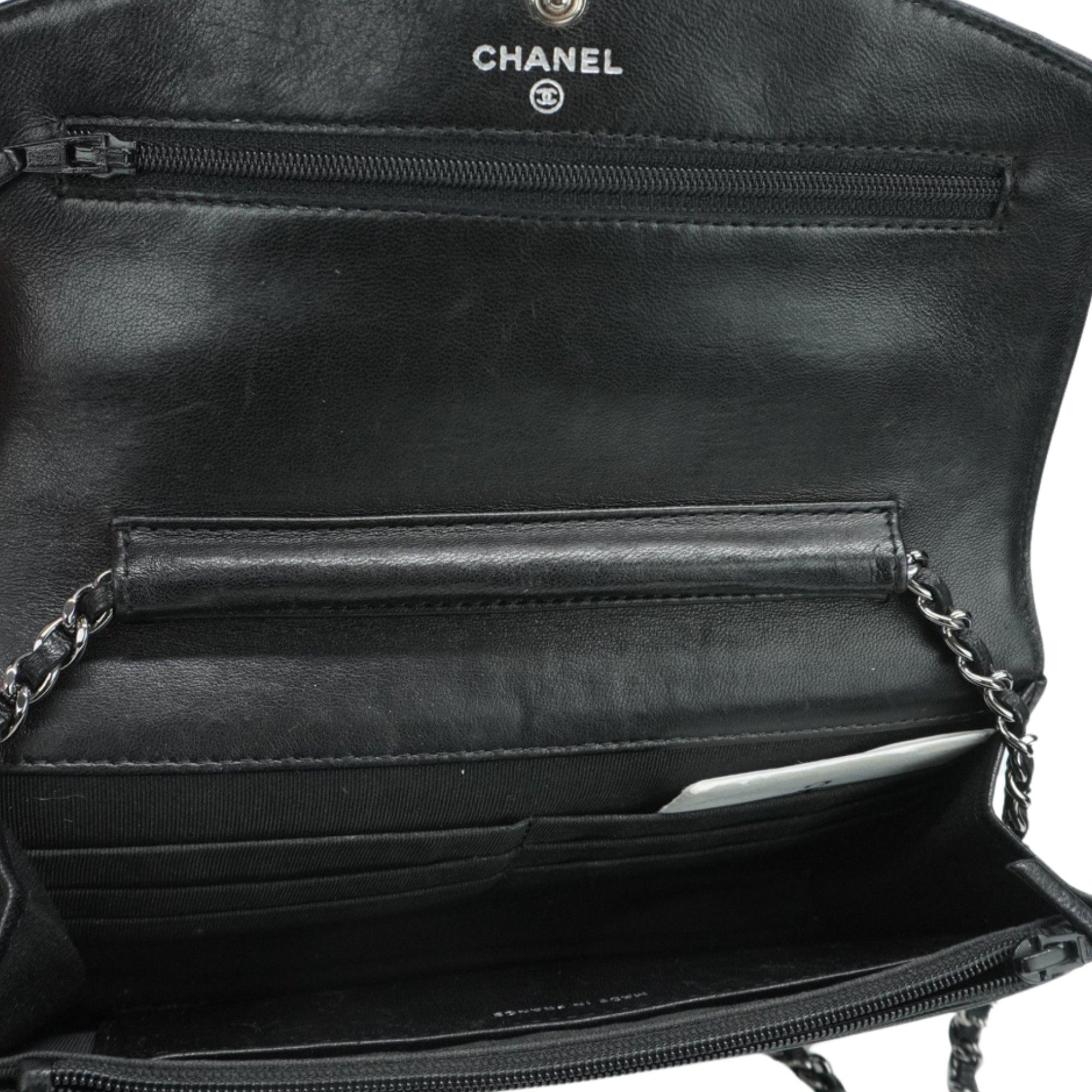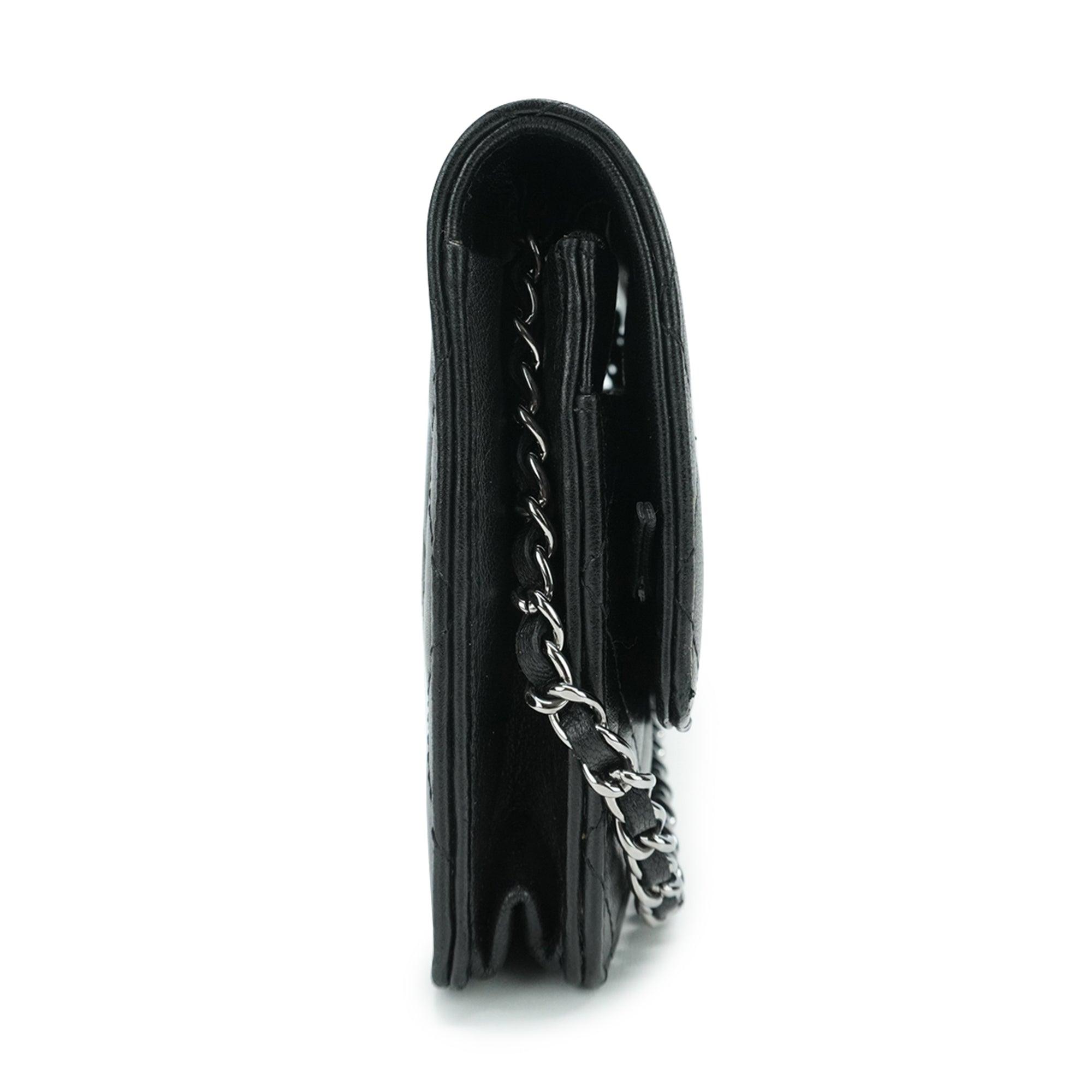 Chanel 'Wallet on Chain' Bag in black quilted lambskin leather with a front curved flap push closure and an interlocking CC in silver hardware. Features a leather woven chain strap that can be worn long or doubled up to be worn short, outer pocket, two inner zip pockets and card slot pockets. Includes box.