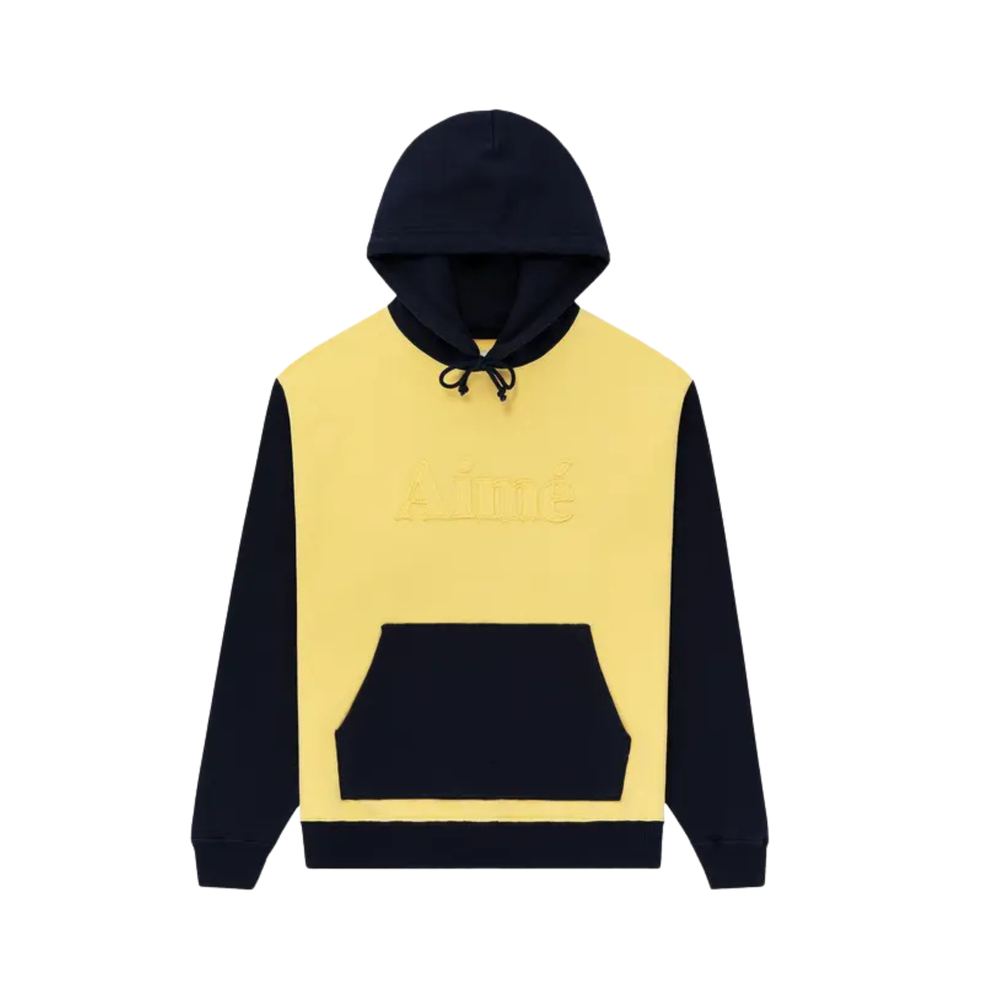 Aime Leon Dore two-tone hoodie in yellow and navy cotton with a large tonal logo patch across the chest.