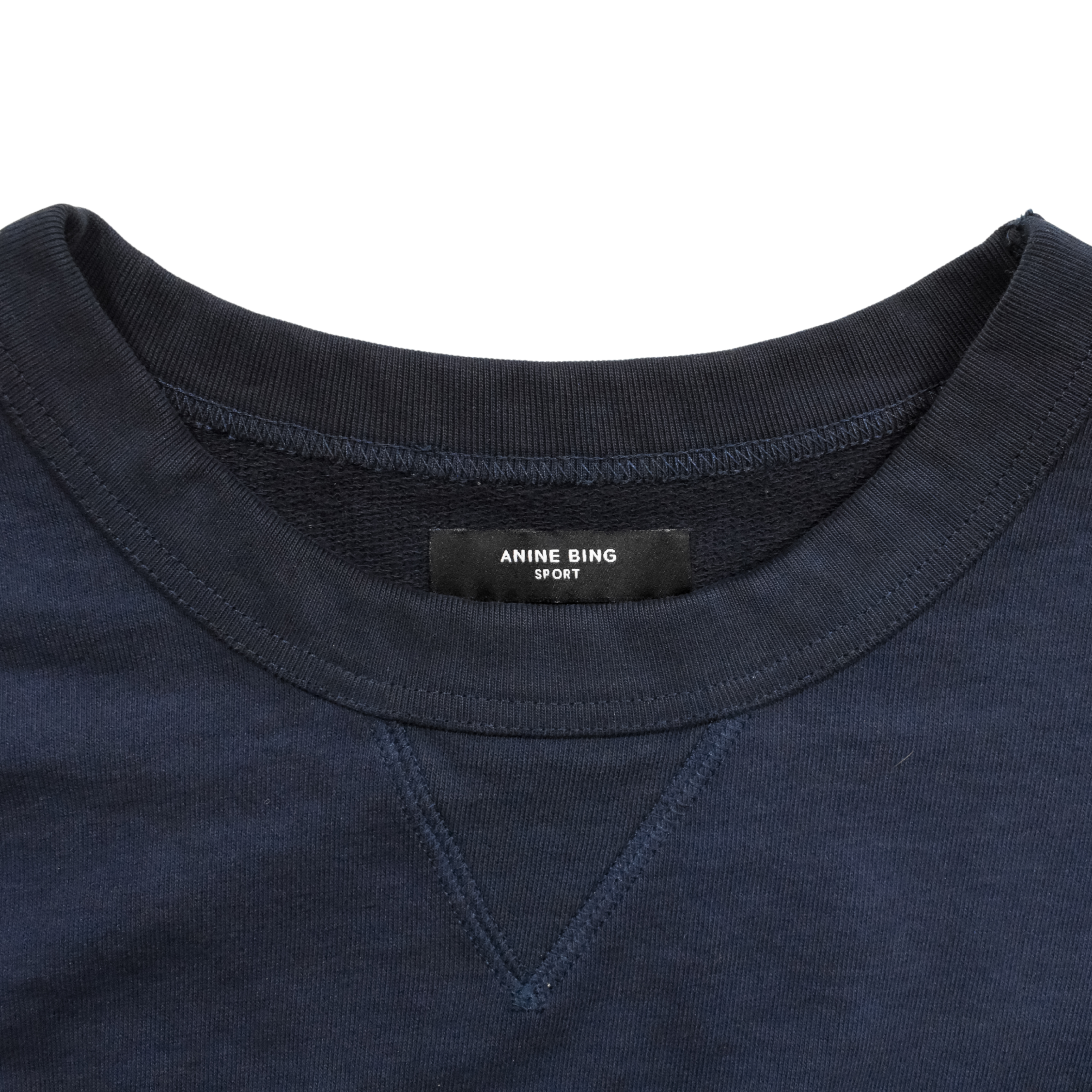Anine Bing 'Rod' crewneck sweatshirt in navy blue cotton with a yellow stitched '12' on the chest and an embroidered logo sport graphic on the back.