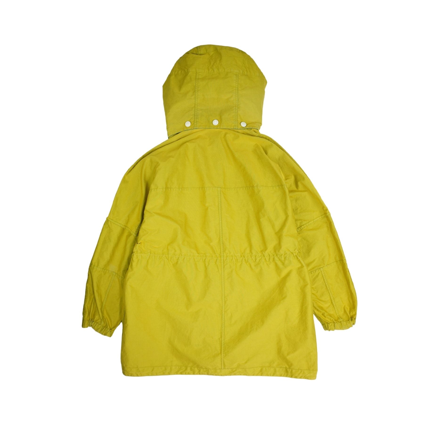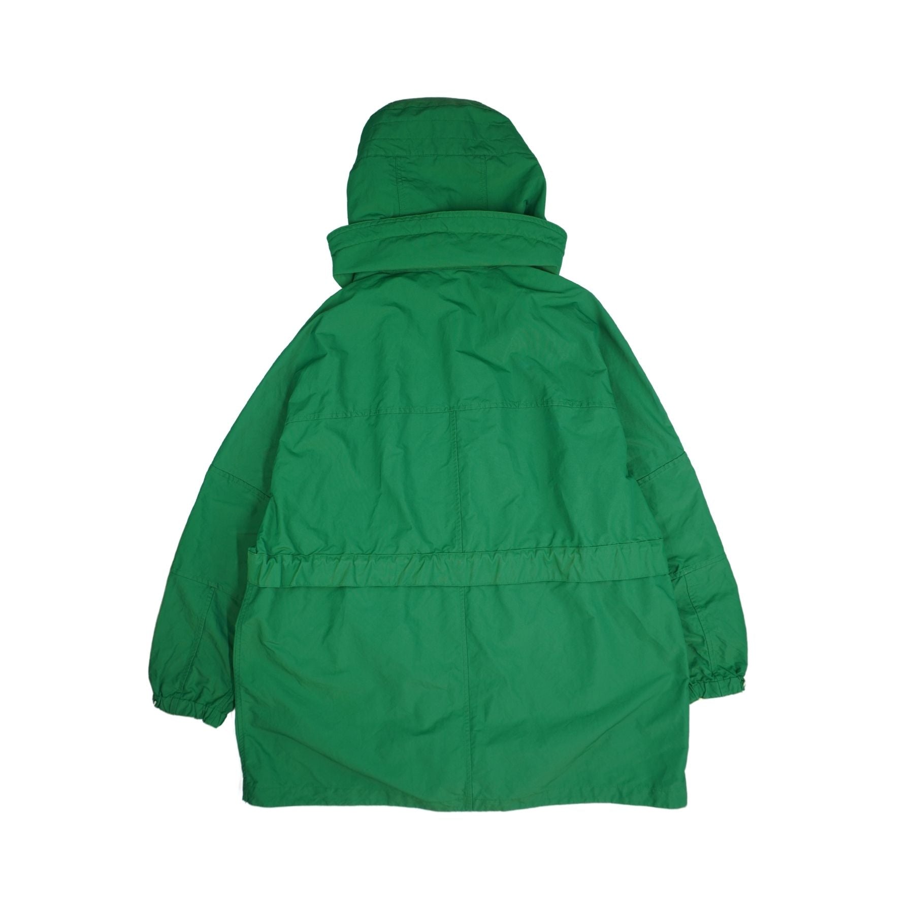 Burberry Brit reversible jacket in a green poly-cotton blend with a front-zip opening in white hardware, large cream buttons, front cargo pockets, and a detachable hood.