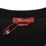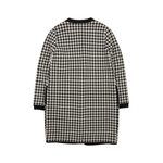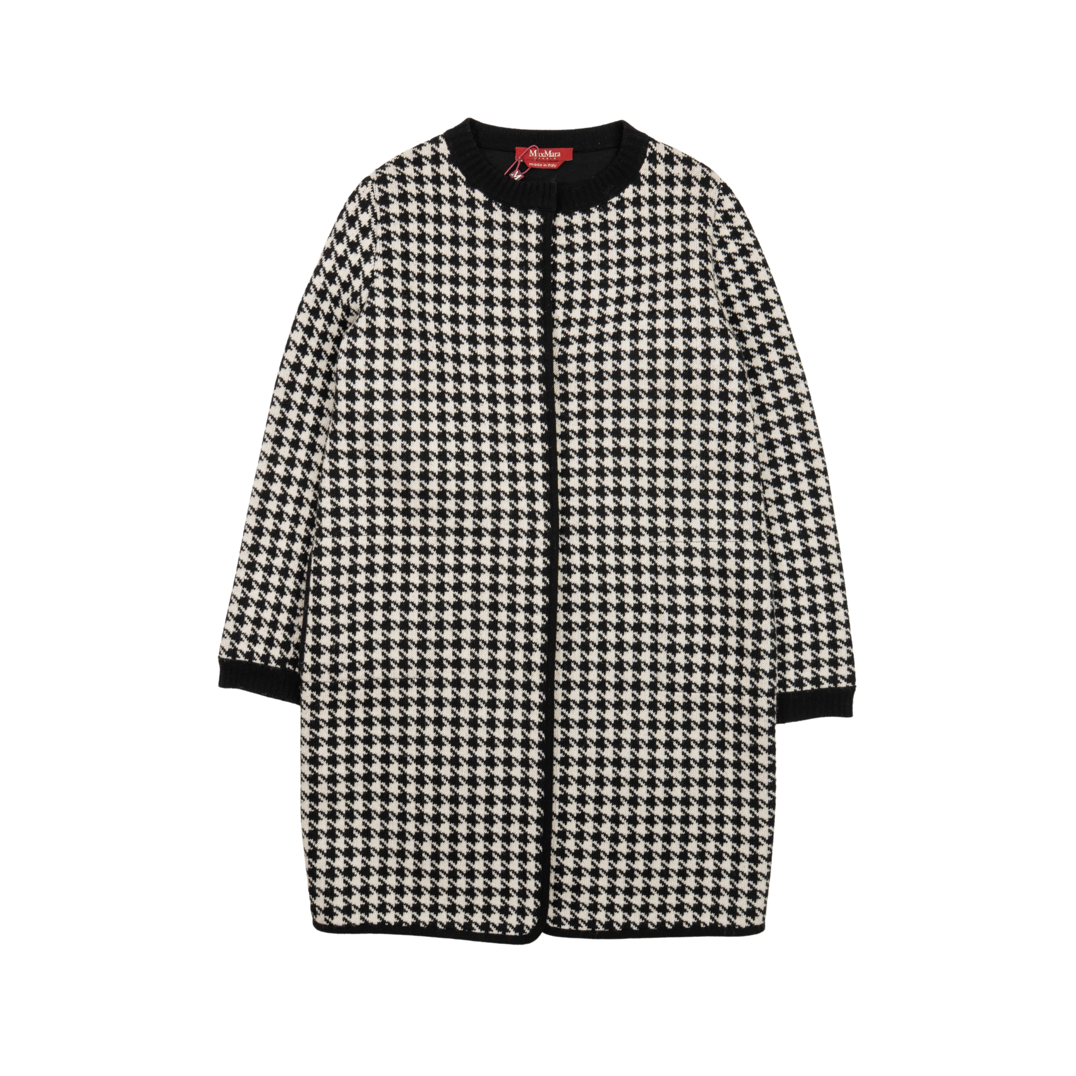 Max Mara mid-length knit jacket in black and white houndstooth with black ribbed knit collar and sleeve cuffs. Features two side seam pockets and snap buttons.
