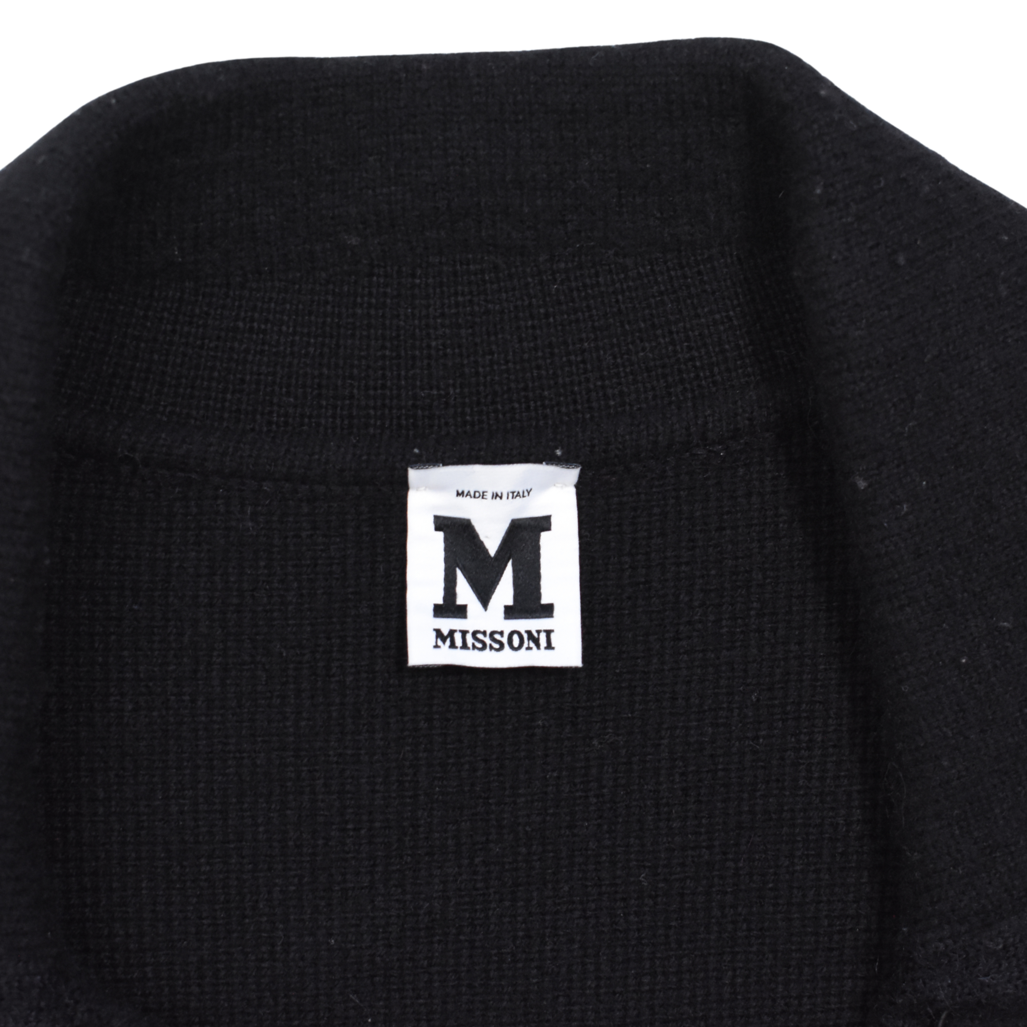 M Missoni double breasted black knit jacket with purple, red, and orange ribbed knit bottom.