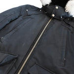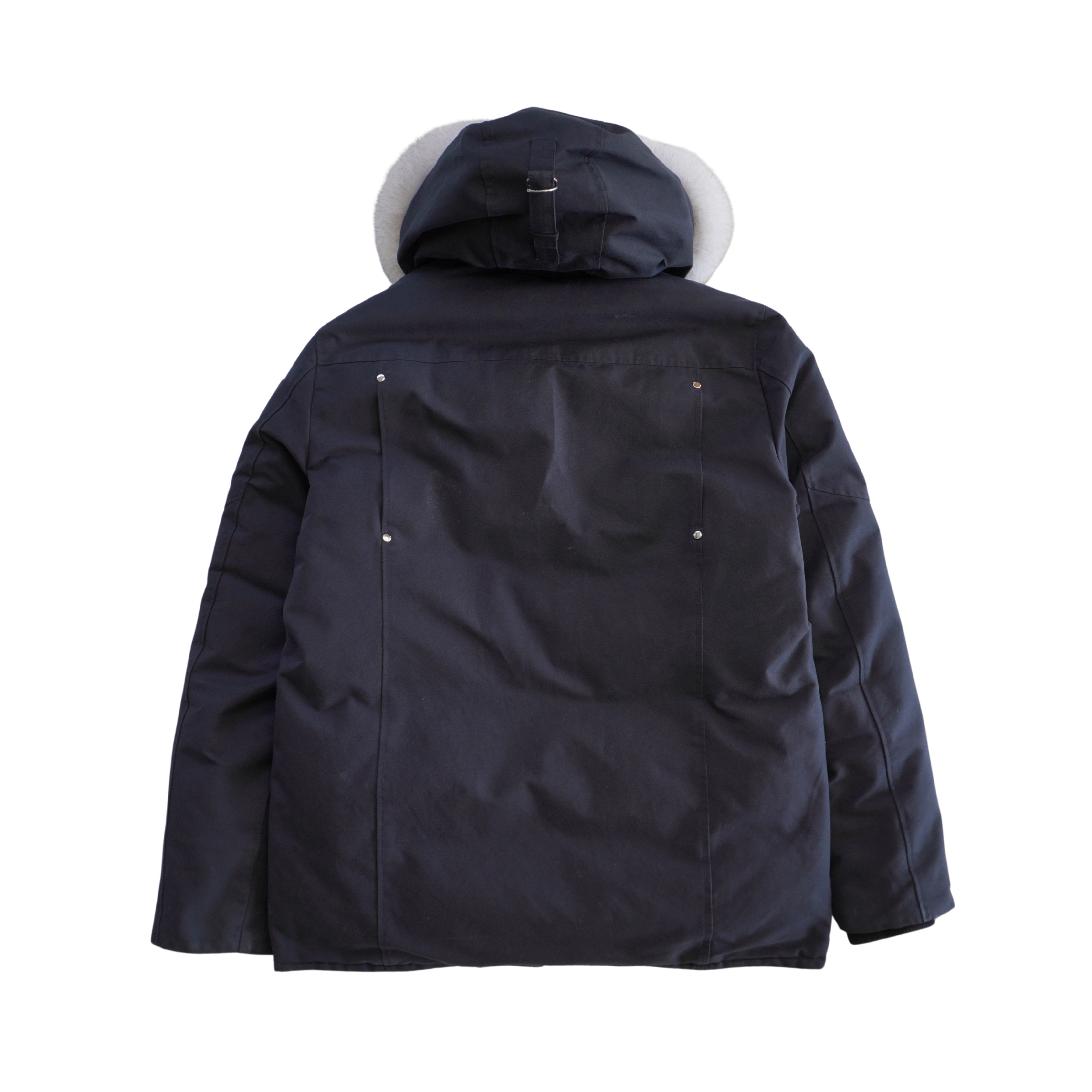Moose Knuckles 'Pearson' down filled parka in faded navy with a white fox fur trimmed removable hood and signature silver metal logo hardware on the left sleeve. Features multiple pockets, a two way zipper, and ribbed knit cuffs and collar.