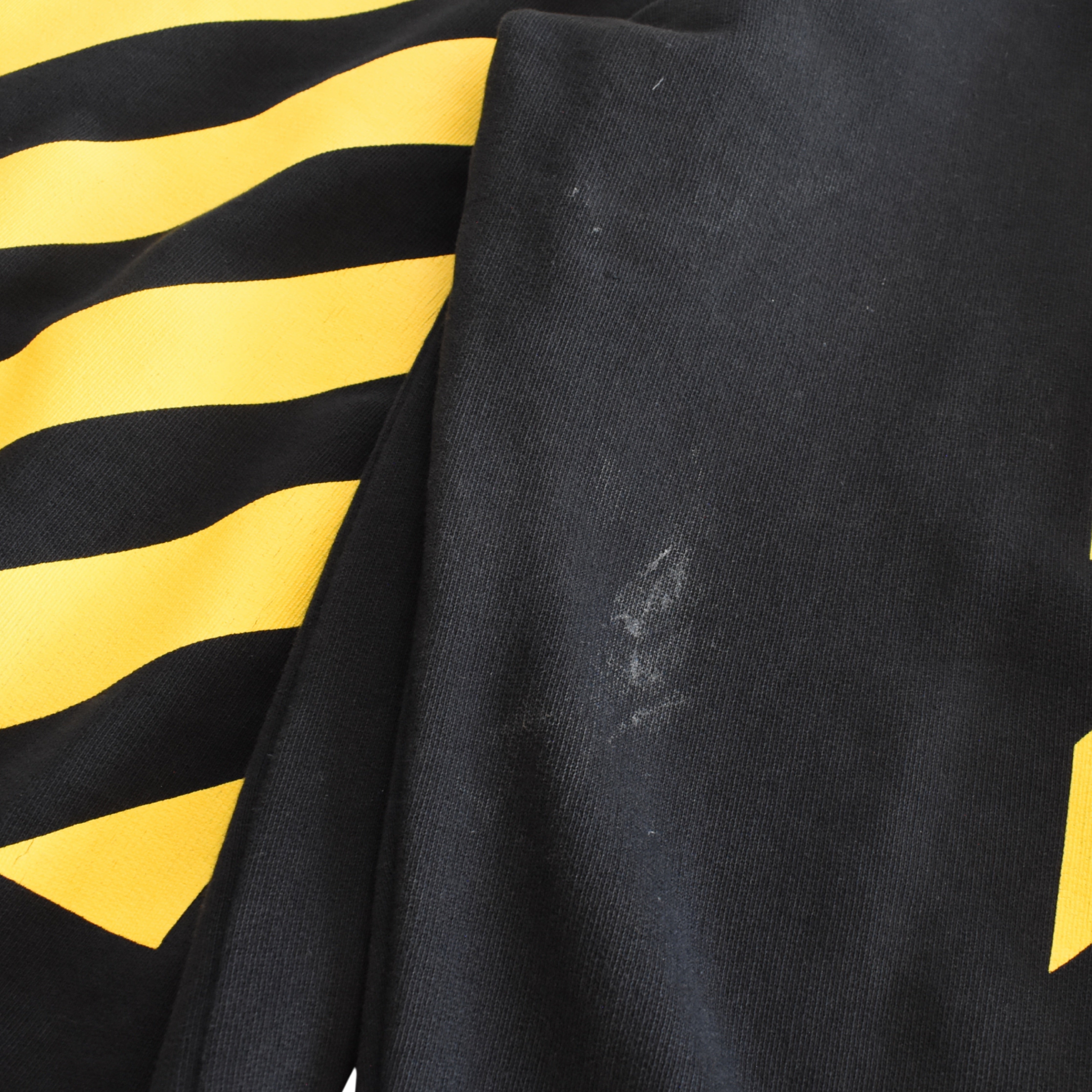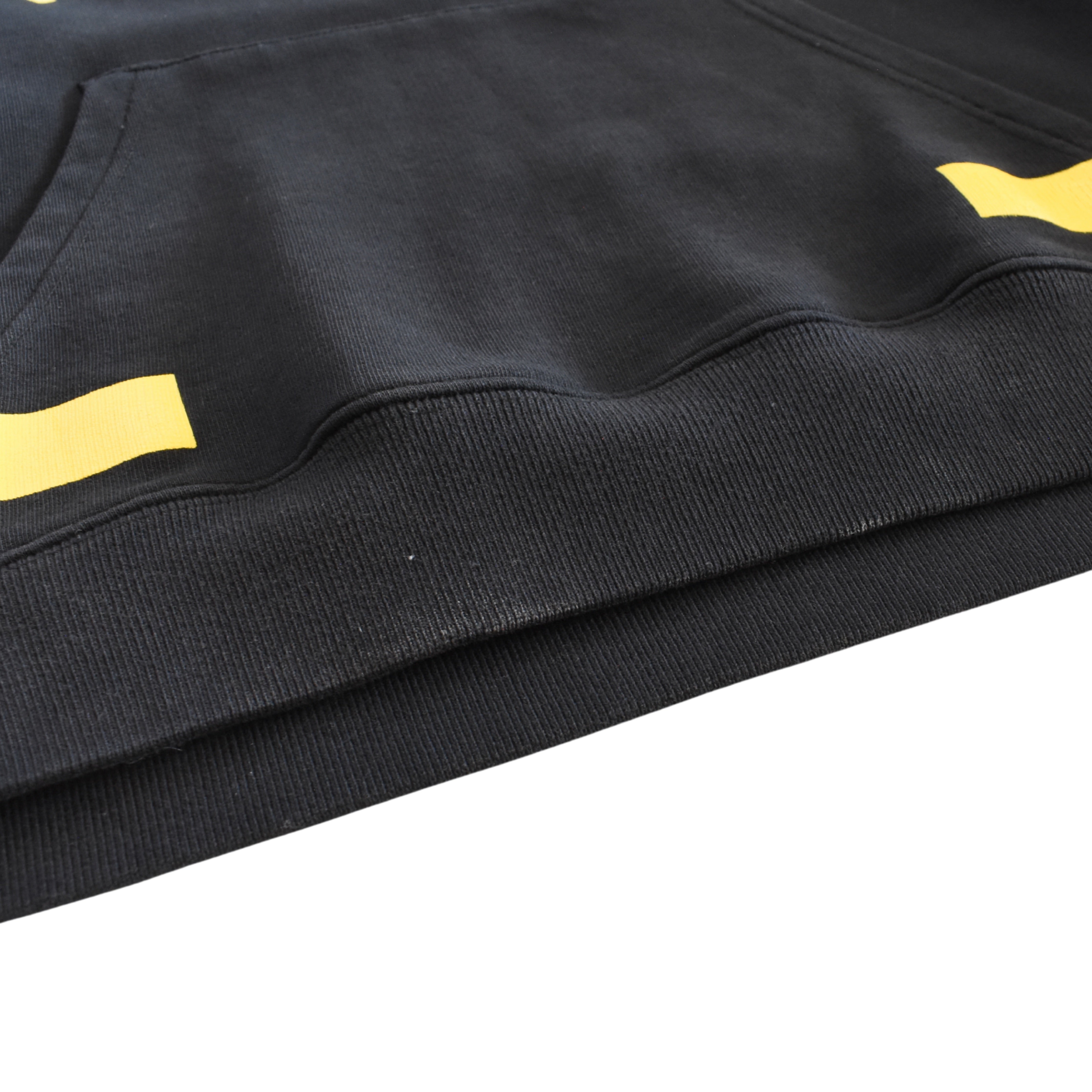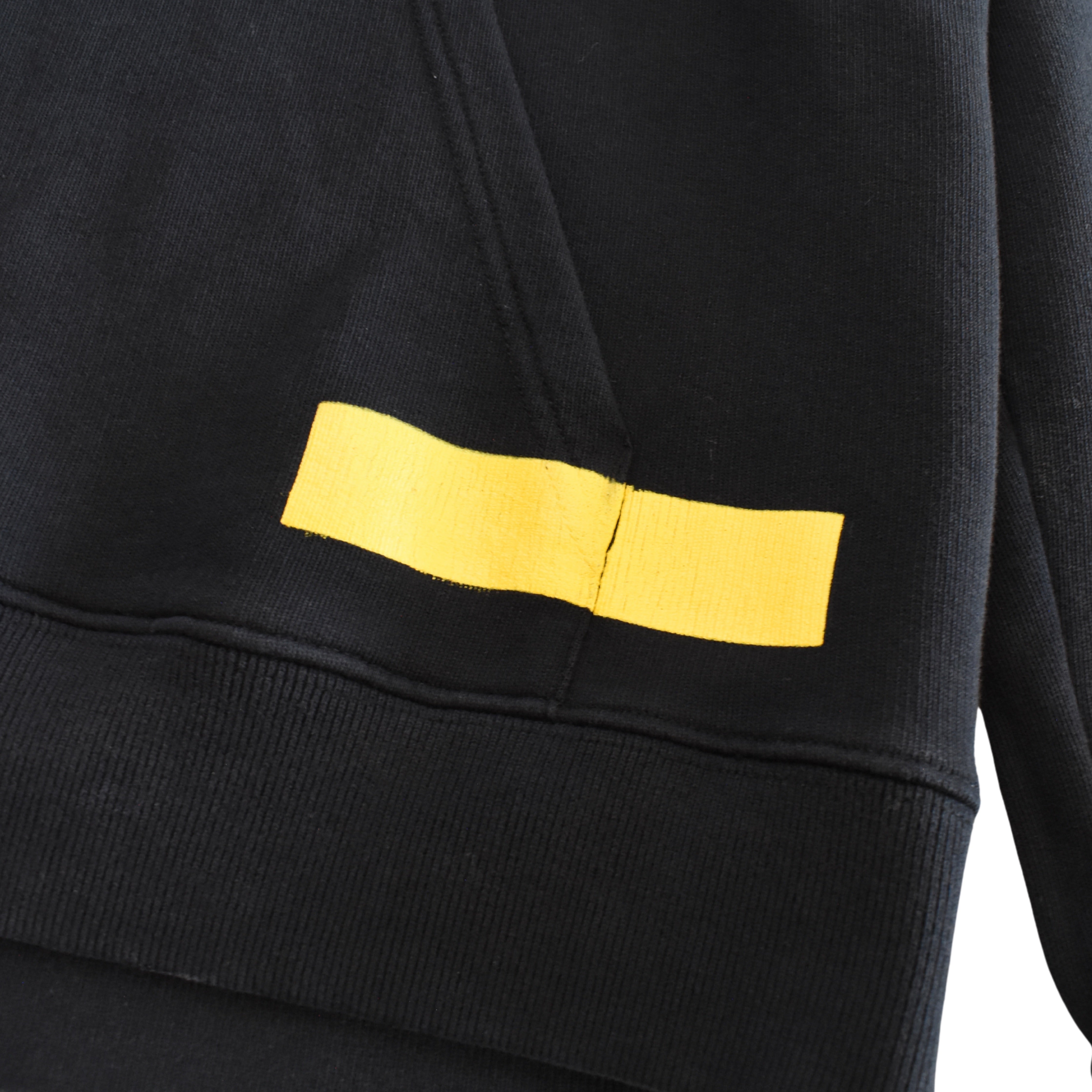 OFF-WHITE 'Caravaggio' hoodie in black cotton with yellow stripes down the sleeves, a faded painting graphic on the chest, and a large yellow stripe graphic on the back.