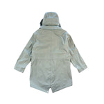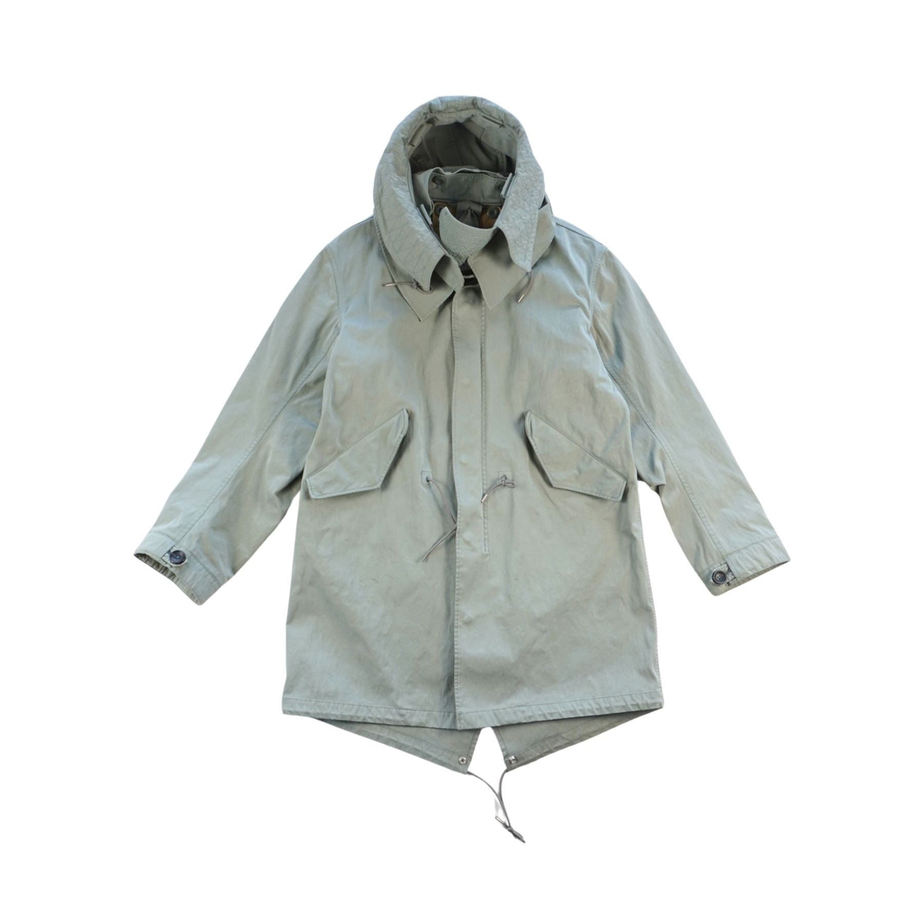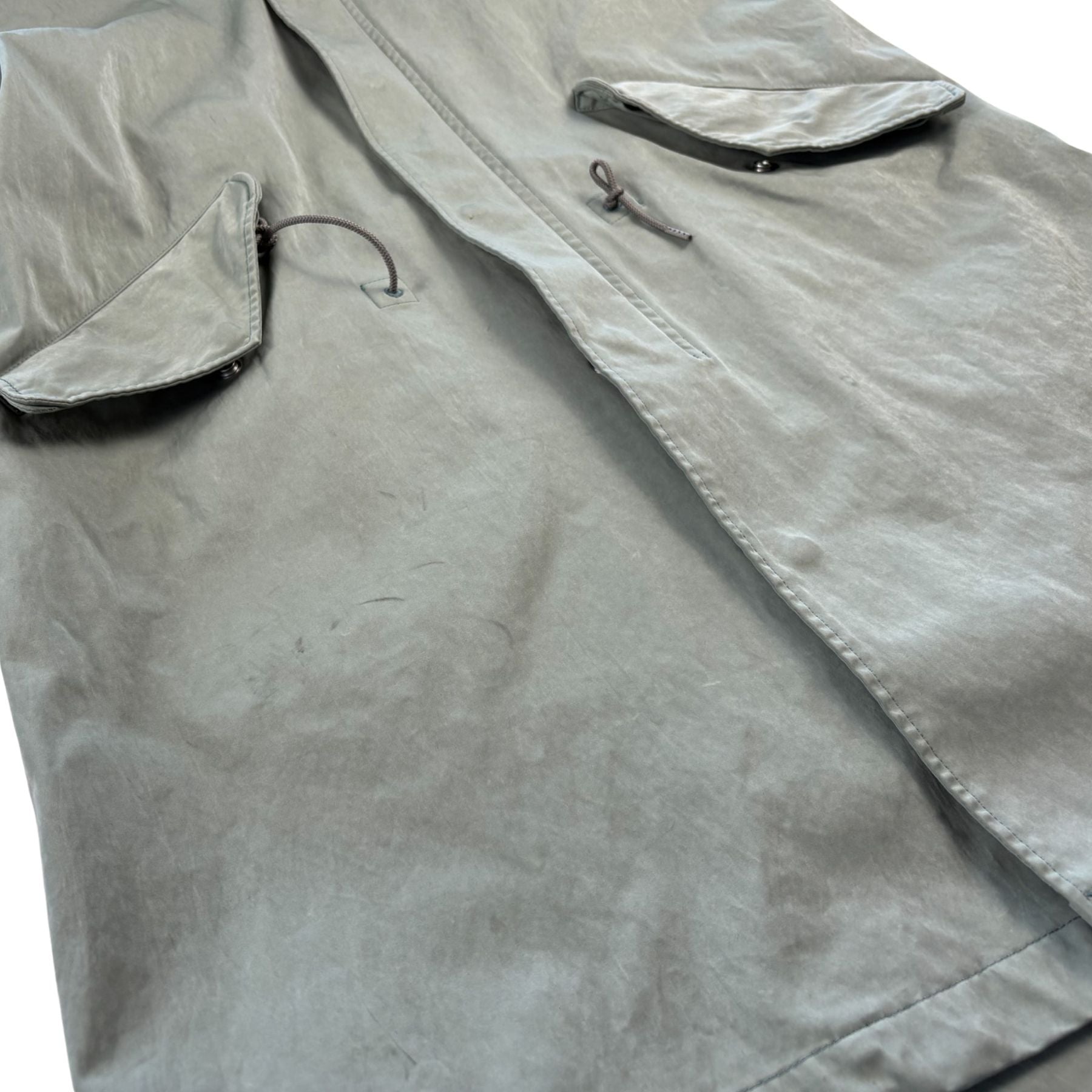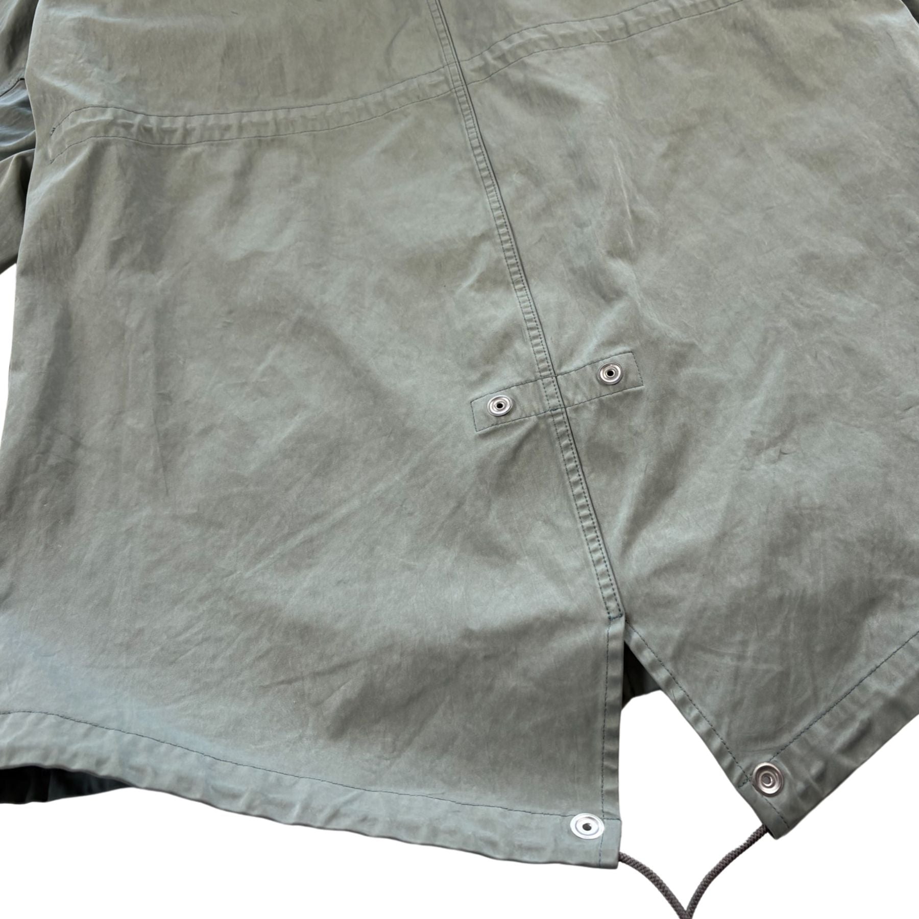 Ten C 'Fishtail' jacket in sage green Japanese jersey with front zip and snap button-down closure in silver hardware. Features a removable hood, drawstring waistband, a fishtail adjustable hem, and flap pockets.