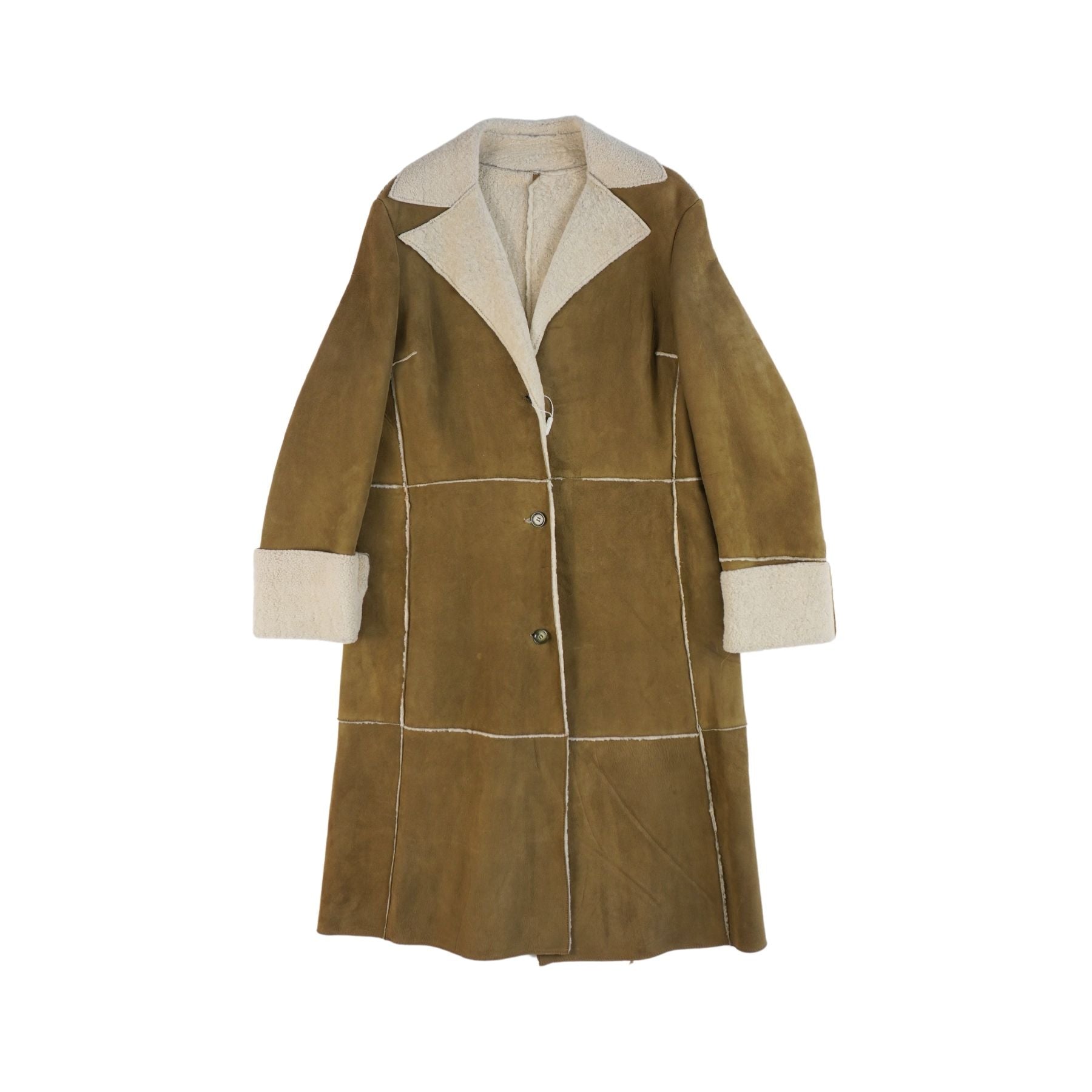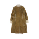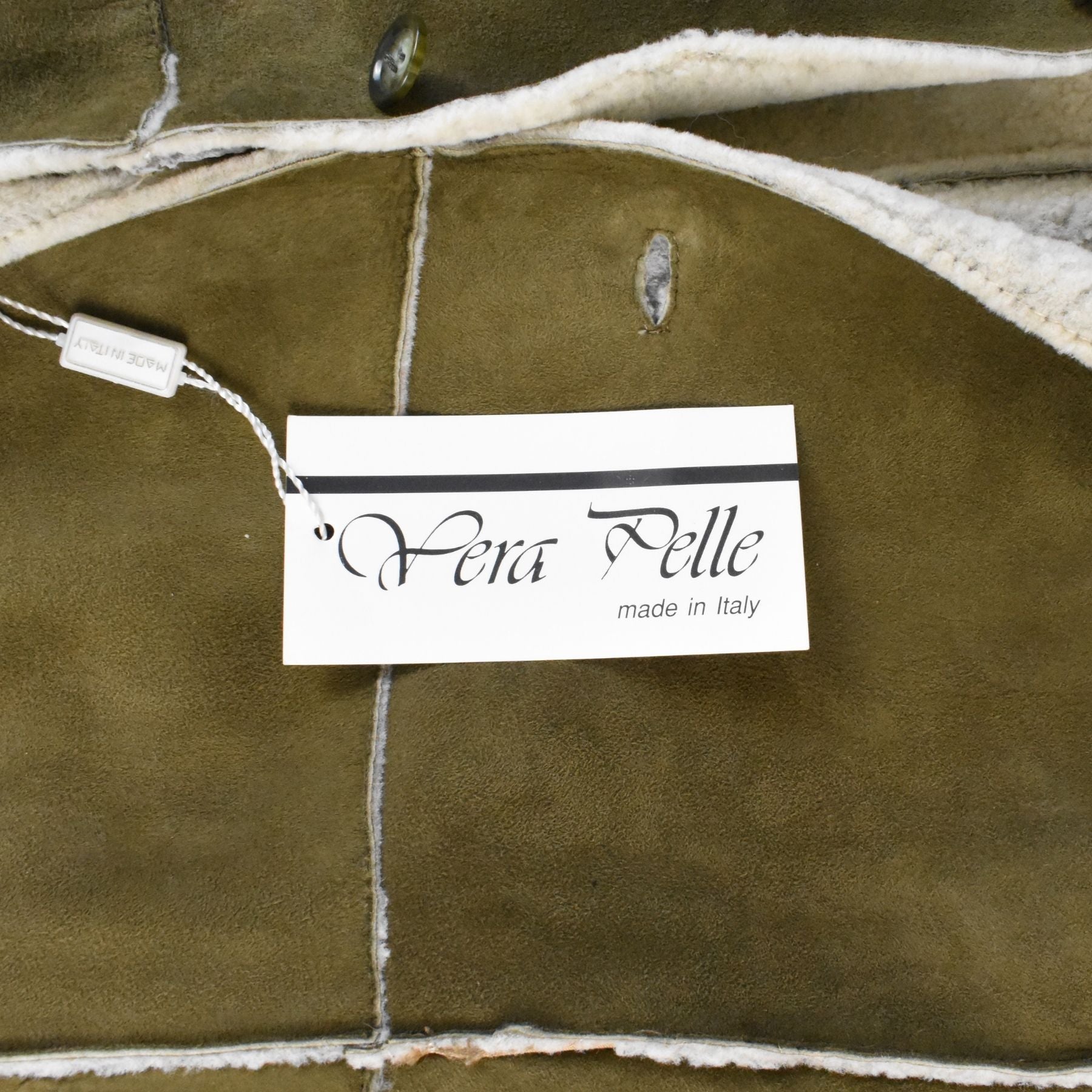 Vera Pelle single-breasted coat in olive green leather with white shearling lining, tortoise button-down closure, contrast stitching, and exposed seams. Features open pockets.