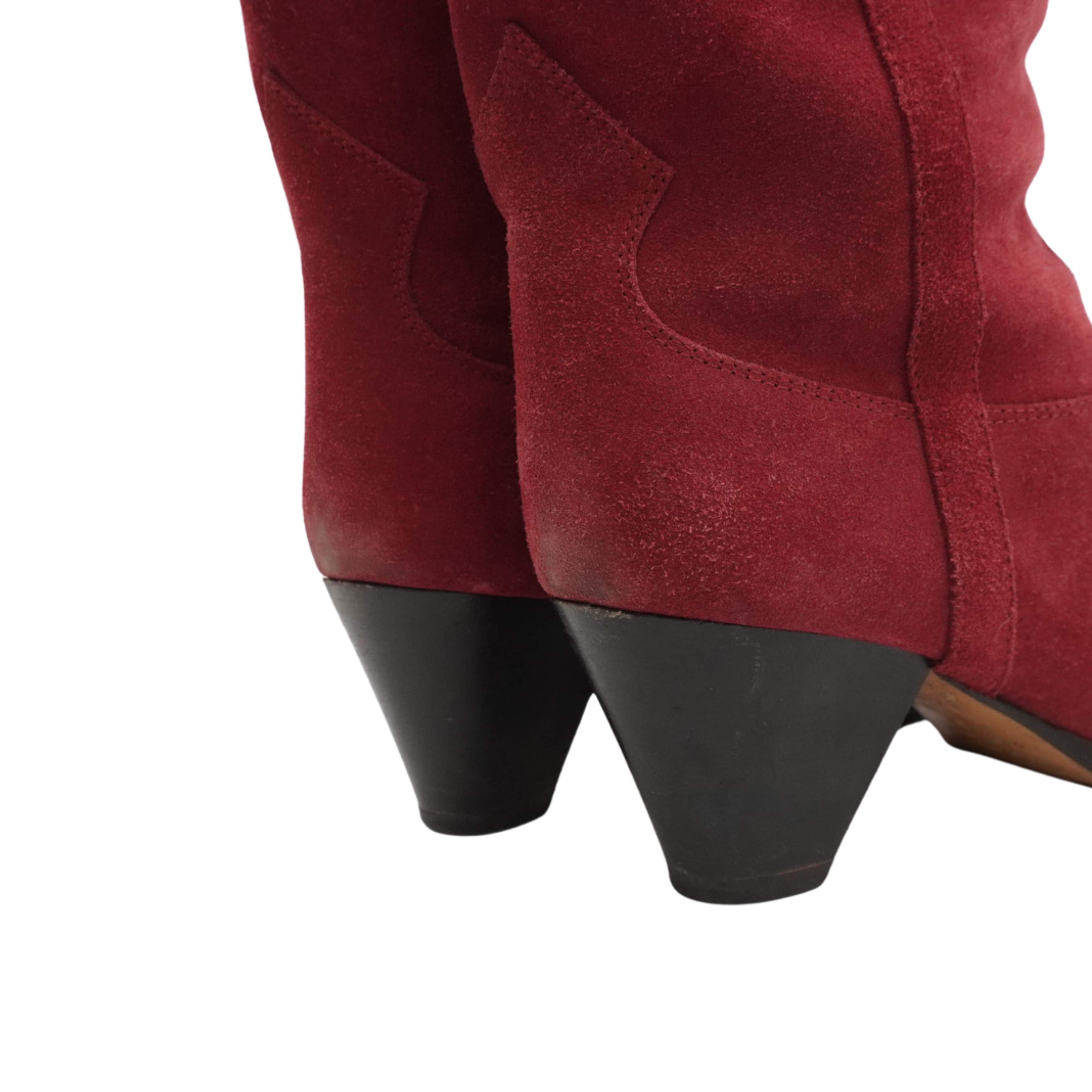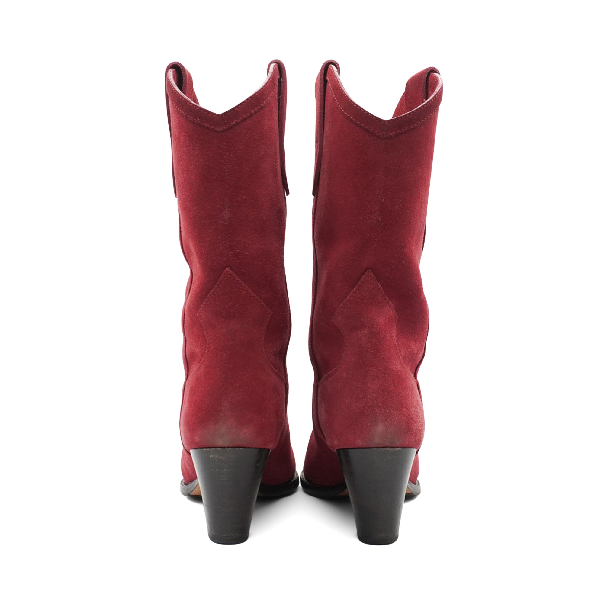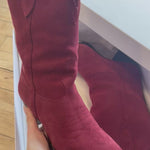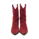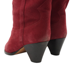 Isabel Marant 'Duerto' pointed toe cowboy boots in a faded red suede. Features a small stacked heel, western embroidery on the top of the foot, and pull tabs at the top of the shaft.