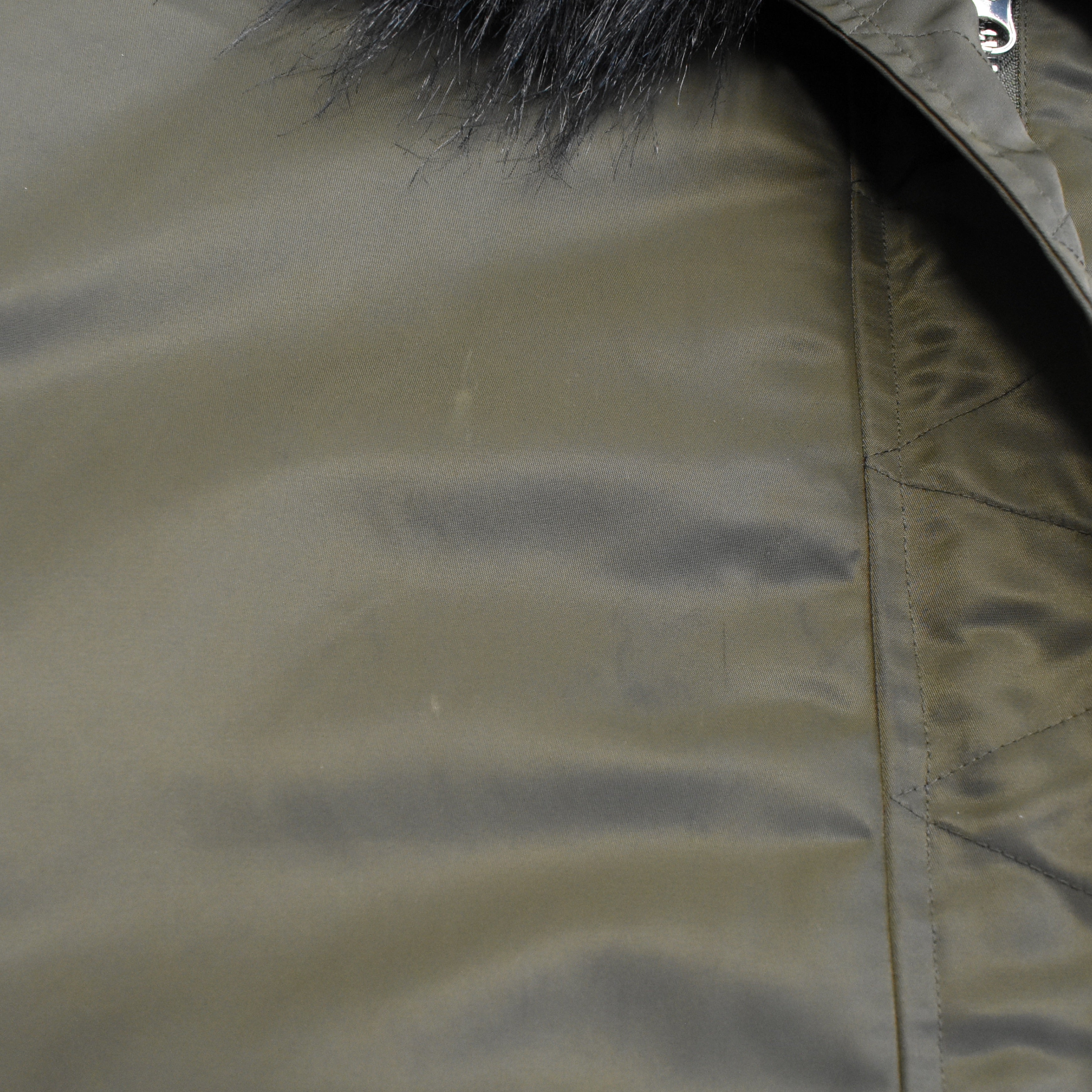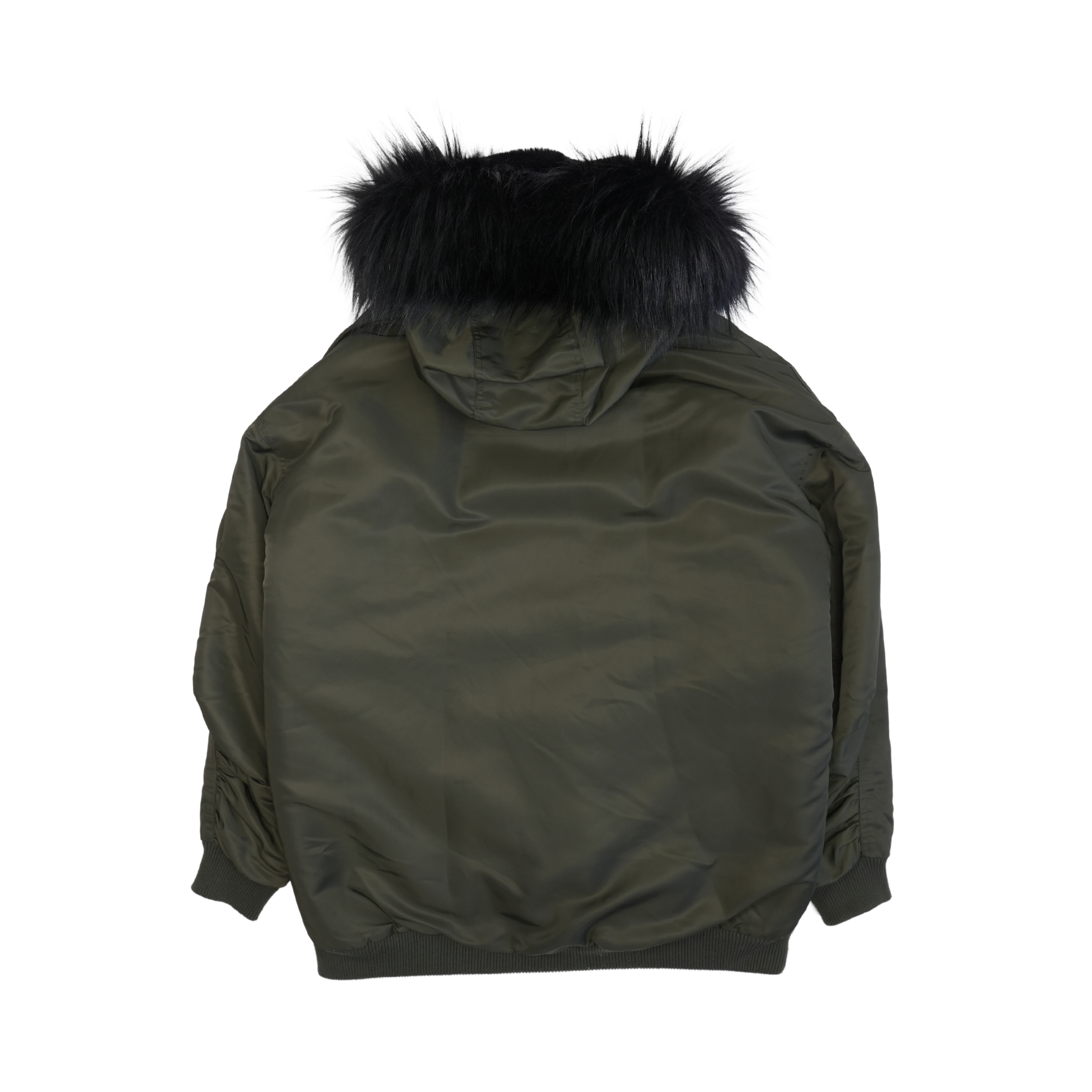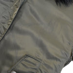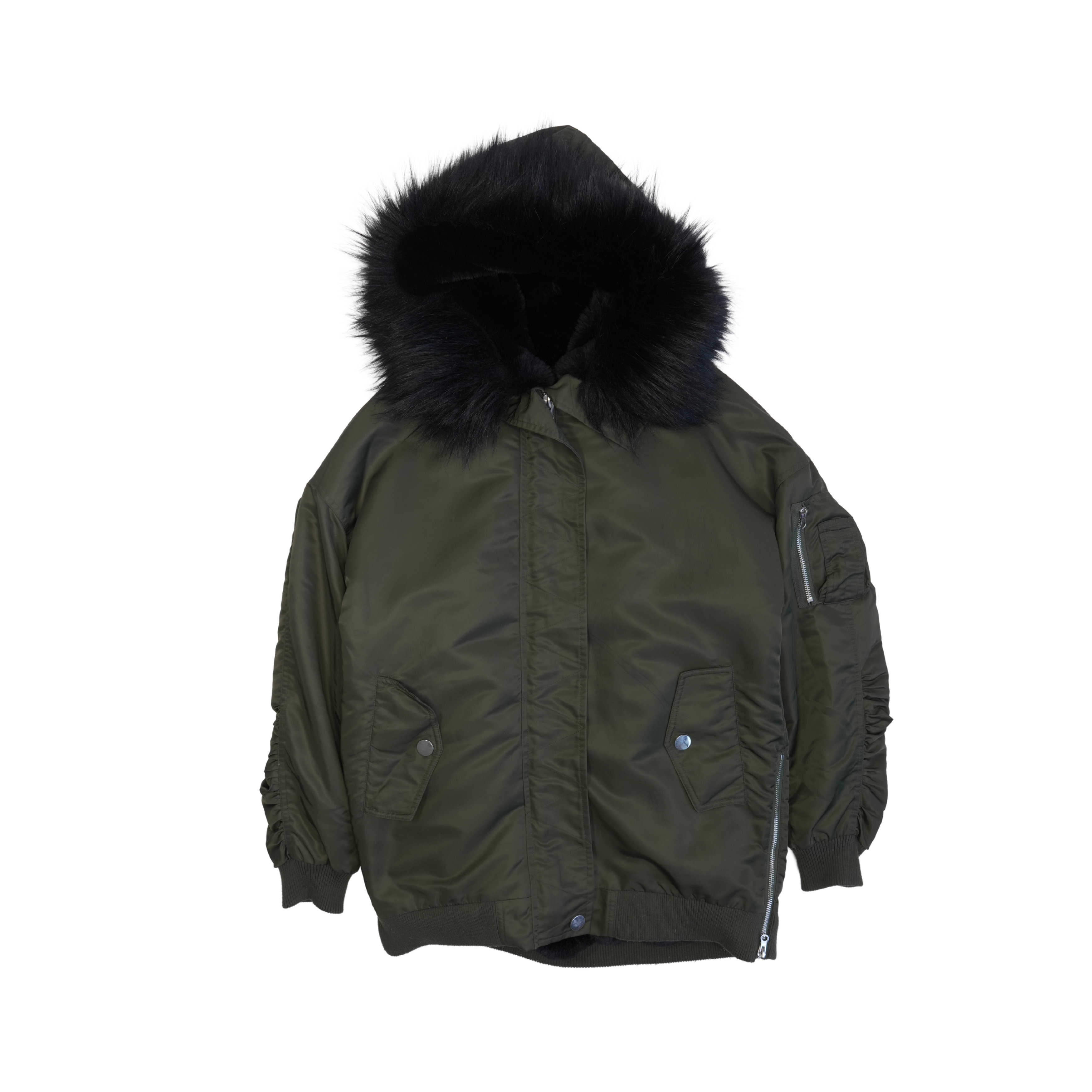 Maje 'Gero' bomber jacket in army green with black faux fur lining in the main body of coat and hood with black trim. Features side snap pockets, shoulder pocket and side vent zipper details in silver hardware.