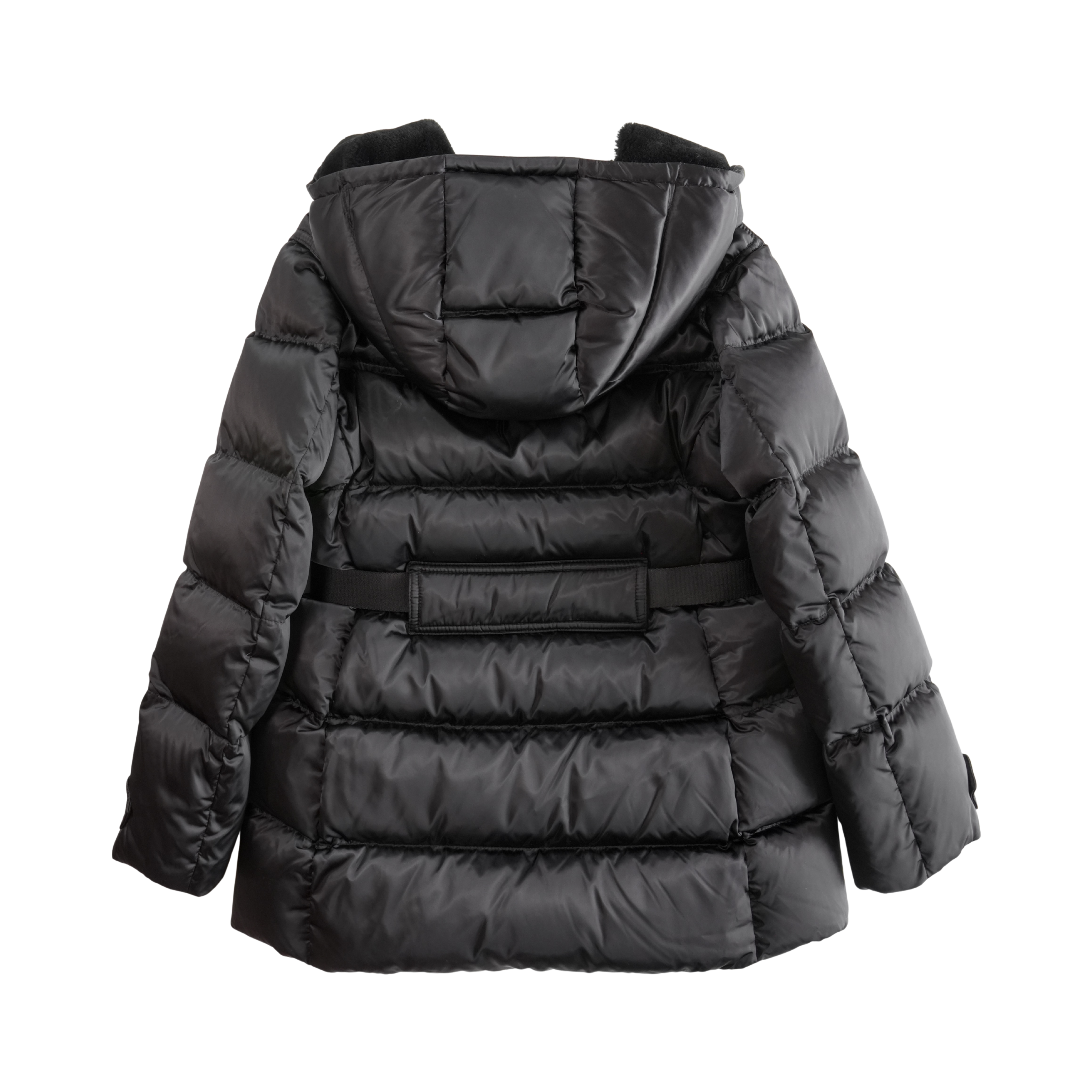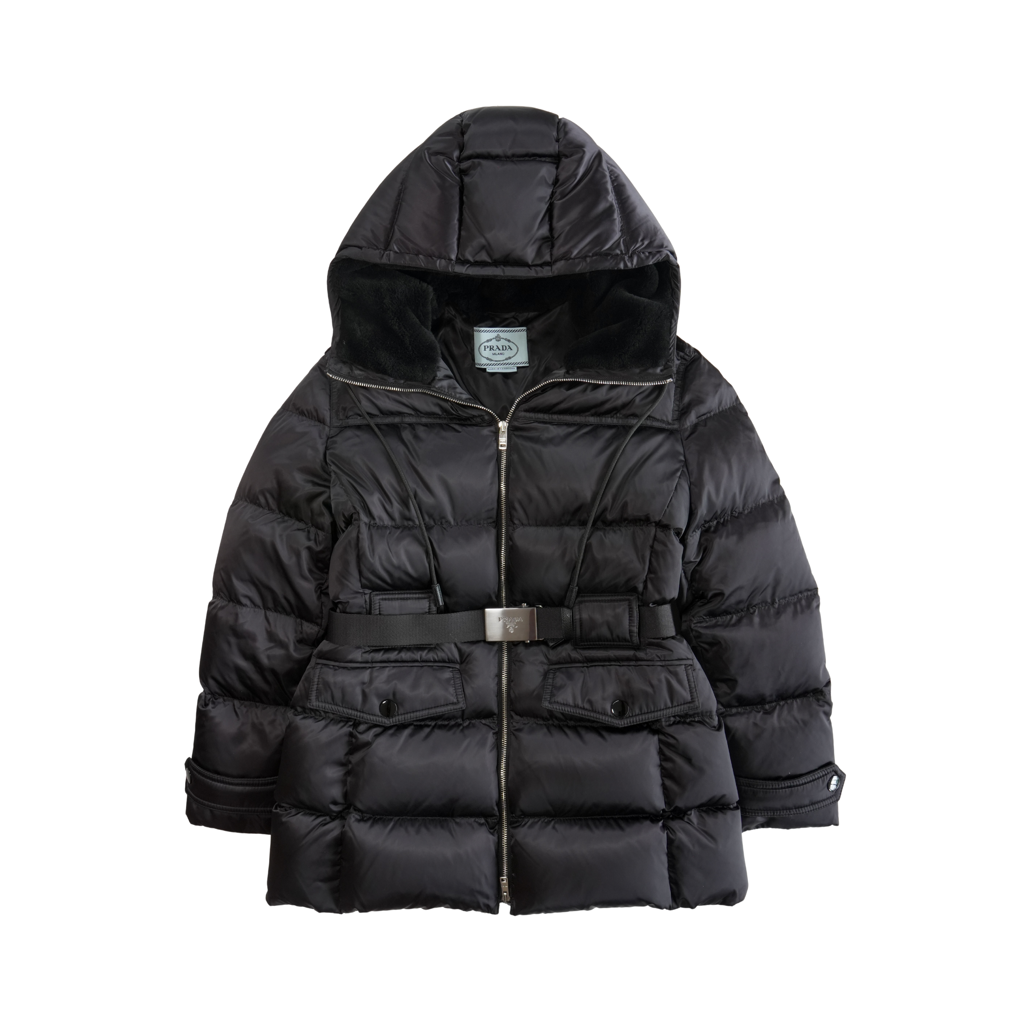 Prada black belted puffer jacket with logo engraved silver buckle, large flap pockets, and a black shearling lined hood. Features a two way zip closure and down fill.