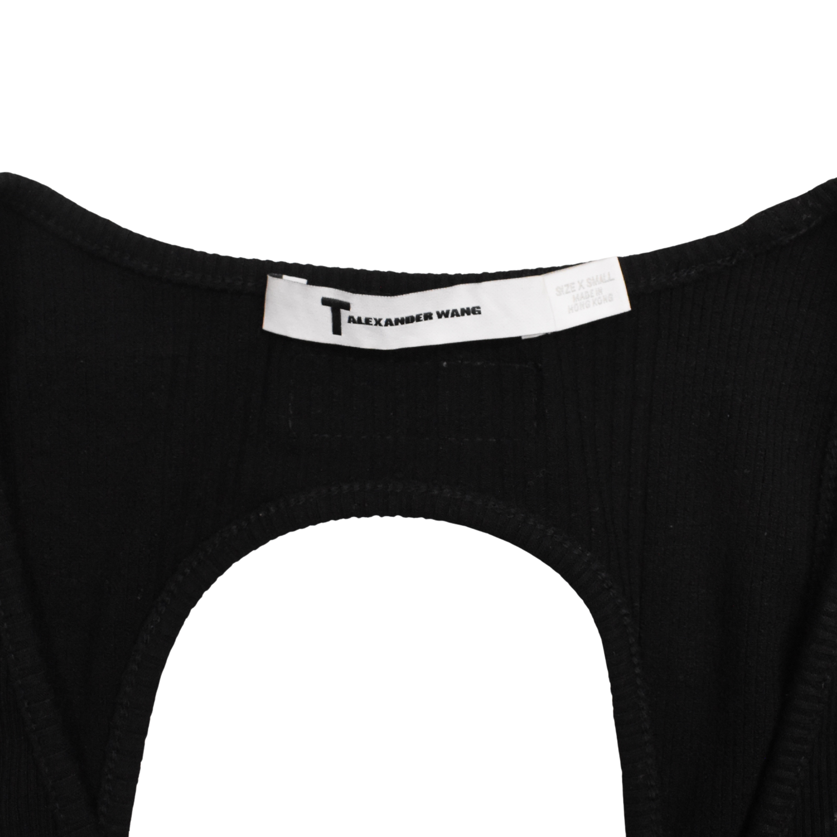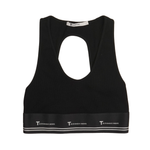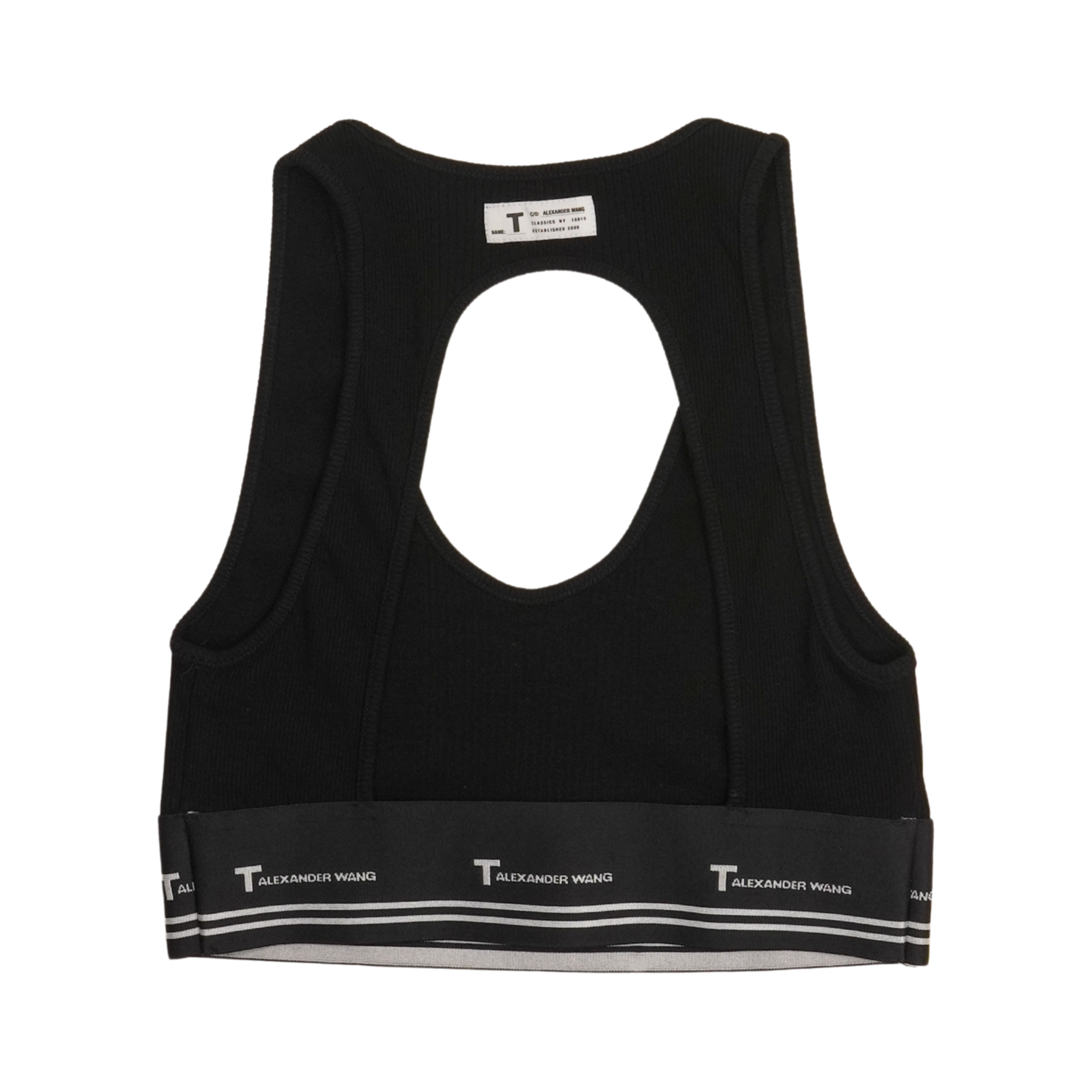 T Alexander Wang black ribbed sports bra with back cutout and monogram logo waistband.